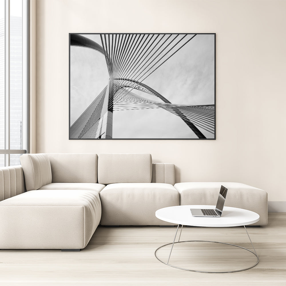 Elevate your home or office with this striking modern architectural wall art. Featuring a captivating monochrome design of a contemporary bridge structure, this artwork is a testament to precision and creativity. Its bold lines and grayscale palette bring sophistication and elegance to any space.