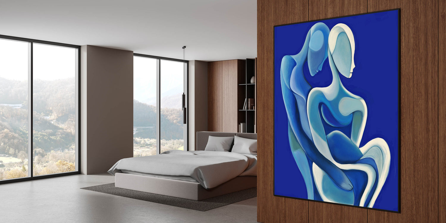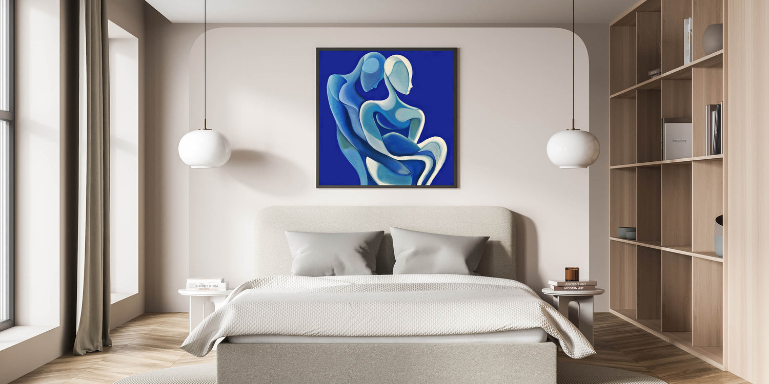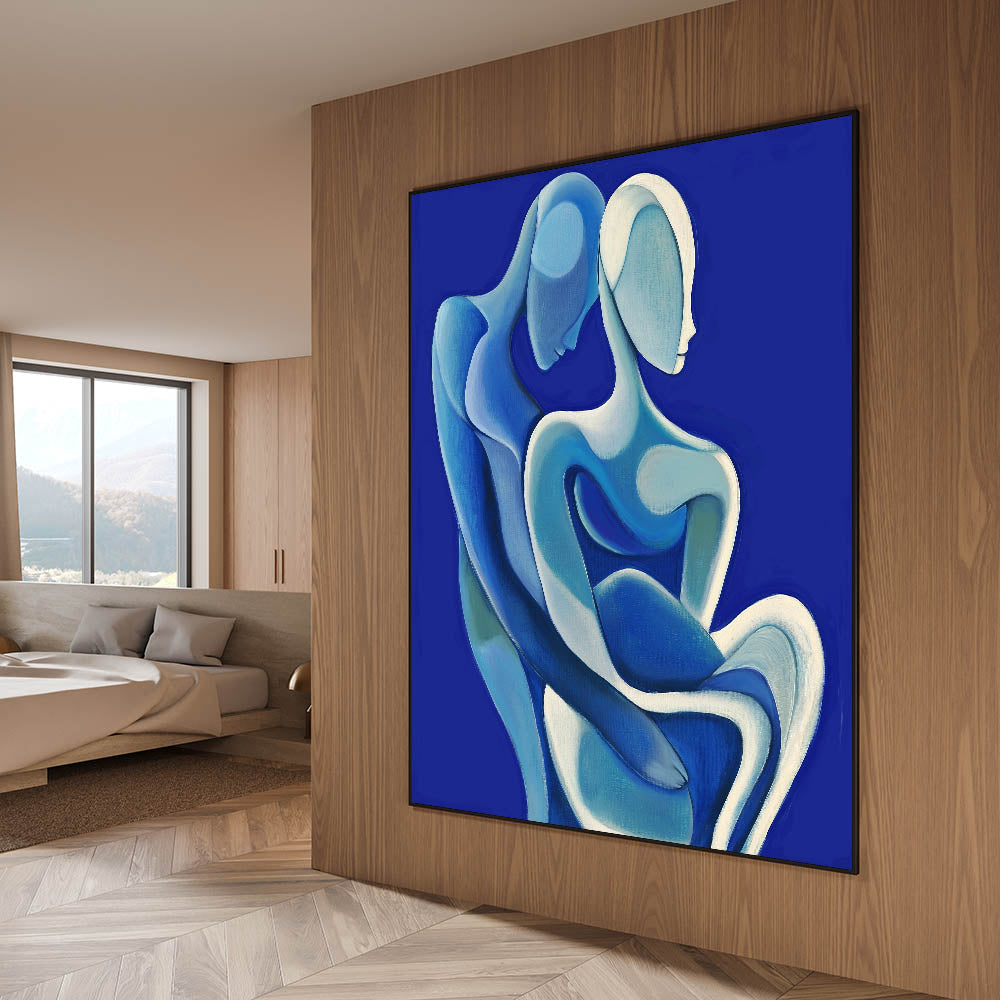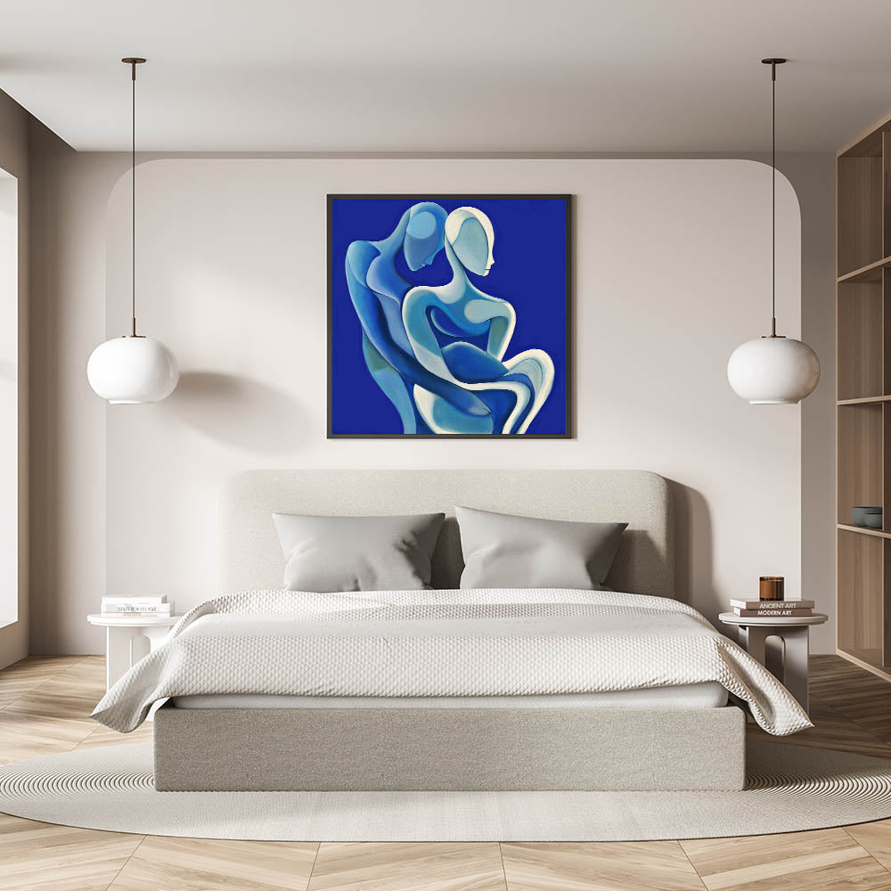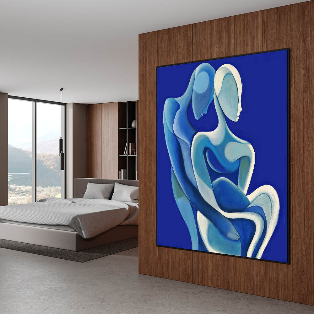 Enhance your bedroom with this customizable bedroom wall art, featuring a beautifully abstract depiction of a couple in an intimate embrace. Rendered in various shades of blue and white, this elegant piece symbolizes love, connection, and serenity, making it a perfect addition to modern bedroom wall decor. The fluid lines and faceless figures add a minimalist yet emotionally powerful touch to any space.