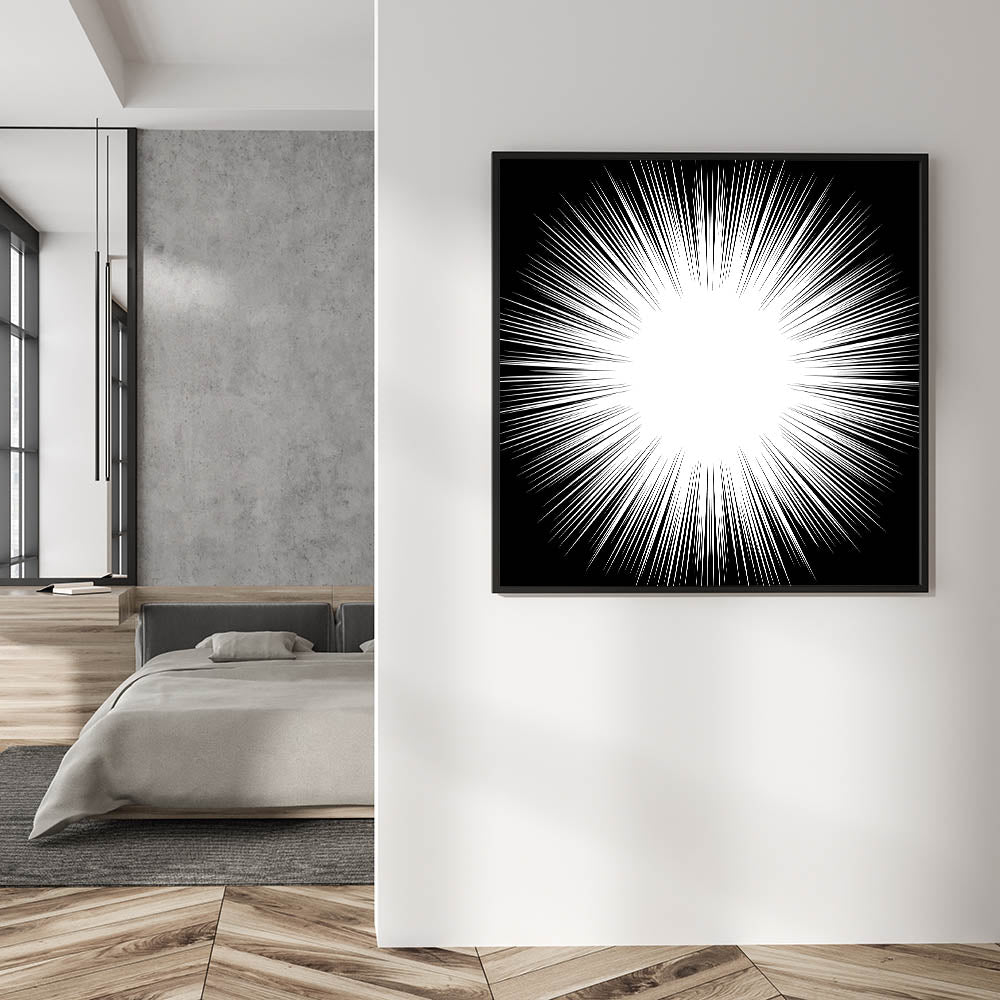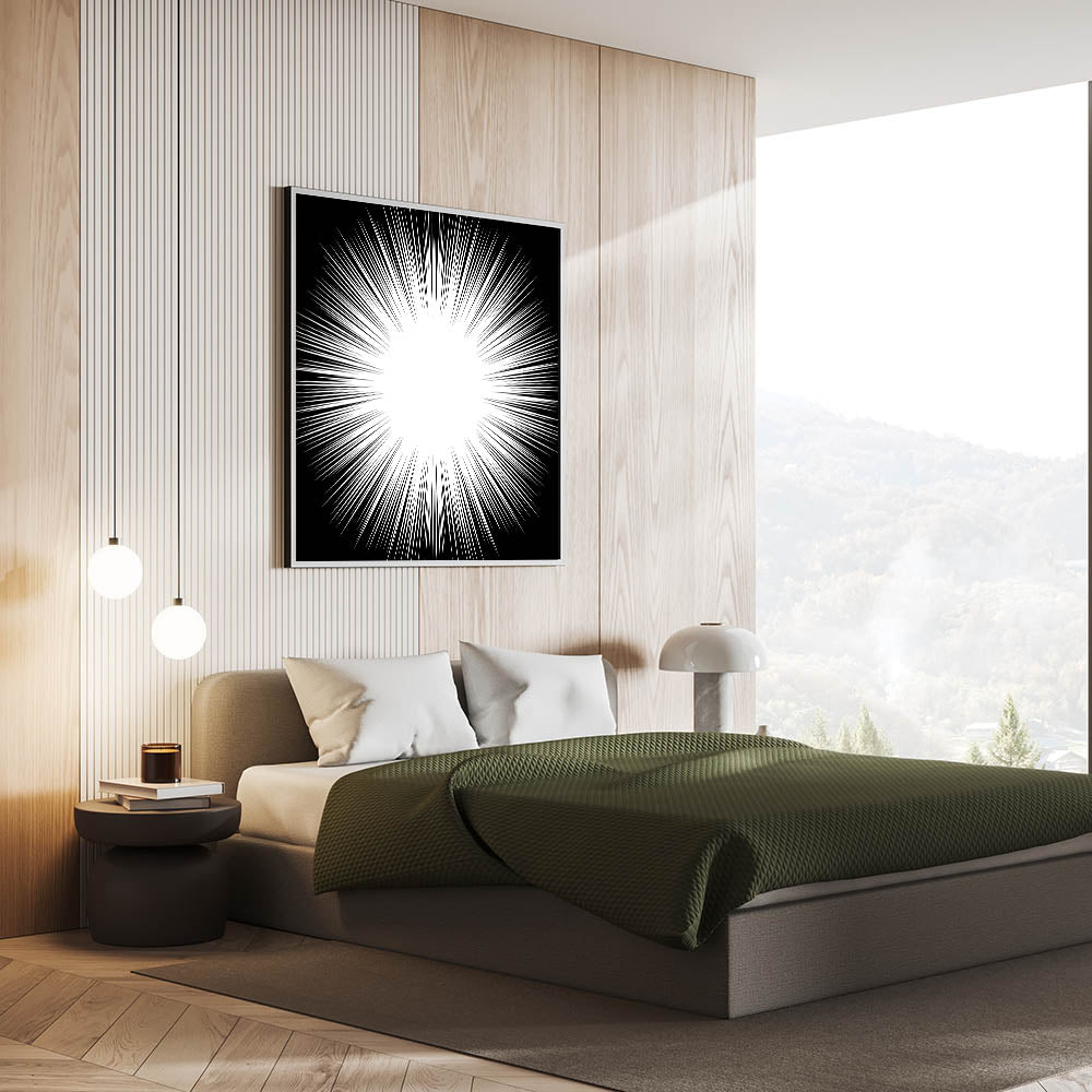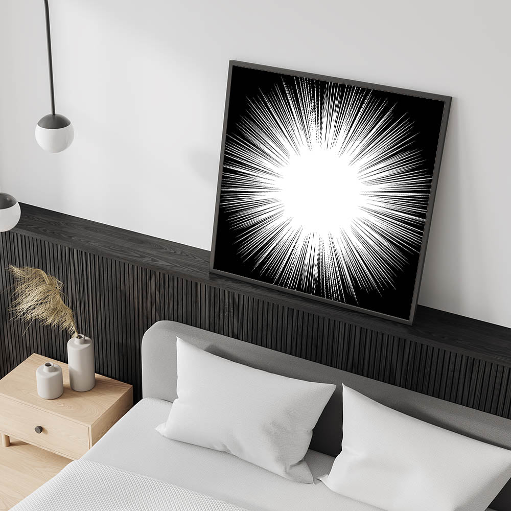 Enhance your bedroom decor with this modern bedroom art, featuring a striking black-and-white burst design. This customizable bedroom wall art is the perfect statement piece, adding depth and contrast to contemporary interiors. Whether you prefer high-quality framed canvas prints or sleek acrylic glass wall art for bedrooms, this design is available in various formats to complement your space.