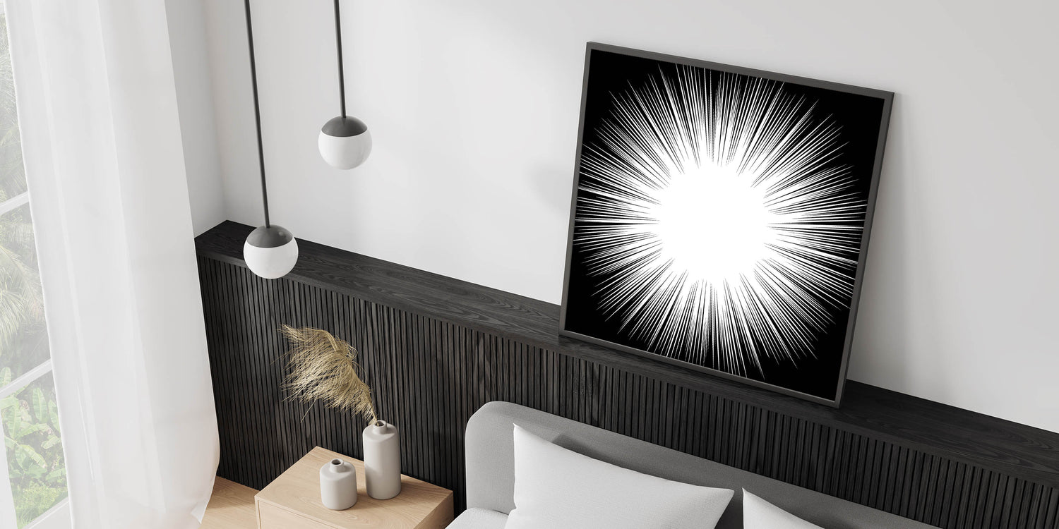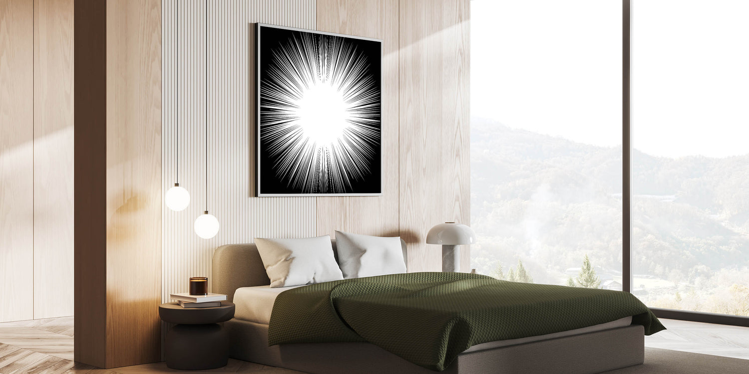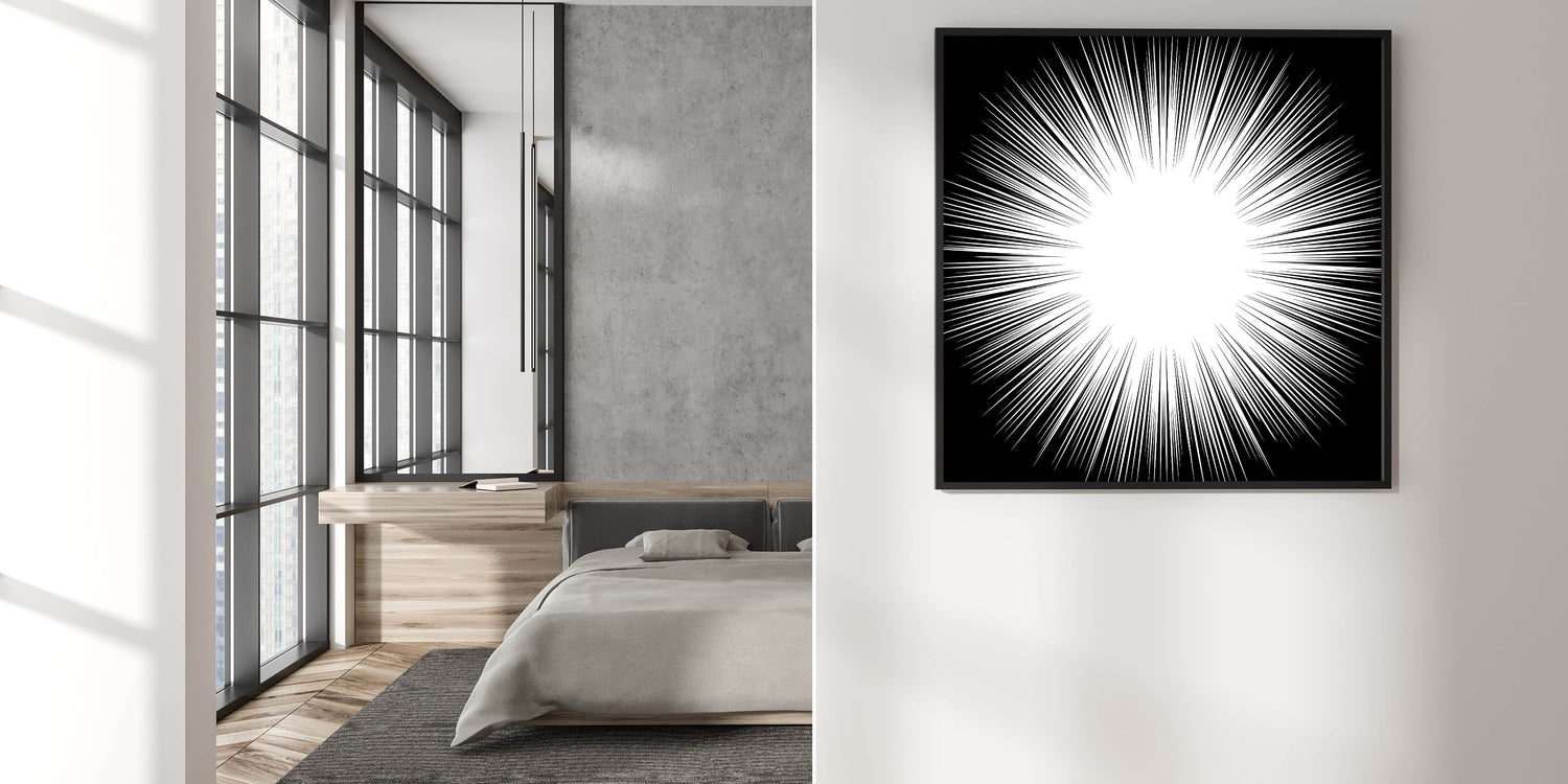 Enhance your bedroom decor with this modern bedroom art, featuring a striking black-and-white burst design. This customizable bedroom wall art is the perfect statement piece, adding depth and contrast to contemporary interiors. Whether you prefer high-quality framed canvas prints or sleek acrylic glass wall art for bedrooms, this design is available in various formats to complement your space.