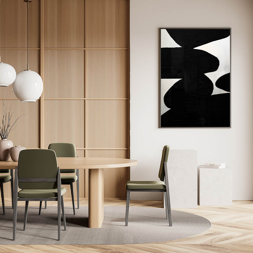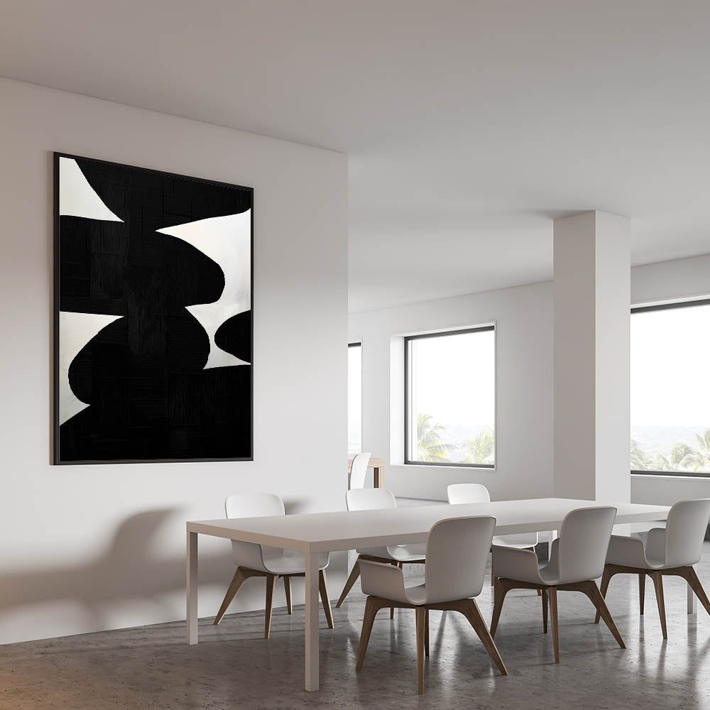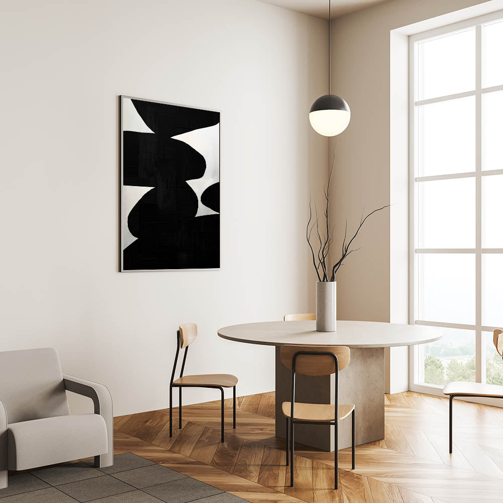 Transform your dining space with this elegant dining room wall art, featuring a striking black and white abstract design. This contemporary piece adds a bold yet sophisticated touch, making it an ideal statement for modern interiors. Whether displayed as a stretched canvas, framed print, or acrylic glass artwork, this design complements both minimalist and artistic dining areas.