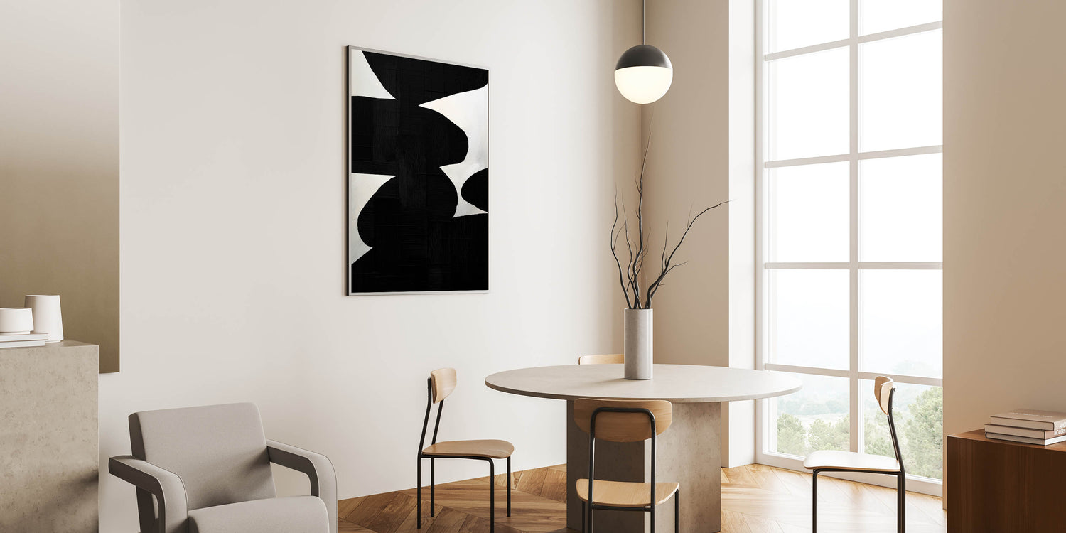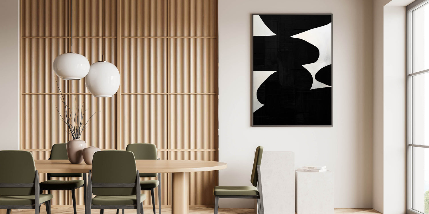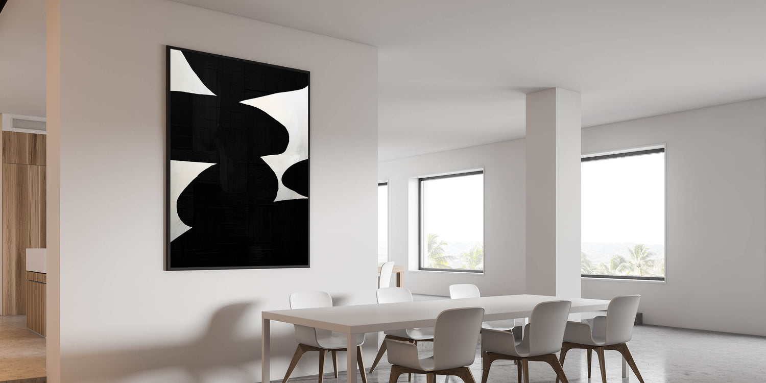 Transform your dining space with this elegant dining room wall art, featuring a striking black and white abstract design. This contemporary piece adds a bold yet sophisticated touch, making it an ideal statement for modern interiors. Whether displayed as a stretched canvas, framed print, or acrylic glass artwork, this design complements both minimalist and artistic dining areas.