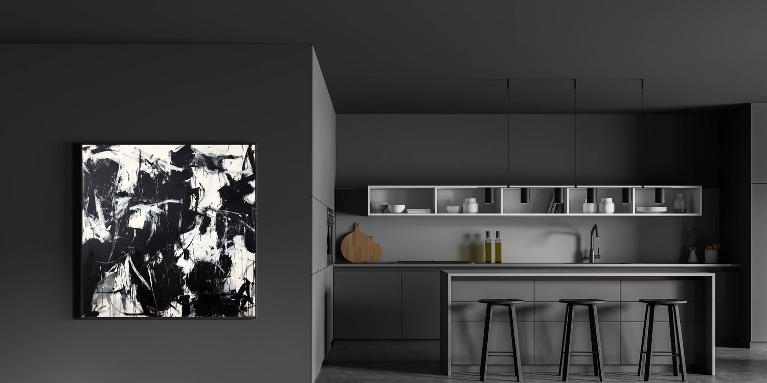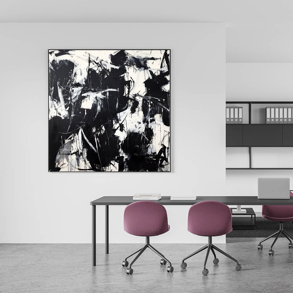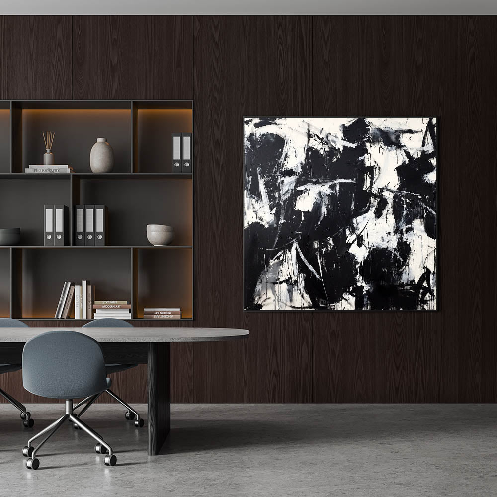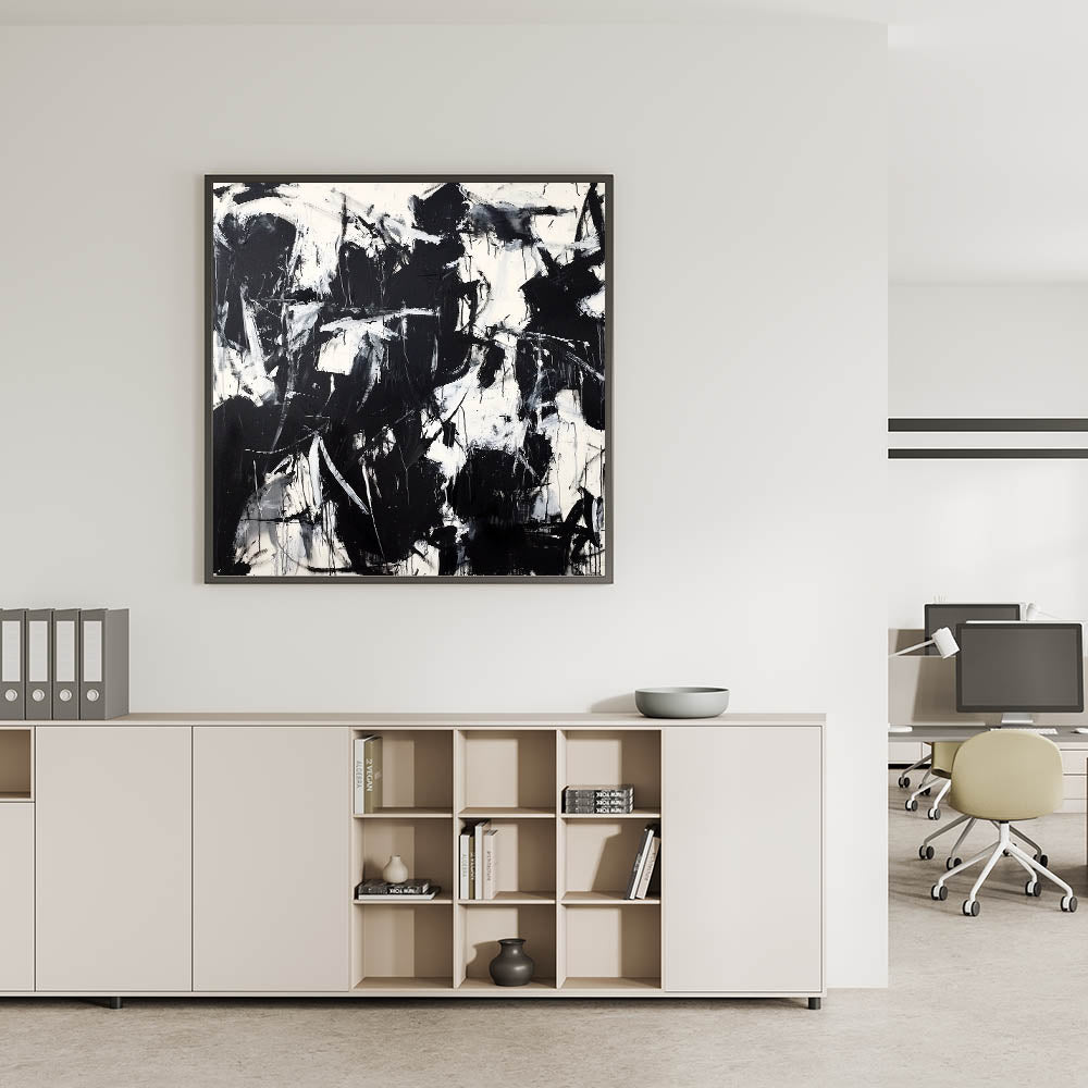 Transform your workspace with this striking Office Wall Art, featuring a black and white abstract composition that exudes energy and sophistication. The bold contrasts and expressive brushwork make this Modern Office Art a perfect statement piece for corporate environments, executive offices, and contemporary workspaces.