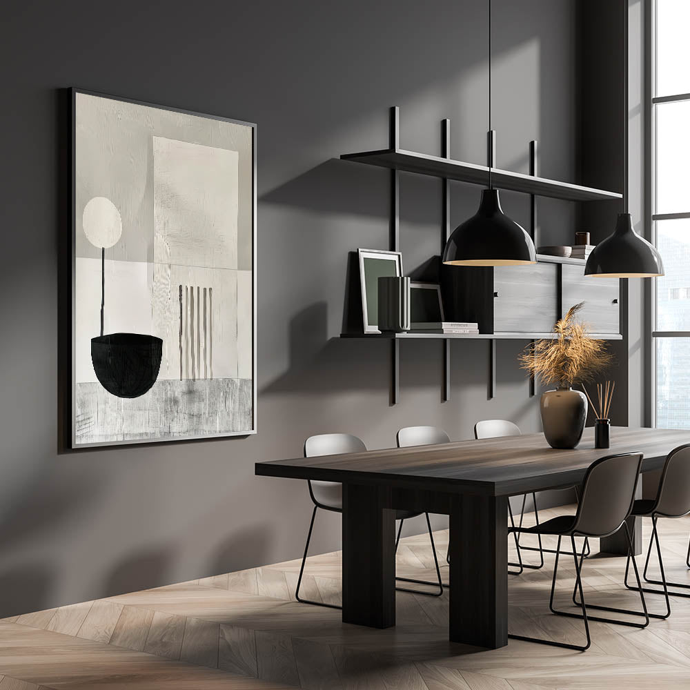 Enhance your dining space with this modern dining area art piece, featuring a striking black-and-white minimalist composition. The geometric forms and clean lines create a sophisticated, contemporary aesthetic, making this elegant dining room wall art an ideal addition to modern, Scandinavian, or industrial-style interiors.