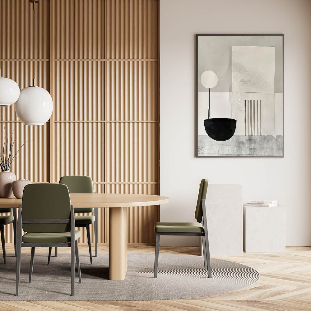 This dining room wall decor brings balance and elegance to any dining area. Whether displayed as a premium rolled paper art print, rolled canvas print for dining areas, or framed dining room print, this piece offers a timeless, modern touch to elevate your space.