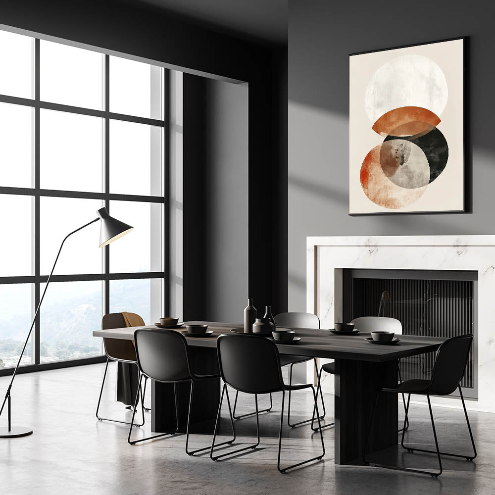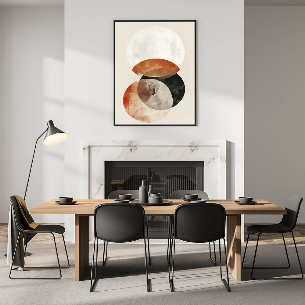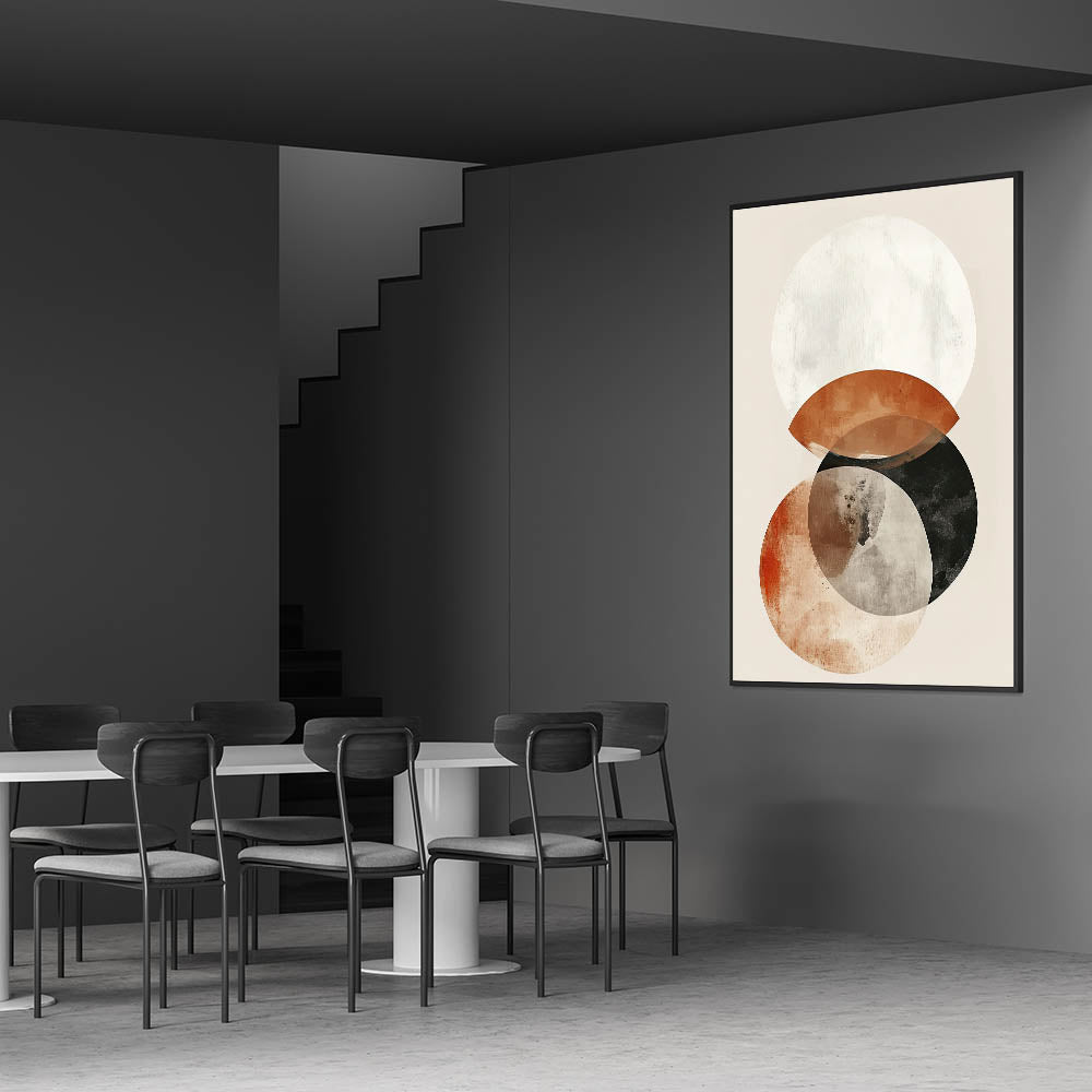 Elevate your dining space with this elegant dining room wall art, featuring a sophisticated blend of geometric abstraction and earthy tones. This contemporary piece seamlessly complements modern dining room aesthetics, adding warmth and character to your space.