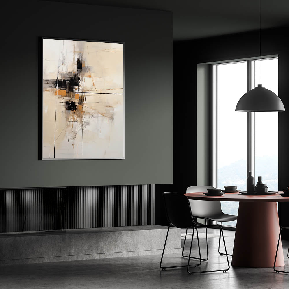 Enhance your dining space with this elegant dining room wall art, designed to complement modern interiors with a sophisticated touch. This contemporary dining art piece showcases a striking interplay of beige, black, and gold, bringing warmth and depth to your walls. Whether you prefer canvas art for dining areas or a sleek acrylic glass art for dining room walls, this piece is available in various premium materials to suit your aesthetic.