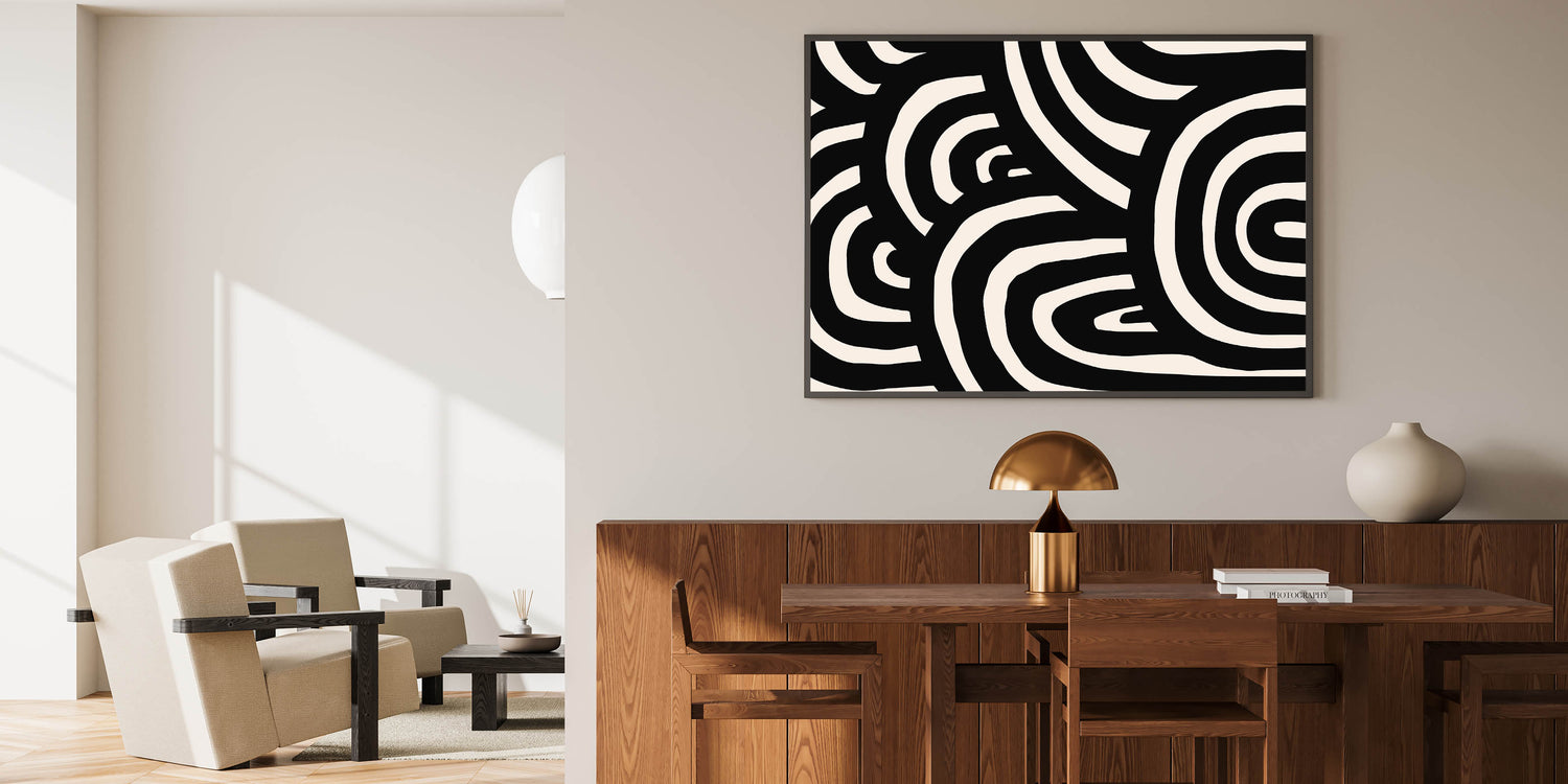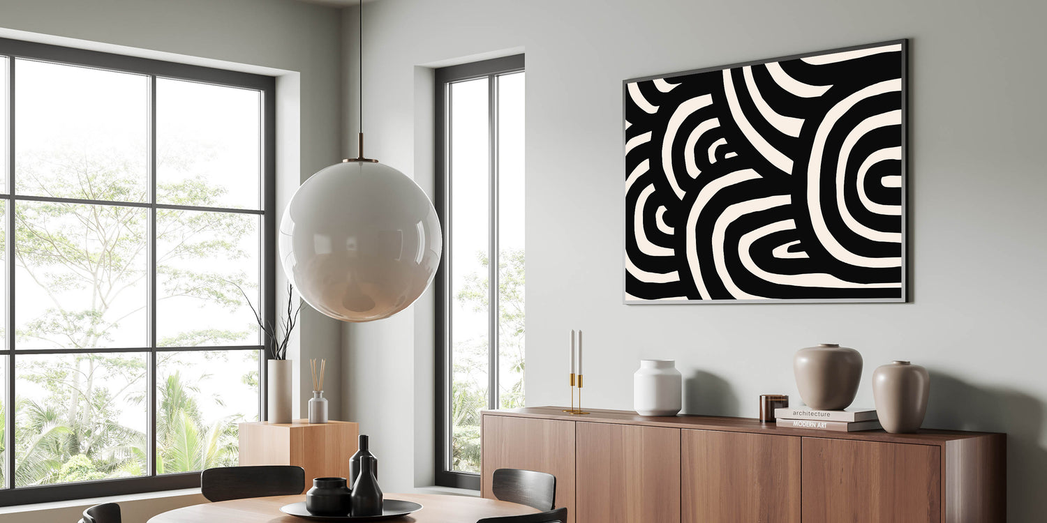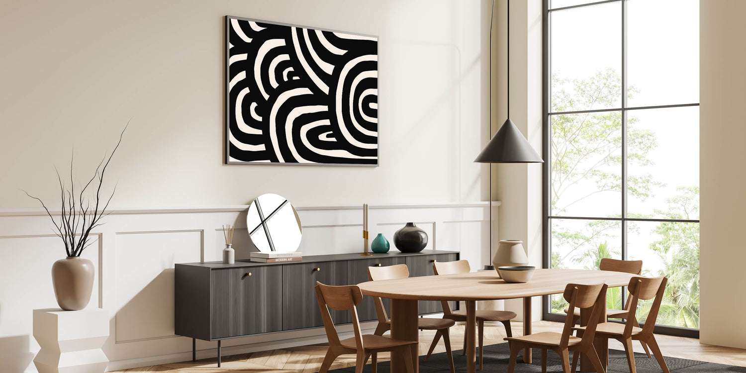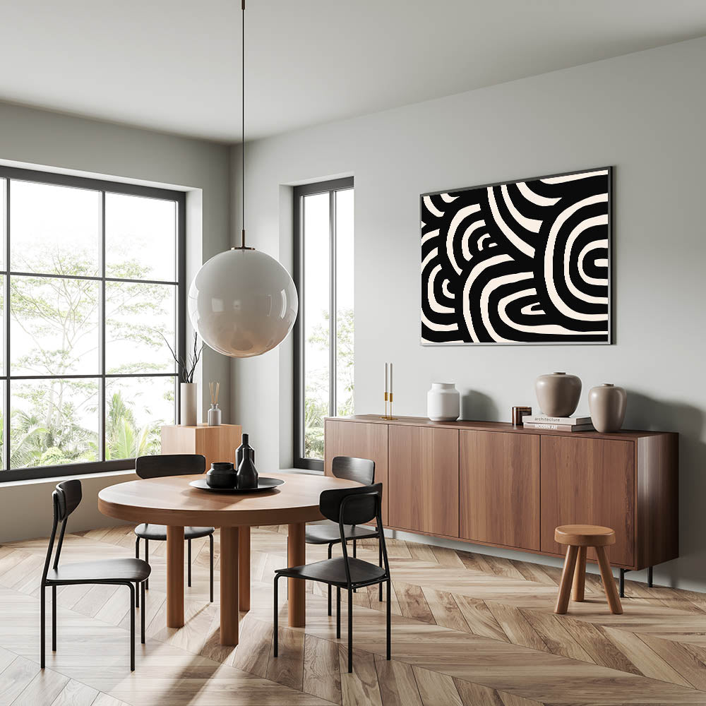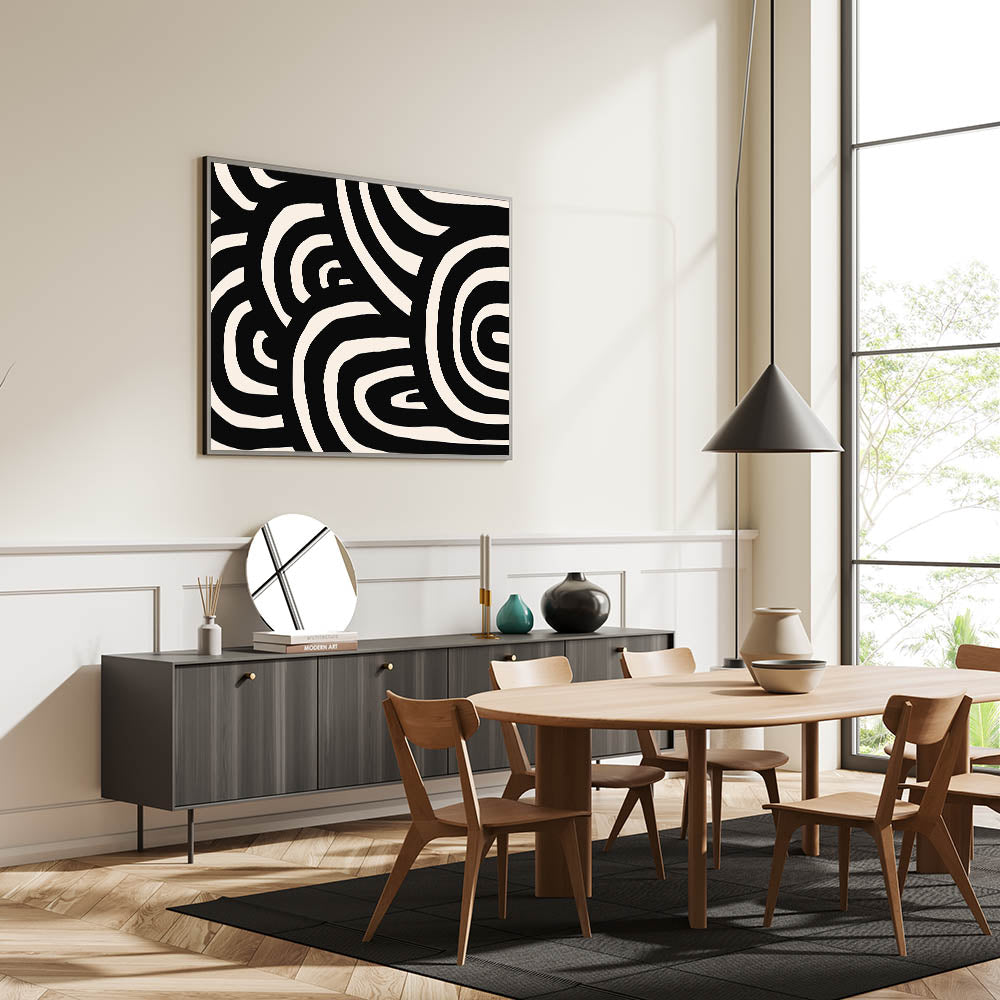 Transform your dining space with modern dining room art that combines bold design with timeless elegance. This black and white abstract canvas print brings a sophisticated yet dynamic feel to your dining area, making it a perfect centerpiece for both contemporary and minimalist interiors. Available in framed dining room prints, acrylic dining room artwork, and canvas art for dining areas, this versatile piece is designed to suit any décor style.