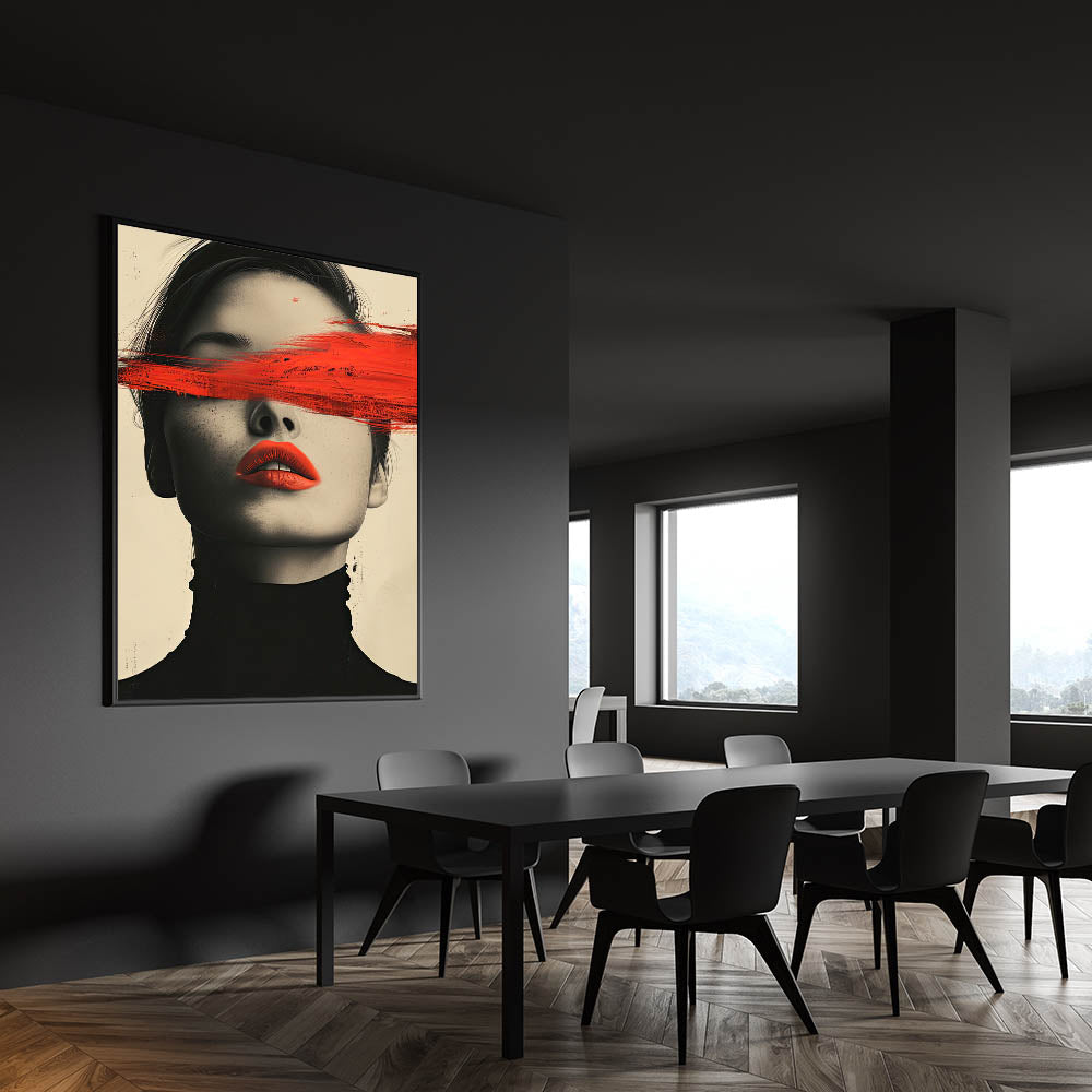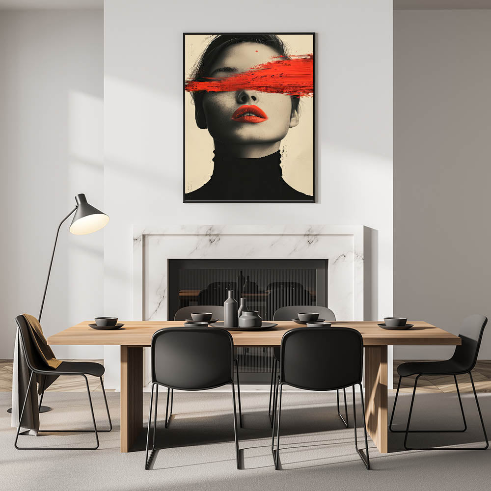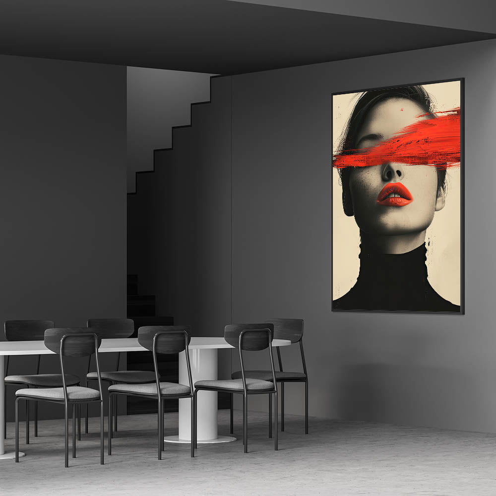 Elevate your dining space with this elegant dining room wall art, featuring a striking abstract portrait with bold red and black elements. The dramatic red brushstroke across the eyes creates a sense of mystery and intrigue, making it a captivating focal point in any modern setting. This high-contrast design blends contemporary art with expressive emotion, perfect for adding a bold statement to your dining area.