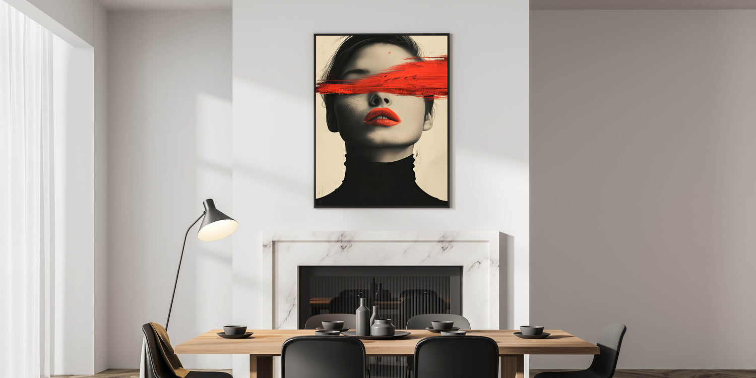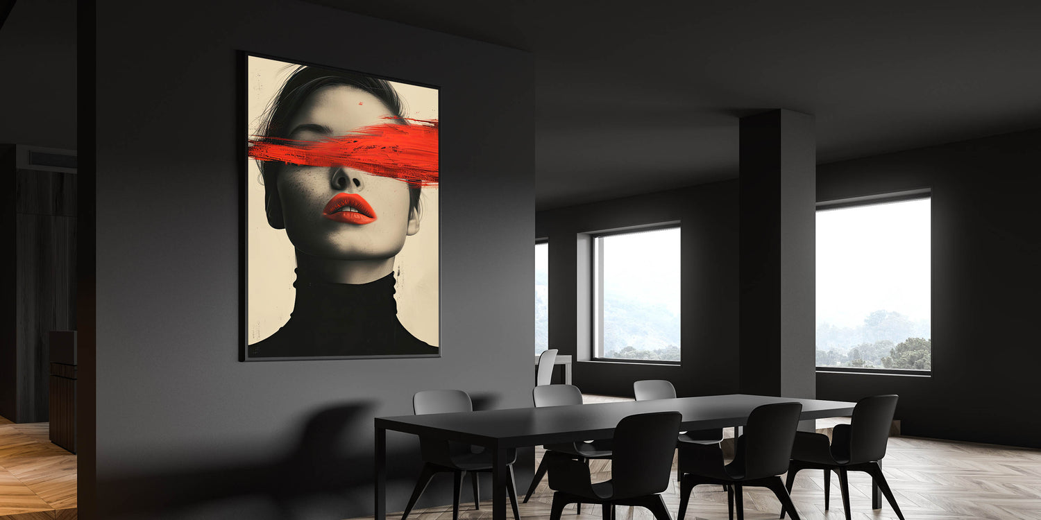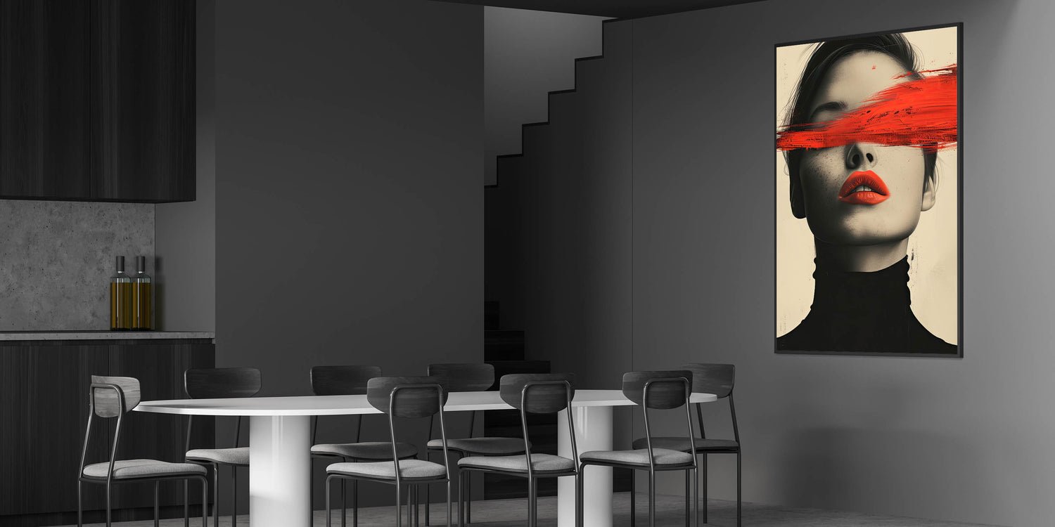 Elevate your dining space with this elegant dining room wall art, featuring a striking abstract portrait with bold red and black elements. The dramatic red brushstroke across the eyes creates a sense of mystery and intrigue, making it a captivating focal point in any modern setting. This high-contrast design blends contemporary art with expressive emotion, perfect for adding a bold statement to your dining area.
