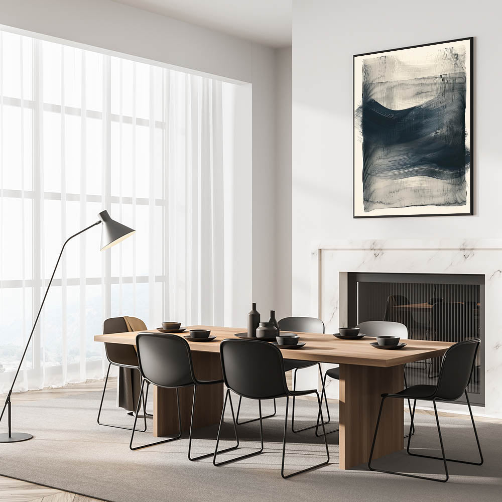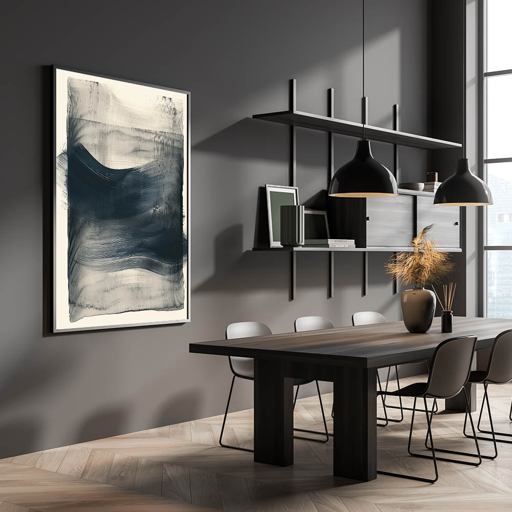 Enhance your dining space with this elegant dining room wall art, featuring a sophisticated blend of black and white tones. The abstract brushstrokes create a contemporary and minimalist appeal, making it a perfect addition to modern interiors. This piece exudes a sense of balance and movement, effortlessly complementing various dining room aesthetics.