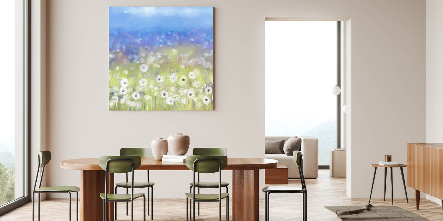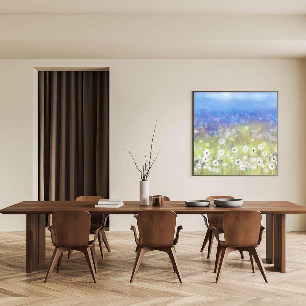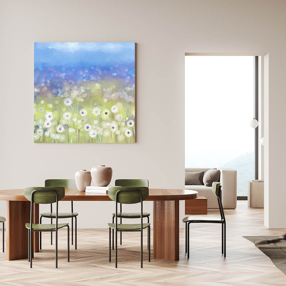 Enhance your dining space with this elegant dining room wall art, featuring a serene field of dandelions against a soft blue sky. This contemporary piece blends soft white florals with subtle hints of gray and blue, creating a tranquil yet stylish atmosphere in your dining area. Whether you're looking for canvas art for the dining area or framed dining room prints, this design is available in multiple high-quality formats.