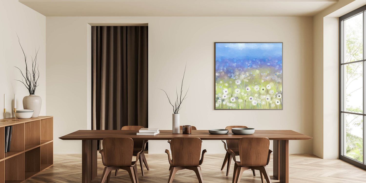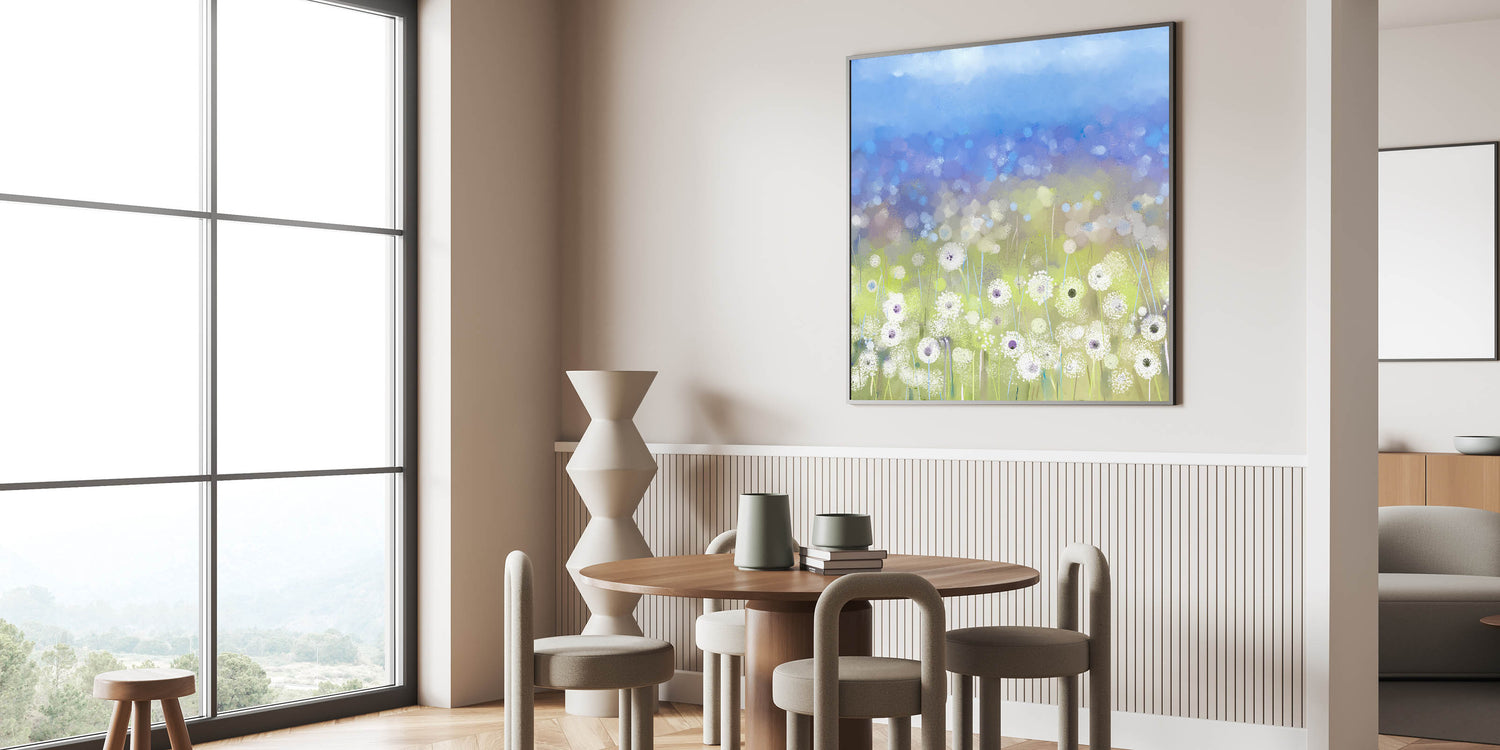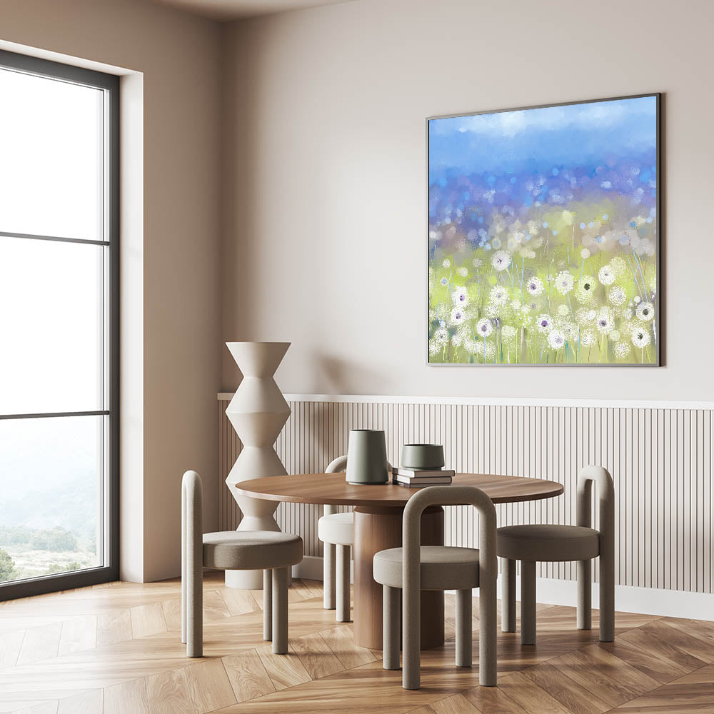 Enhance your dining space with this elegant dining room wall art, featuring a serene field of dandelions against a soft blue sky. This contemporary piece blends soft white florals with subtle hints of gray and blue, creating a tranquil yet stylish atmosphere in your dining area. Whether you're looking for canvas art for the dining area or framed dining room prints, this design is available in multiple high-quality formats.