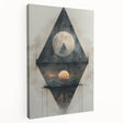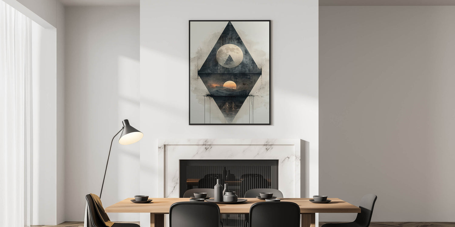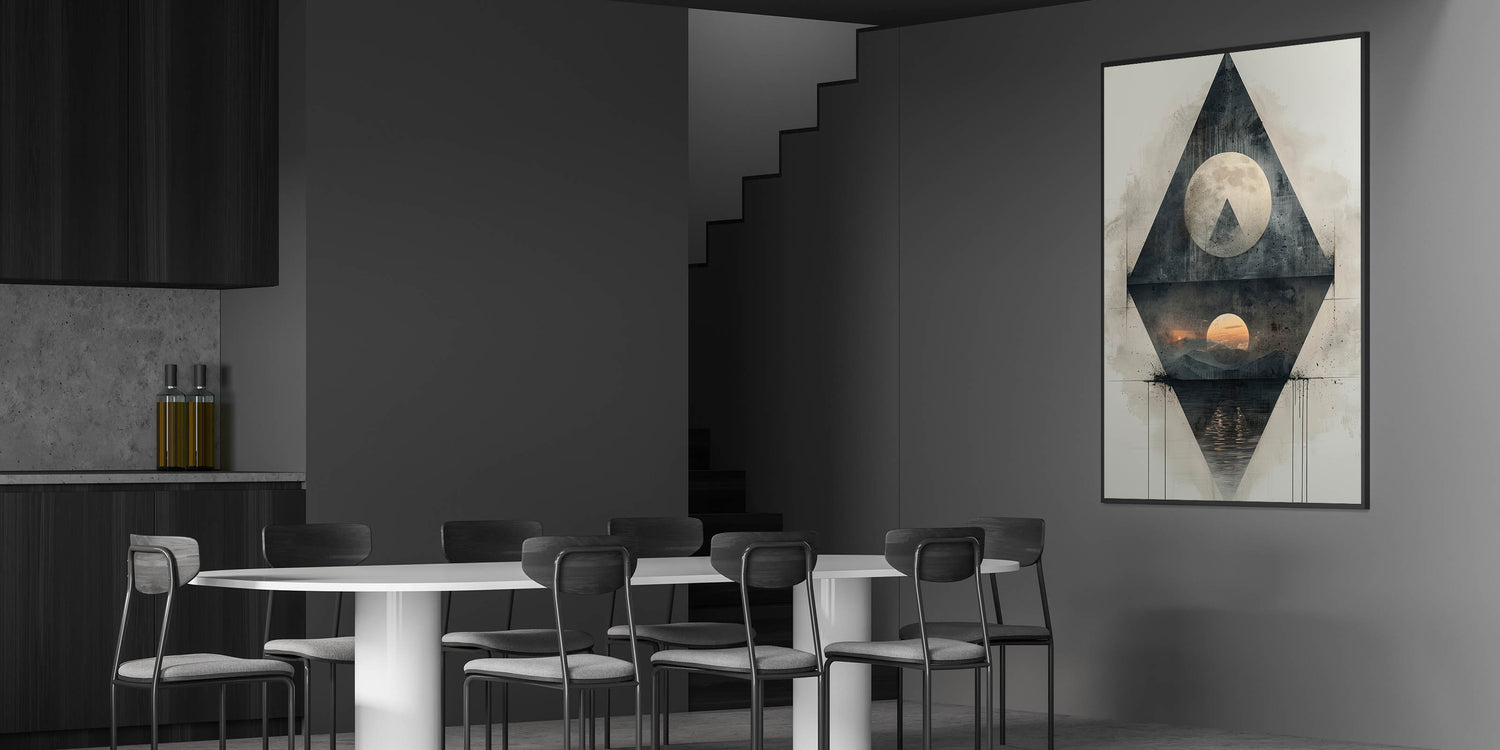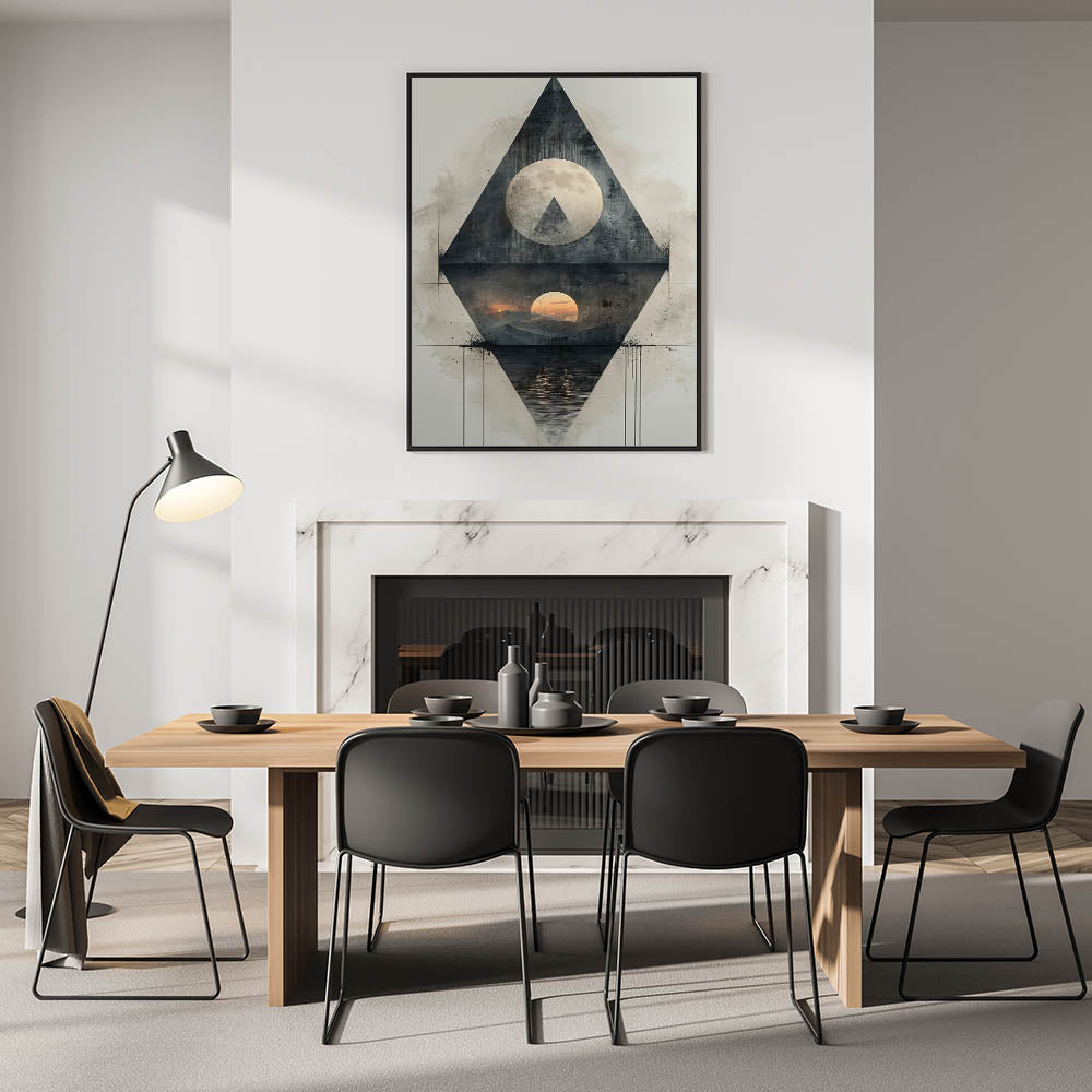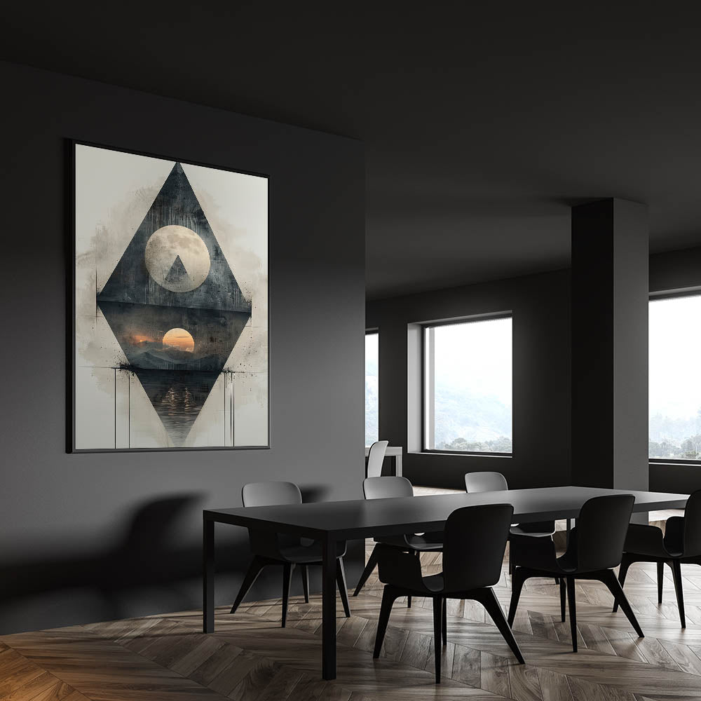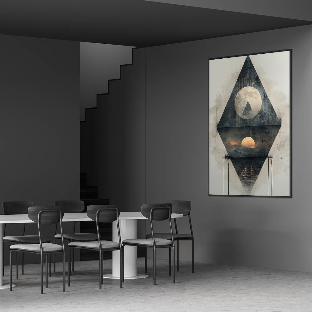 Enhance your dining space with this elegant dining room wall art, featuring a captivating geometric design. This modern artwork combines high-quality canvas art for dining rooms with a sophisticated mix of abstract shapes and celestial elements, creating a mesmerizing focal point for your space. The blend of dark gray, black, and subtle sunset hues adds a unique contrast, making it a perfect statement piece.