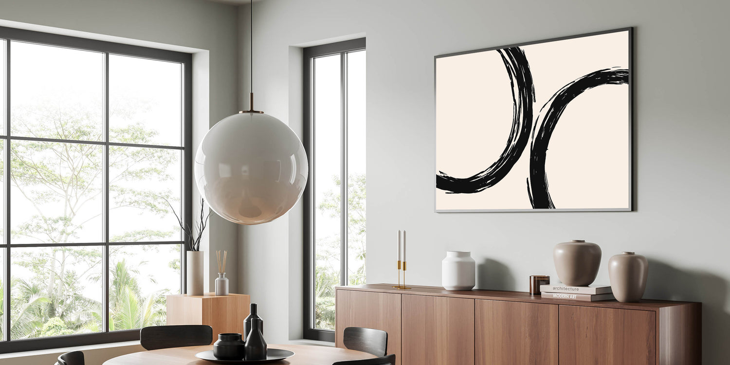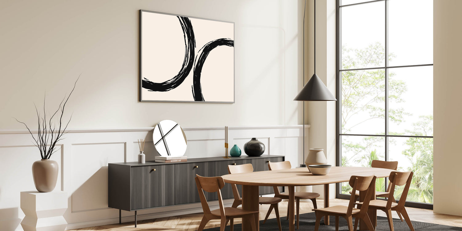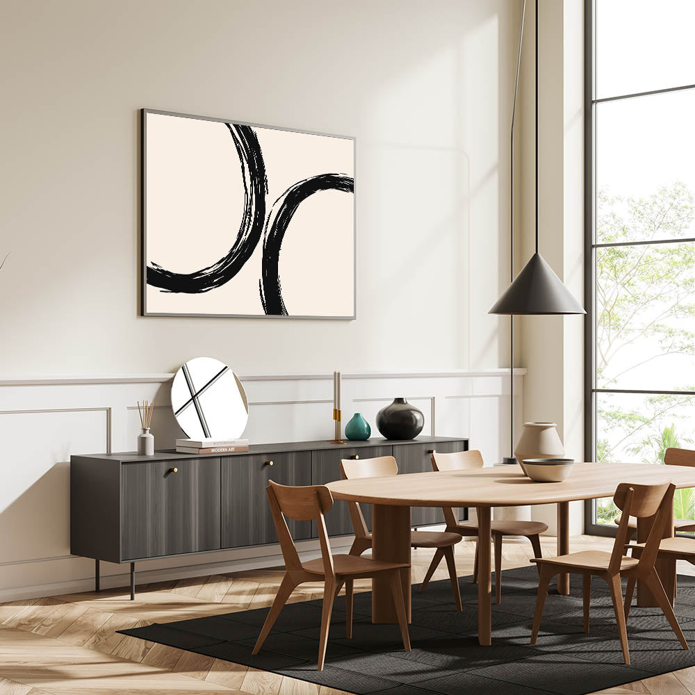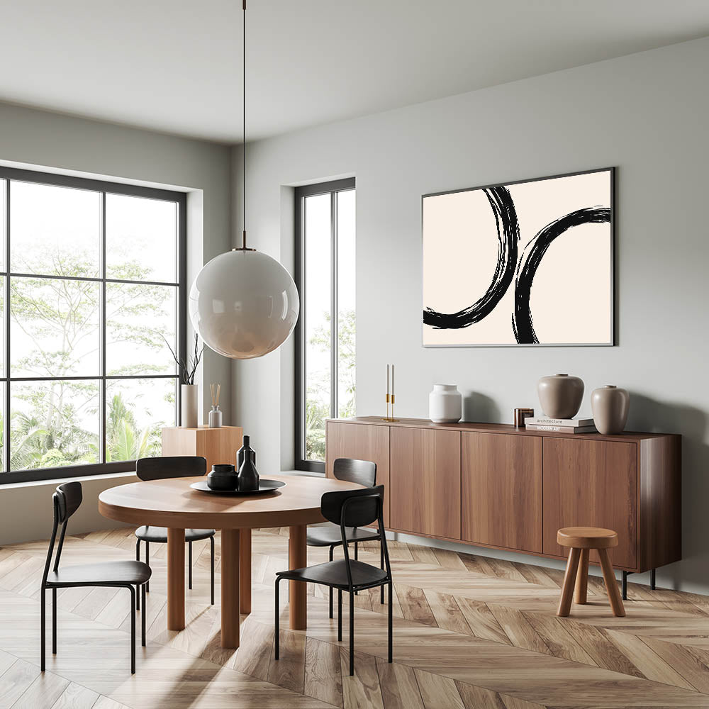 Create a bold statement in your dining space with this modern dining room art, featuring a minimalist black ink abstract design. Inspired by traditional brushstroke techniques, this artwork combines fluid movement with a contemporary aesthetic, making it a striking focal point for modern and industrial interiors. The contrast between deep black strokes and the soft beige background enhances its artistic depth.