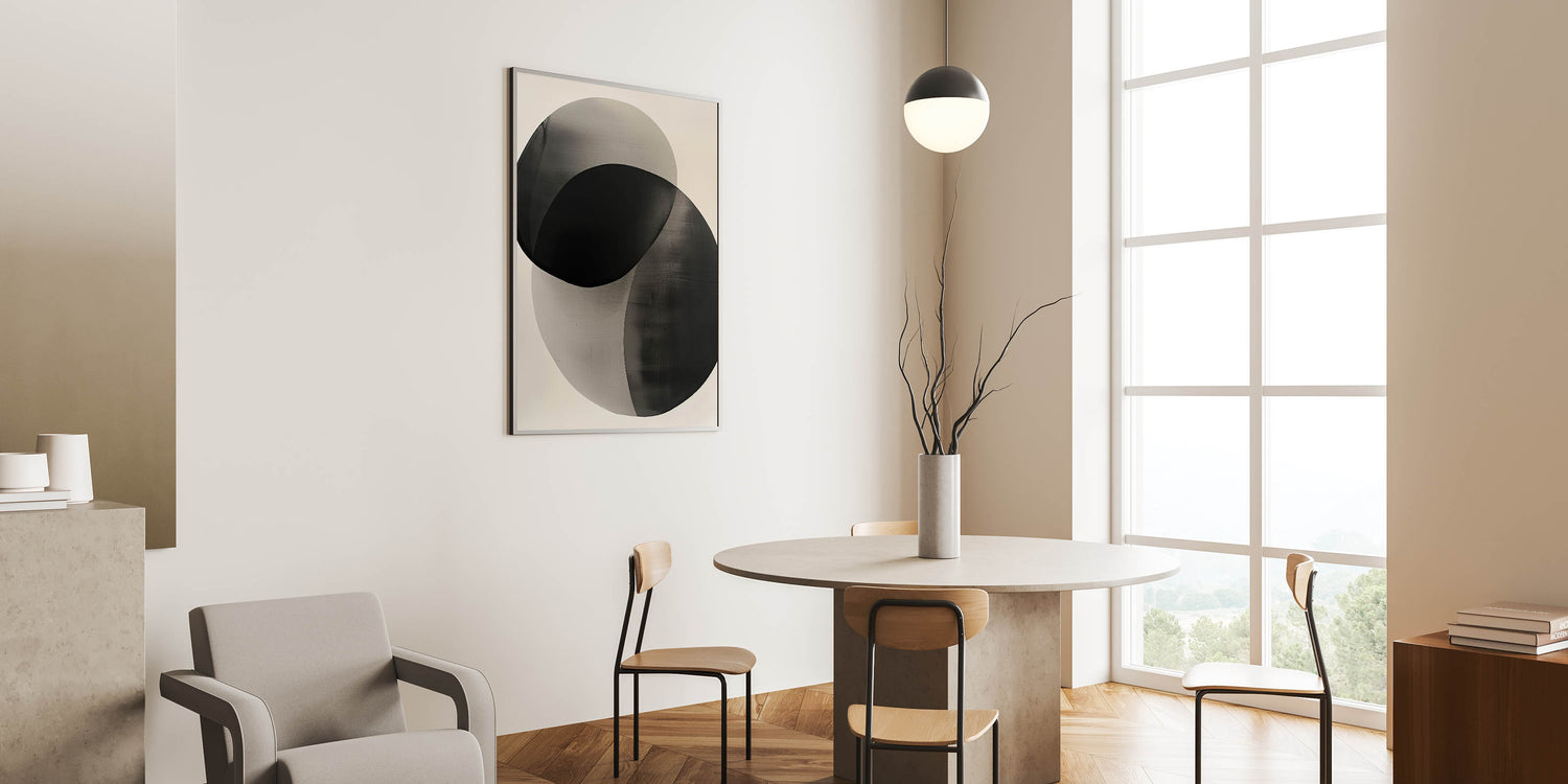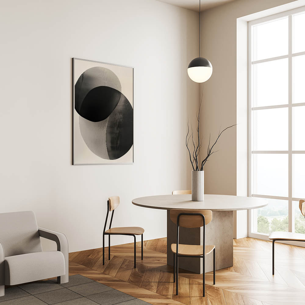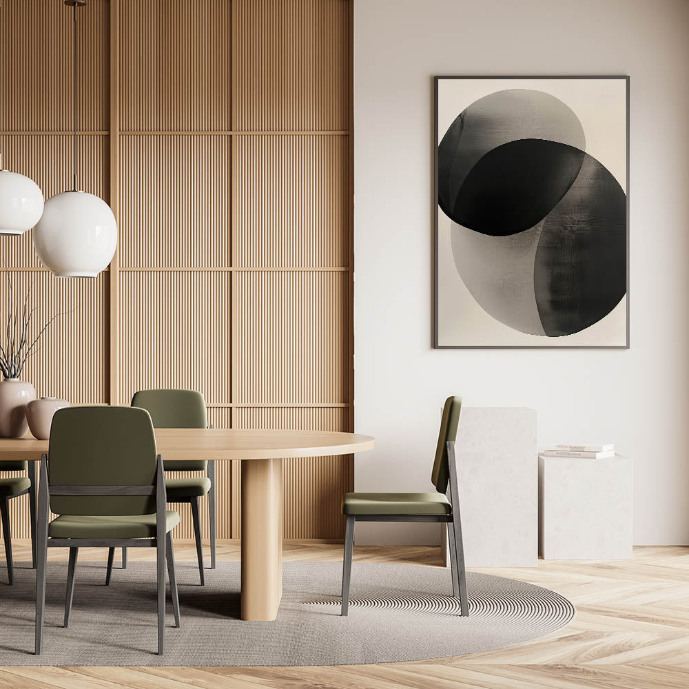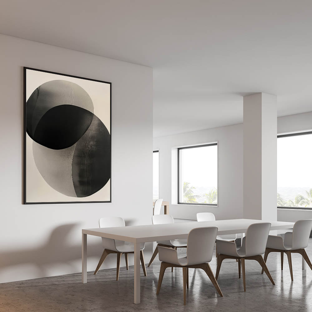 Enhance your dining space with this modern dining room wall art, featuring a sophisticated black and gray geometric composition. This elegant dining room wall art embodies minimalism and artistic balance with its layered circular forms and monochrome tones, making it a versatile accent piece for contemporary and industrial dining areas.