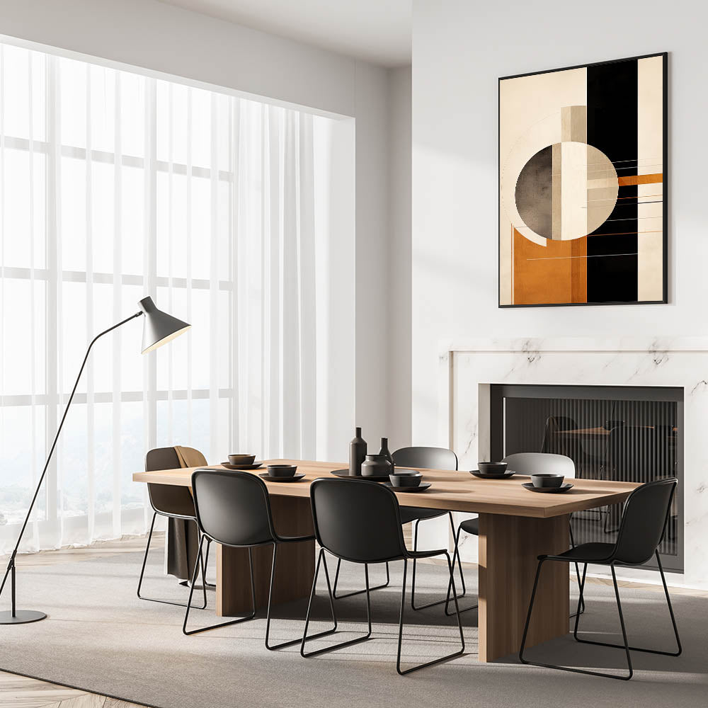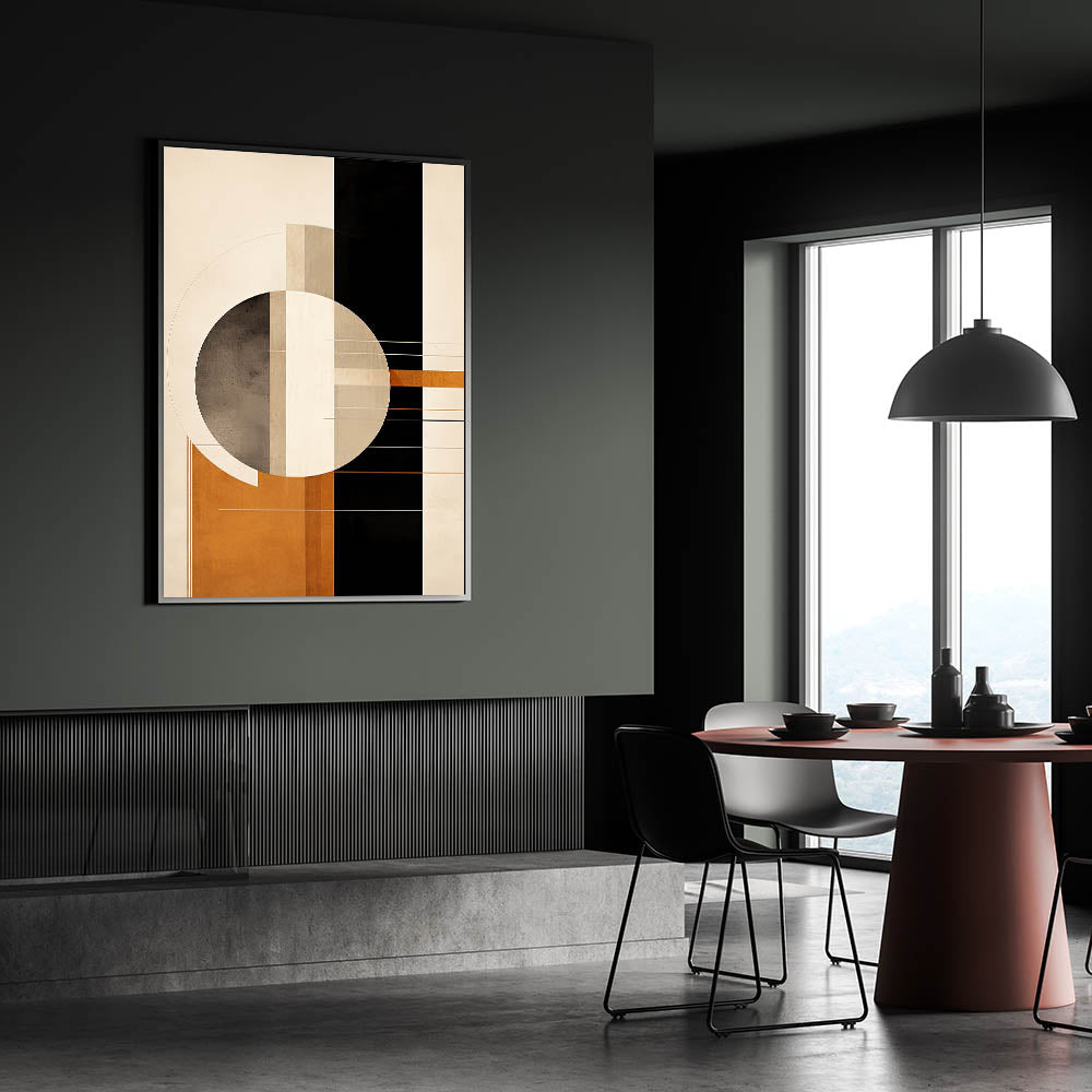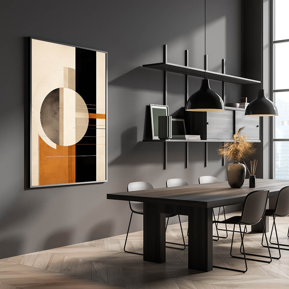 Transform your dining space with this modern dining room art, featuring a sophisticated abstract geometric design in earthy tones. The combination of black, beige, and orange creates a bold yet harmonious composition, making it the perfect dining room wall decor for contemporary homes.