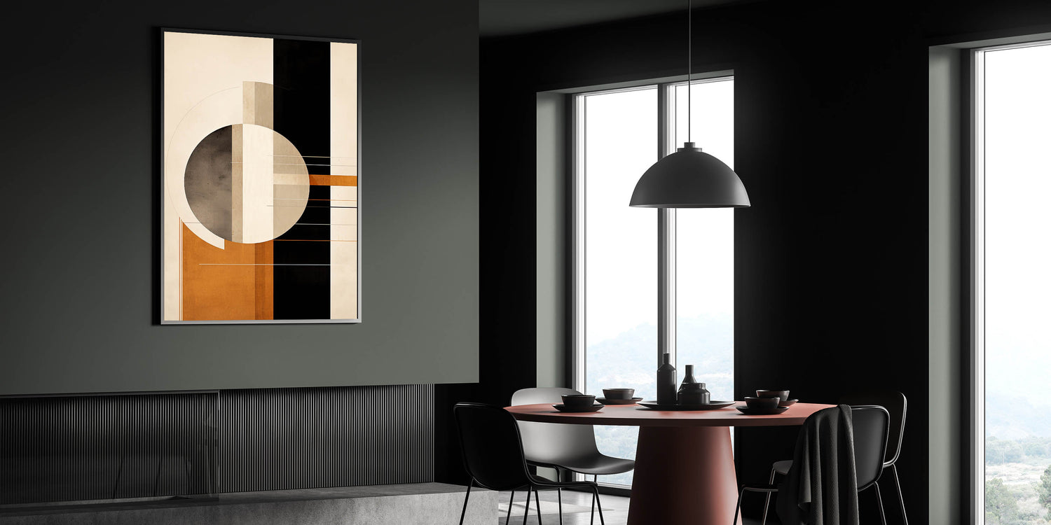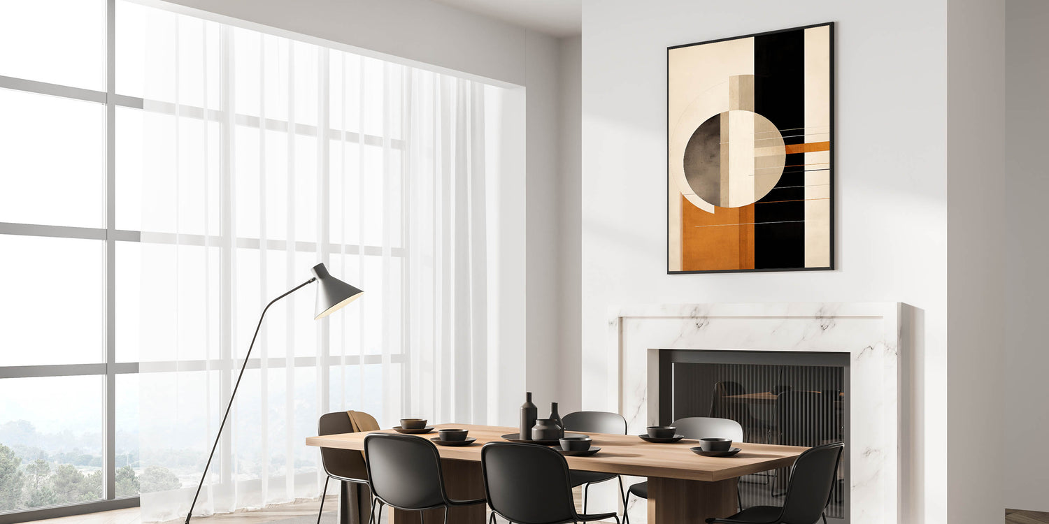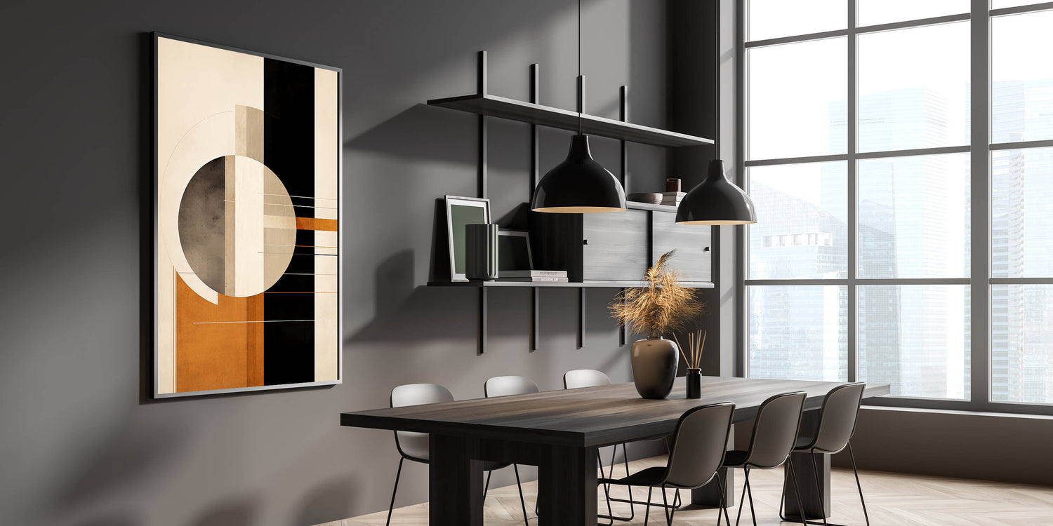 Transform your dining space with this modern dining room art, featuring a sophisticated abstract geometric design in earthy tones. The combination of black, beige, and orange creates a bold yet harmonious composition, making it the perfect dining room wall decor for contemporary homes.