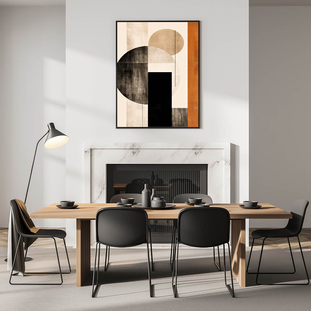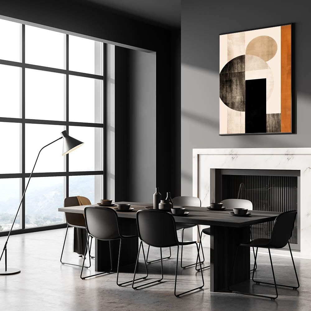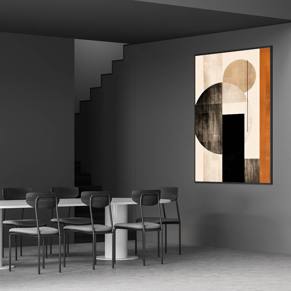 Enhance your dining space with this modern dining room wall art, featuring a striking geometric composition in black, beige, and orange tones. This contemporary piece blends abstract shapes with a minimalist aesthetic, making it the perfect focal point for any dining room wall decor.