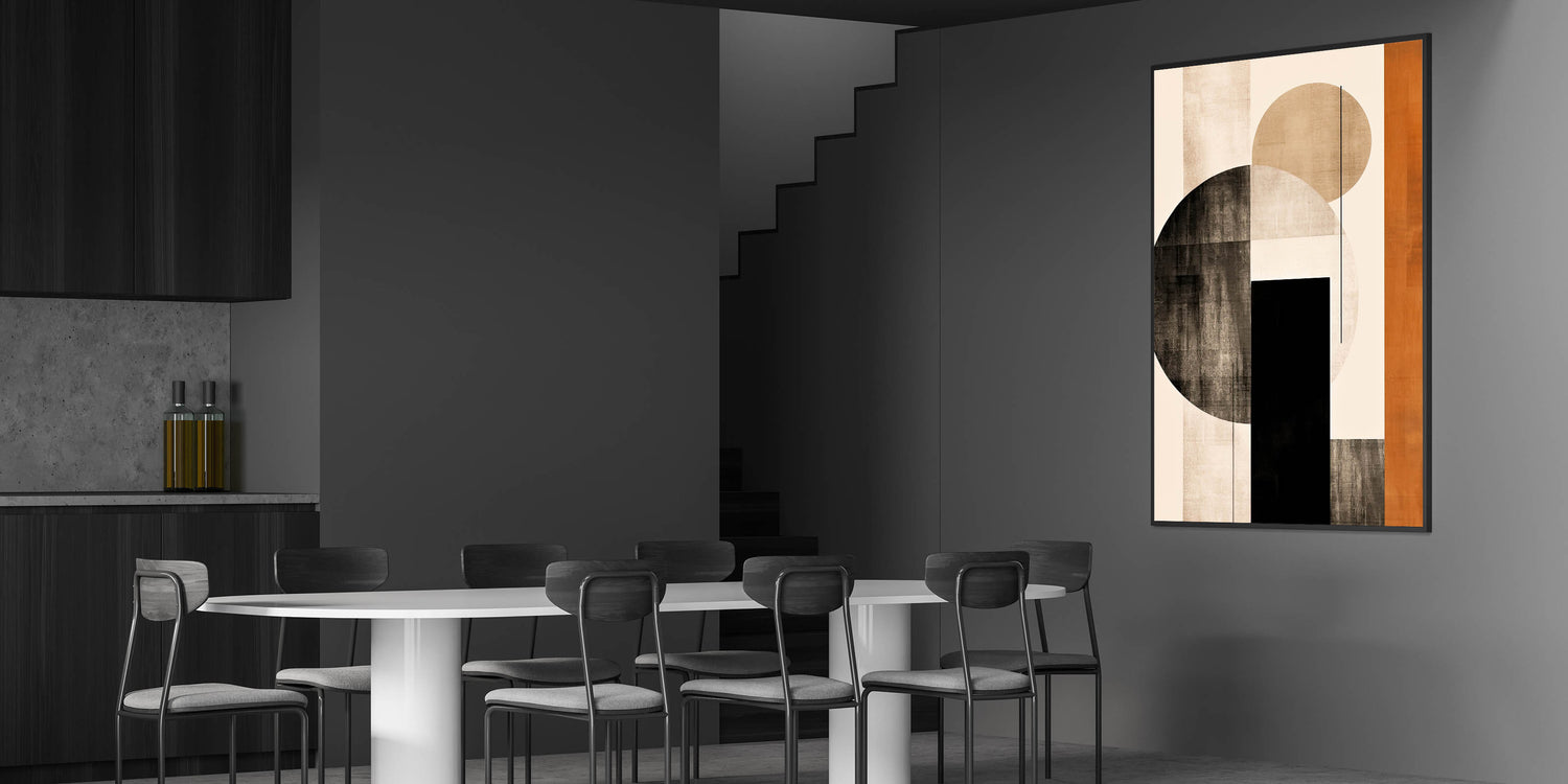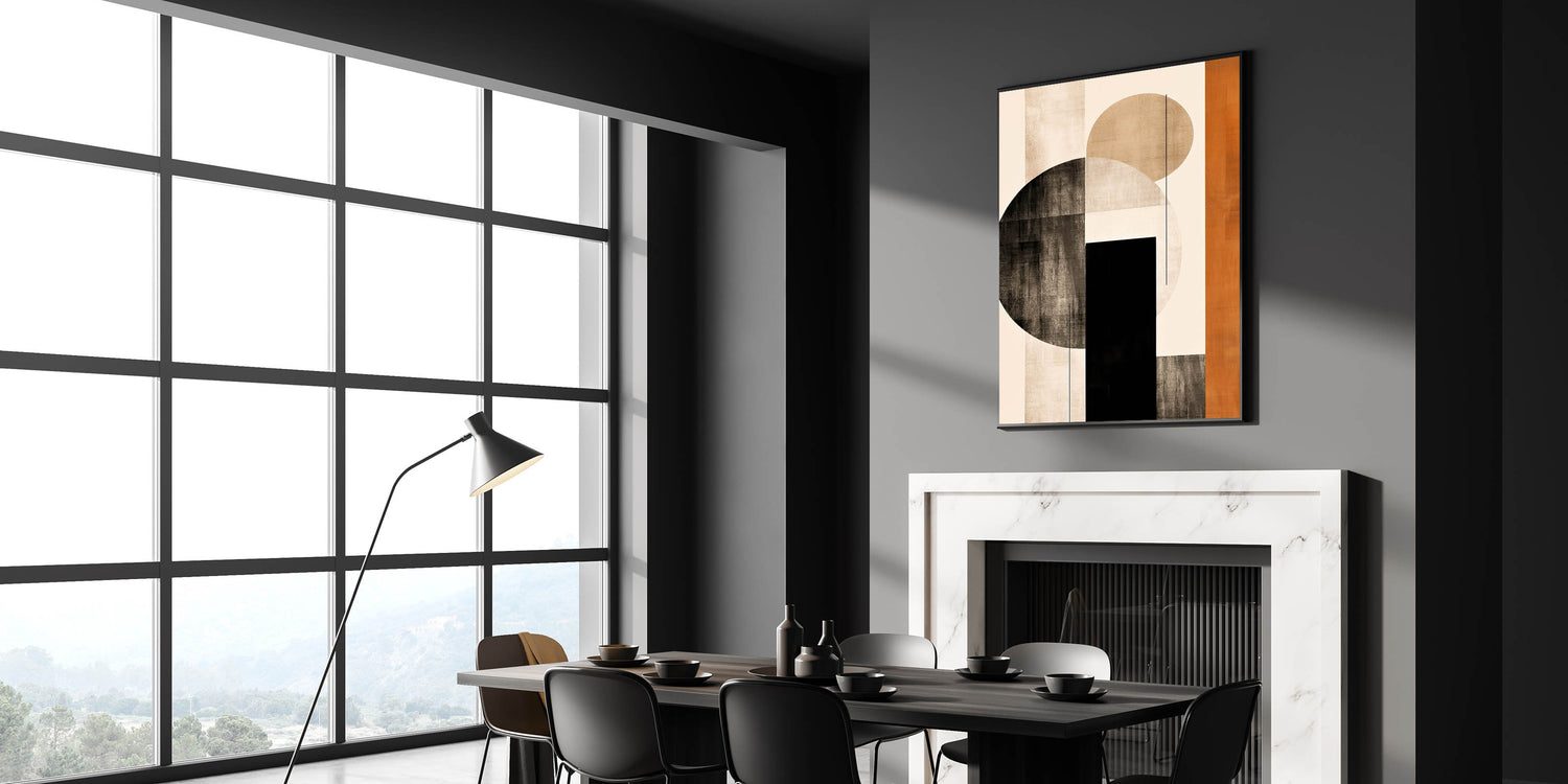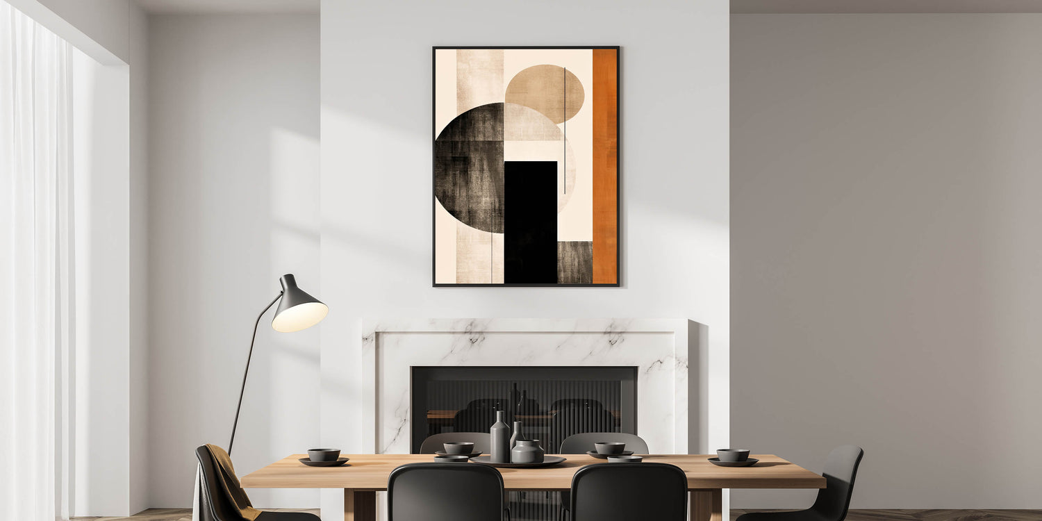 Enhance your dining space with this modern dining room wall art, featuring a striking geometric composition in black, beige, and orange tones. This contemporary piece blends abstract shapes with a minimalist aesthetic, making it the perfect focal point for any dining room wall decor.