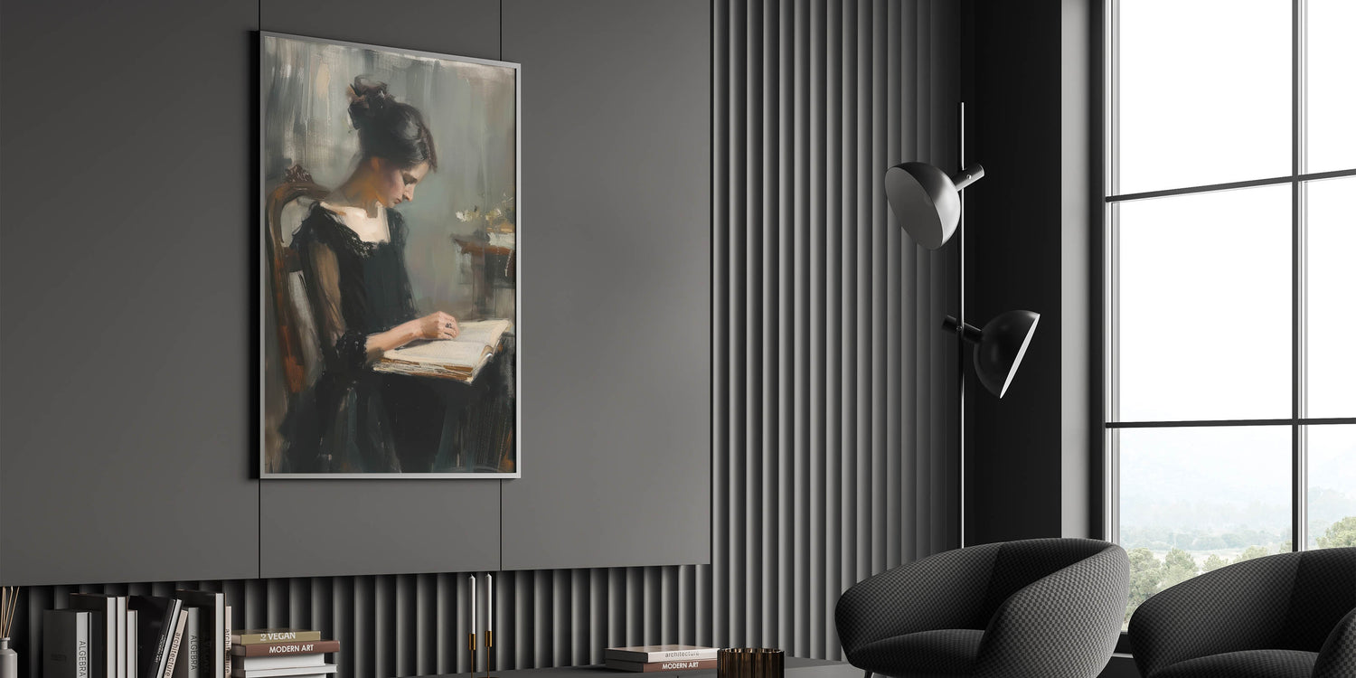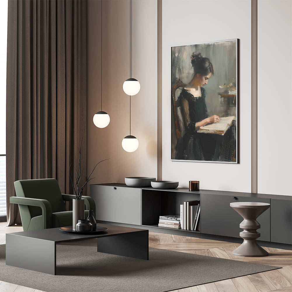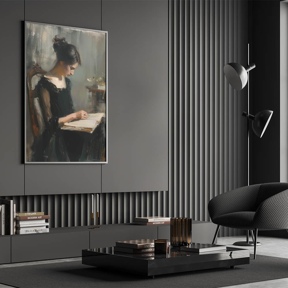 Enhance your decor with this modern figurative wall decor, featuring a serene woman engrossed in reading. The delicate brushstrokes, rich textures, and muted tones bring to life a tranquil scene that celebrates introspection and the timeless charm of literature. The contrast of her dark attire against the soft background adds depth and elegance to the artwork.