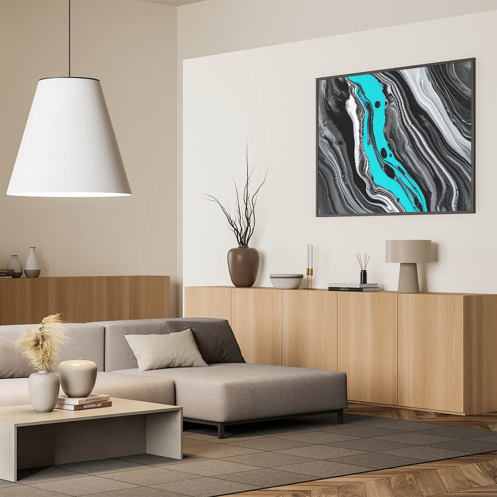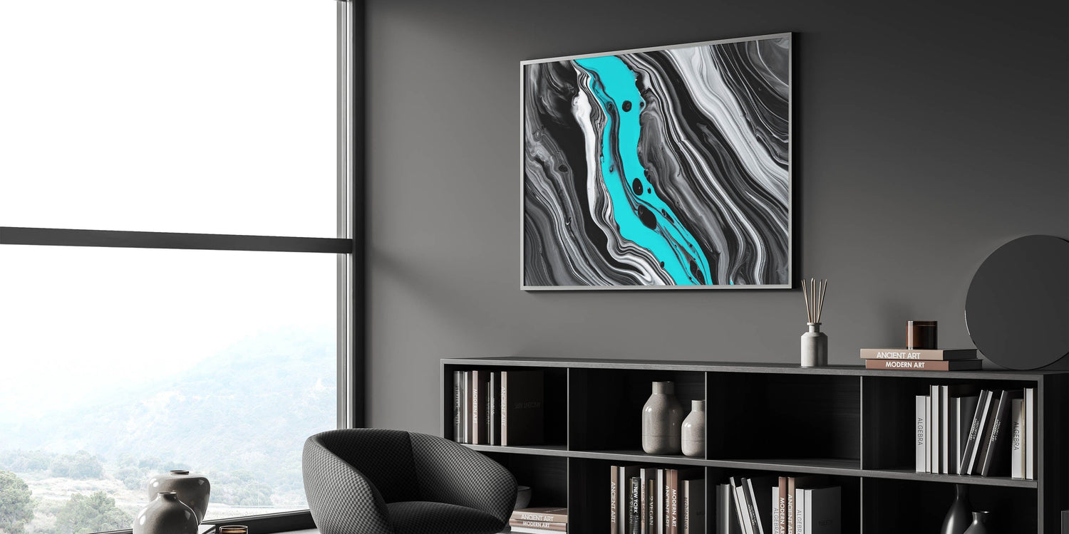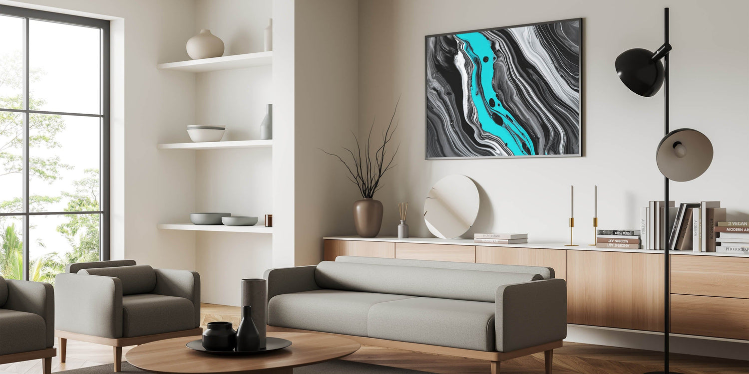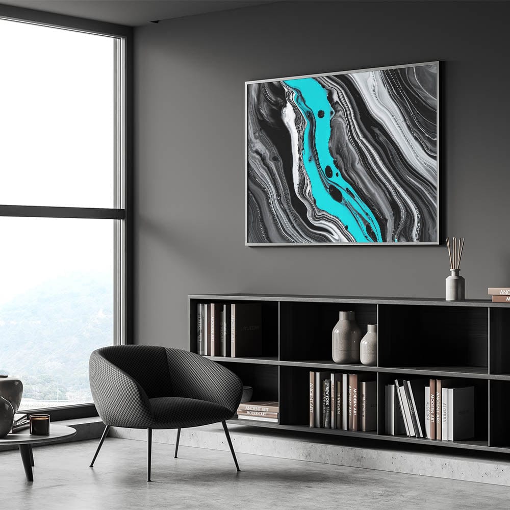 Transform your living space with this striking modern fluid art print, a dynamic expression of elegance from our fluid abstract art collection. Featuring a captivating monochrome color palette enriched with bold streaks of vibrant teal, this artwork introduces an energetic yet refined statement to any interior.