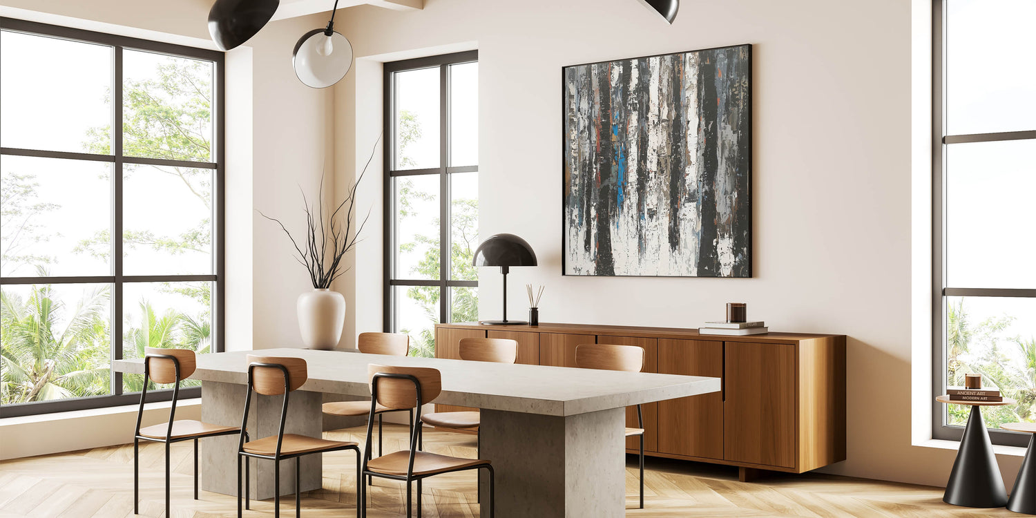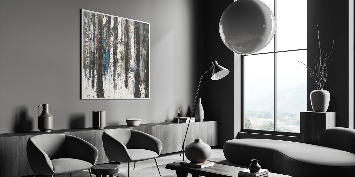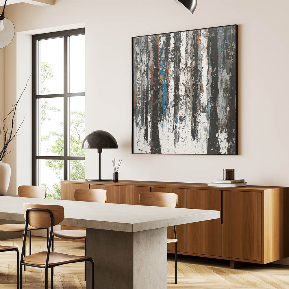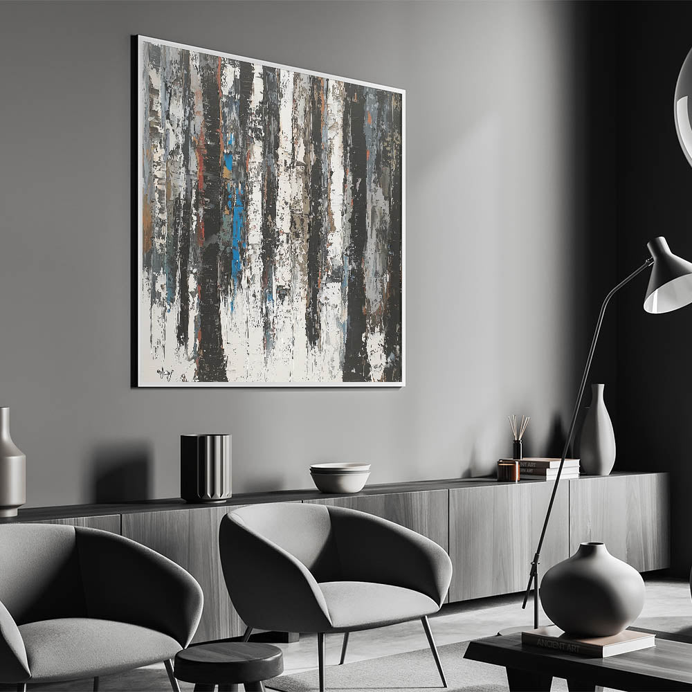 Discover the perfect blend of minimalism and artistic flair with this Modern Monochrome Abstract Canvas. Featuring a striking composition of black, white, and subtle earthy tones, this piece captures the beauty of nature with a contemporary twist. The textured design evokes the look of a serene forest with vertical strokes resembling tree trunks, enhanced by occasional pops of muted blue and brown for added depth.