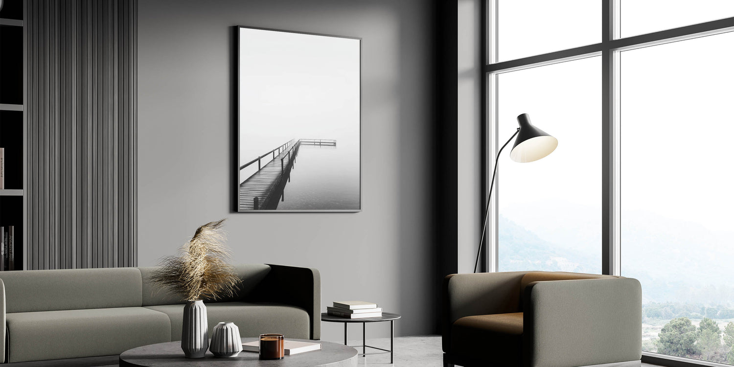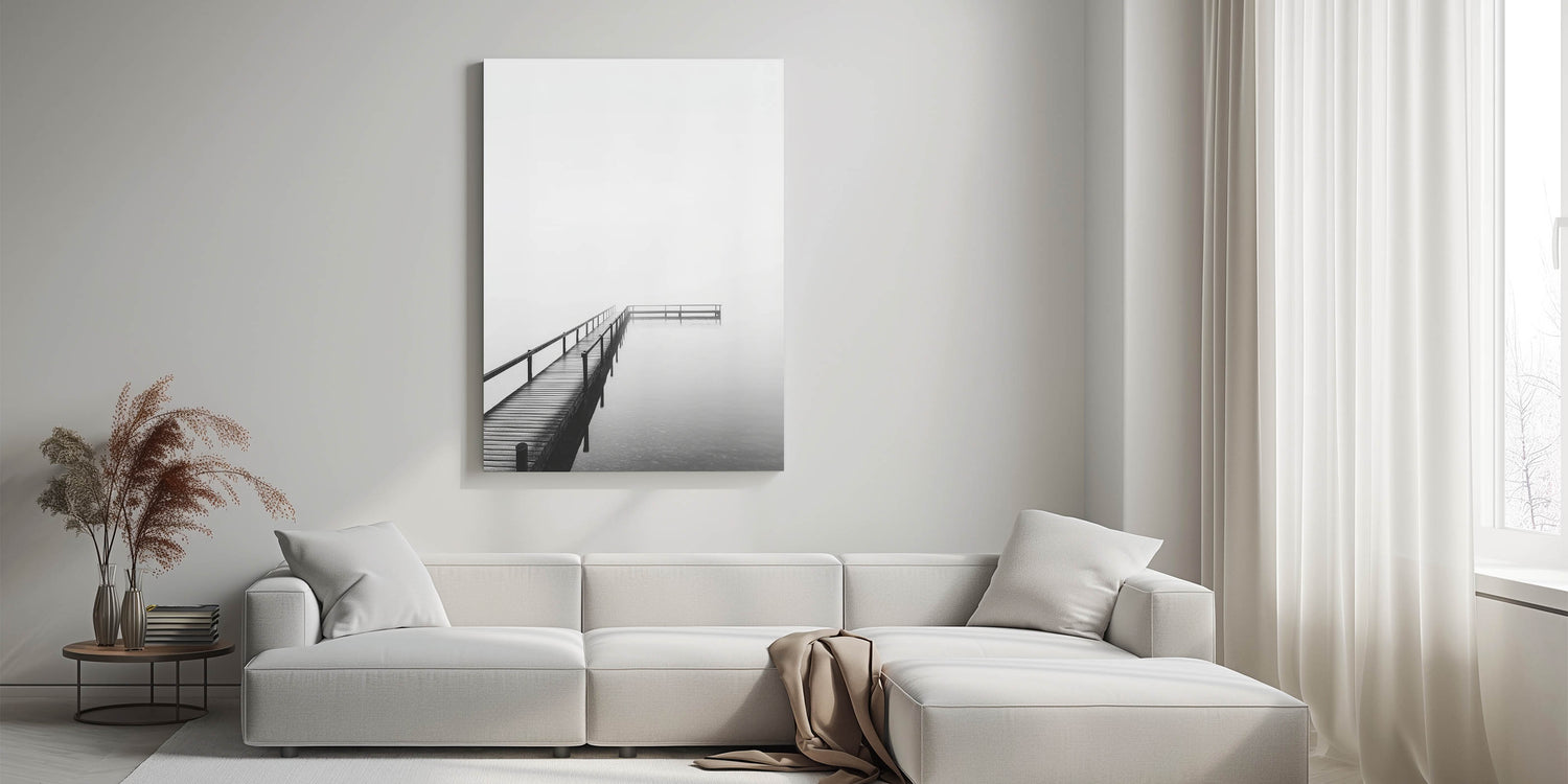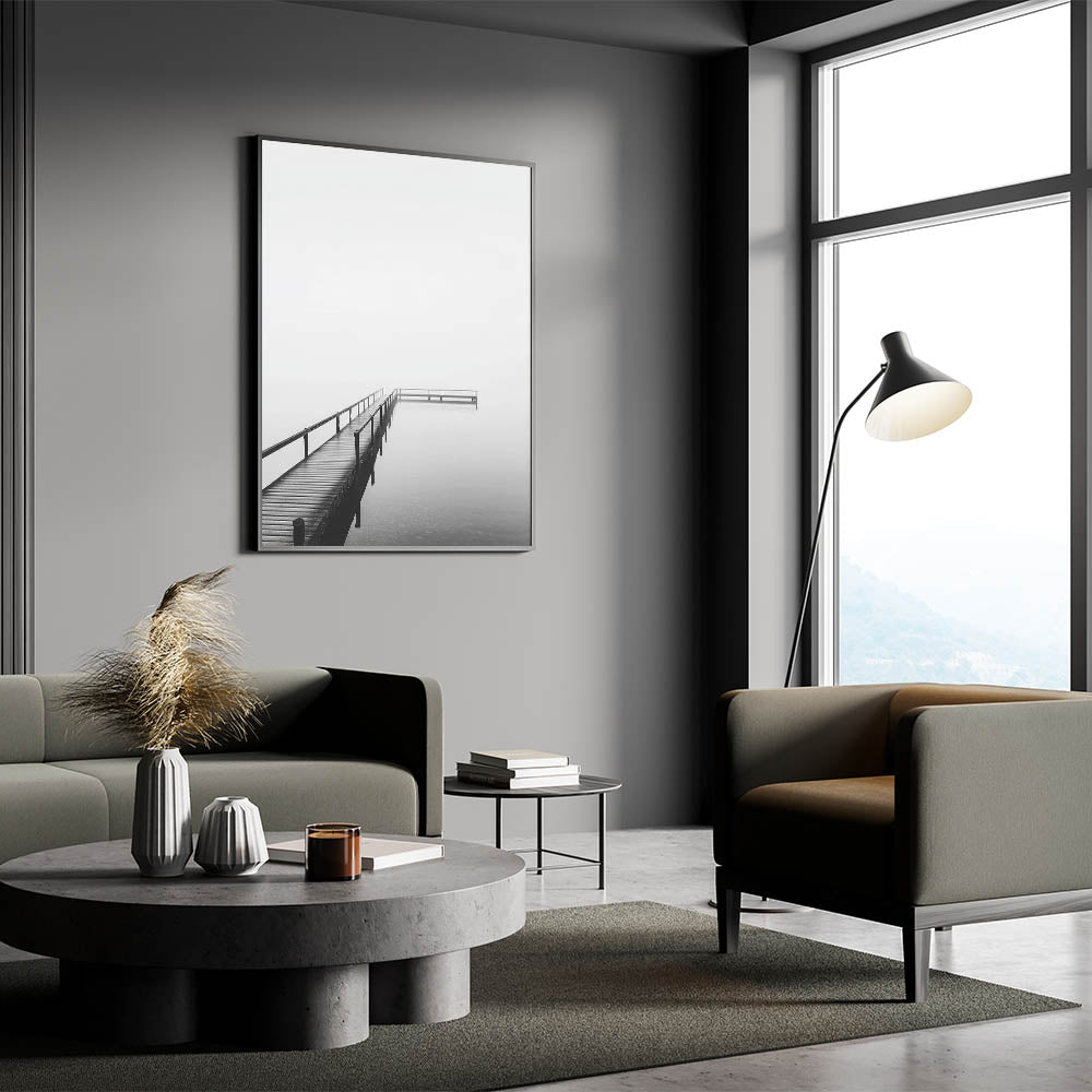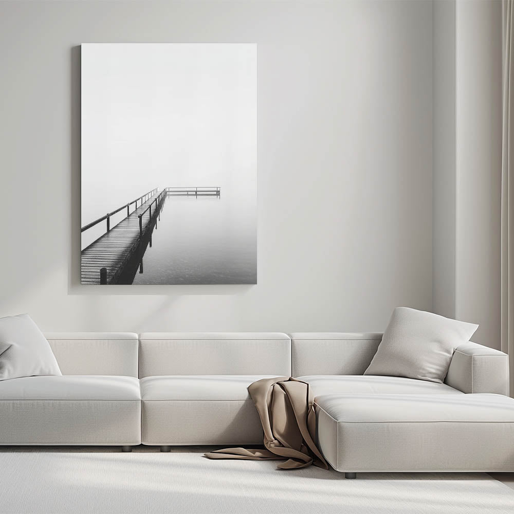 Enhance your space with this striking minimalist artwork featuring a serene pier disappearing into the fog. Rendered in monochrome tones of black, white, and gray, this piece captures the beauty of simplicity and tranquility. Its clean and modern design makes it ideal for contemporary interiors, adding depth and sophistication to any room.