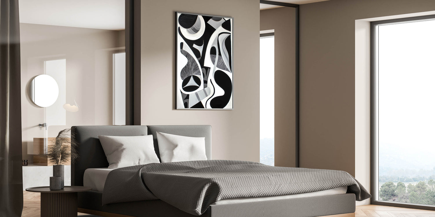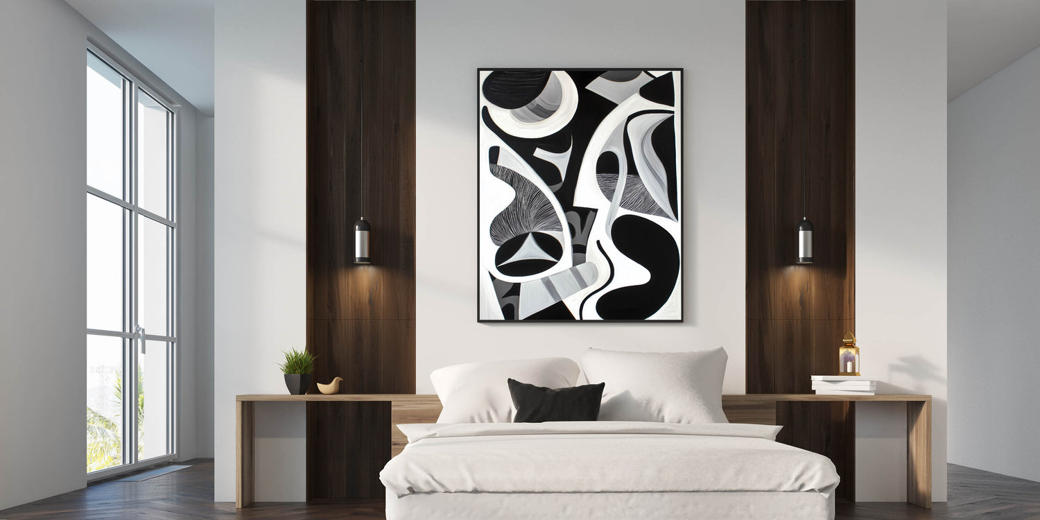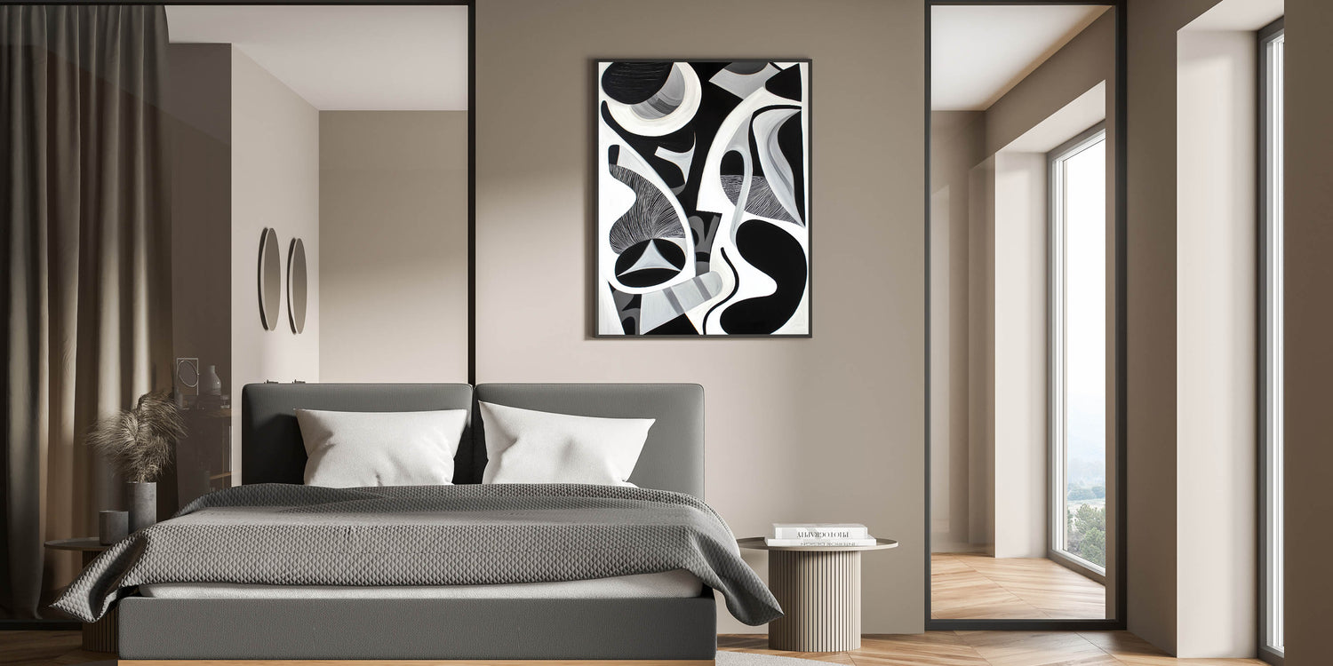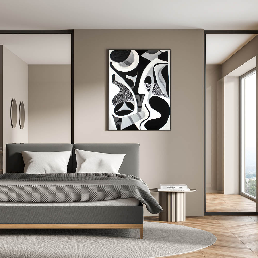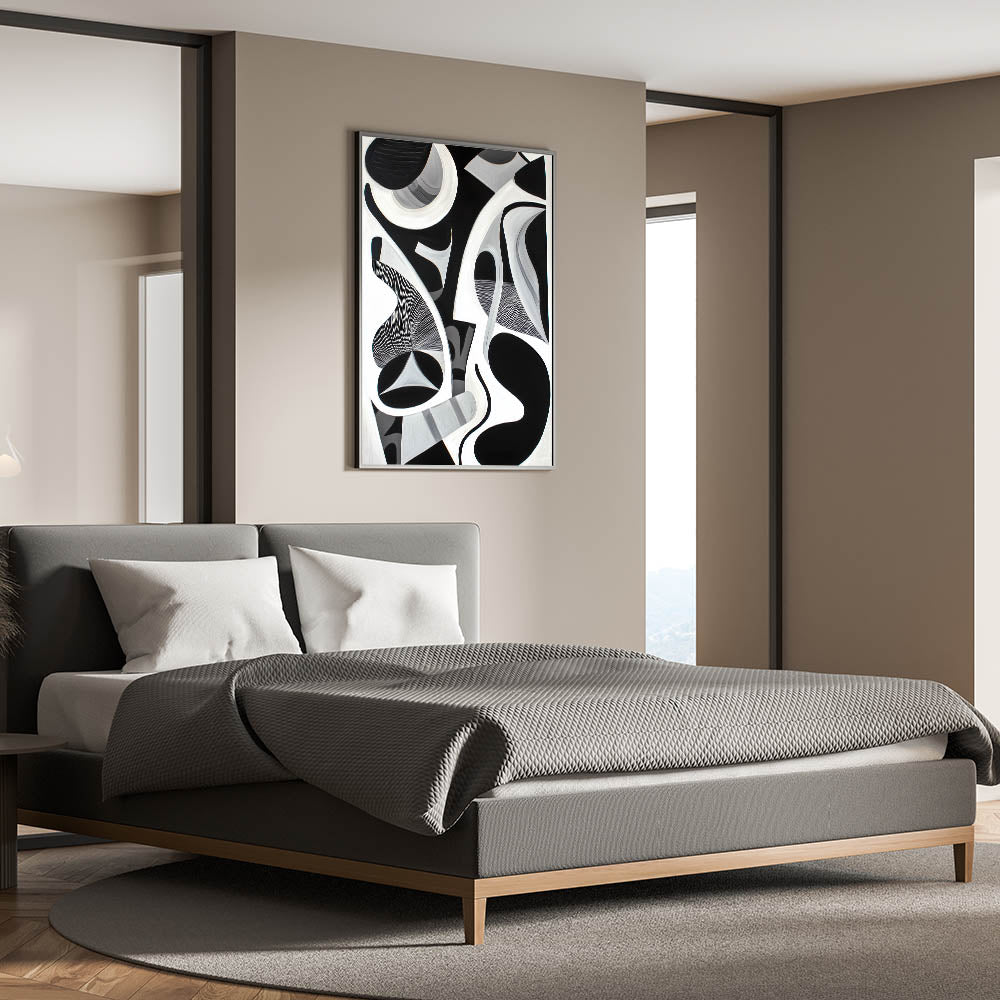 This framed bedroom art is a timeless blend of artistic expression and modern design. Whether you choose canvas prints for bedrooms or rolled canvas bedroom art, this piece delivers elegance and bold contrast to your décor.