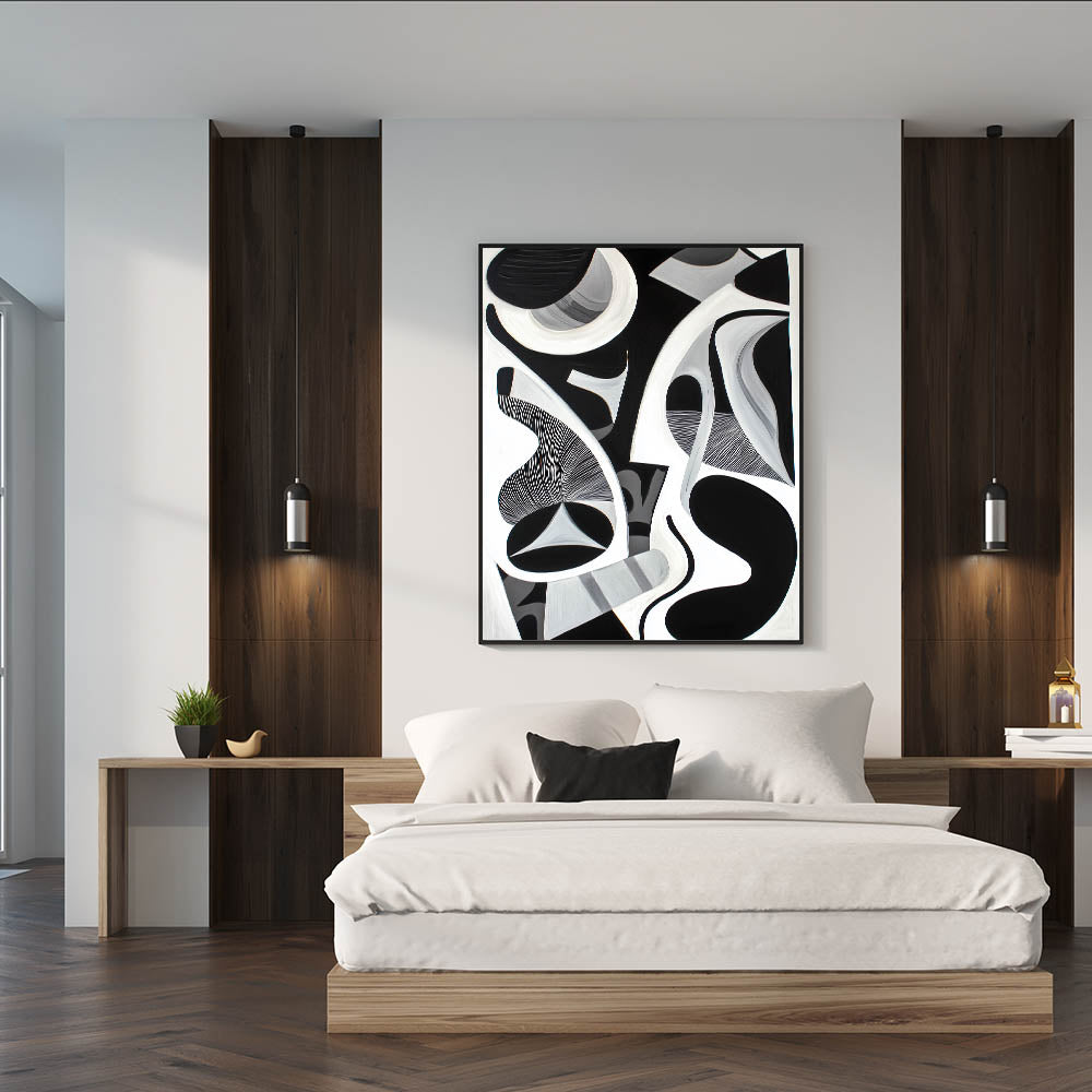 Add a sophisticated touch to your space with this modern bedroom wall décor, featuring a bold black and white abstract design. This customizable bedroom wall art blends dynamic curves, sharp contrasts, and intricate details, making it the perfect statement piece for contemporary, minimalist, and industrial interiors. Whether you are looking for large-scale wall art for master bedrooms or a sleek acrylic bedroom wall art, this striking composition transforms any space.