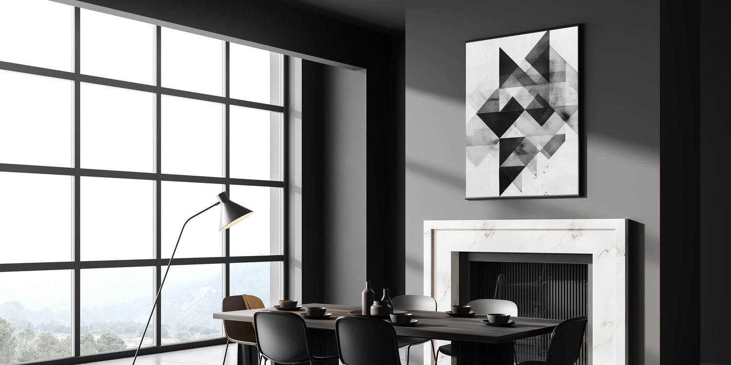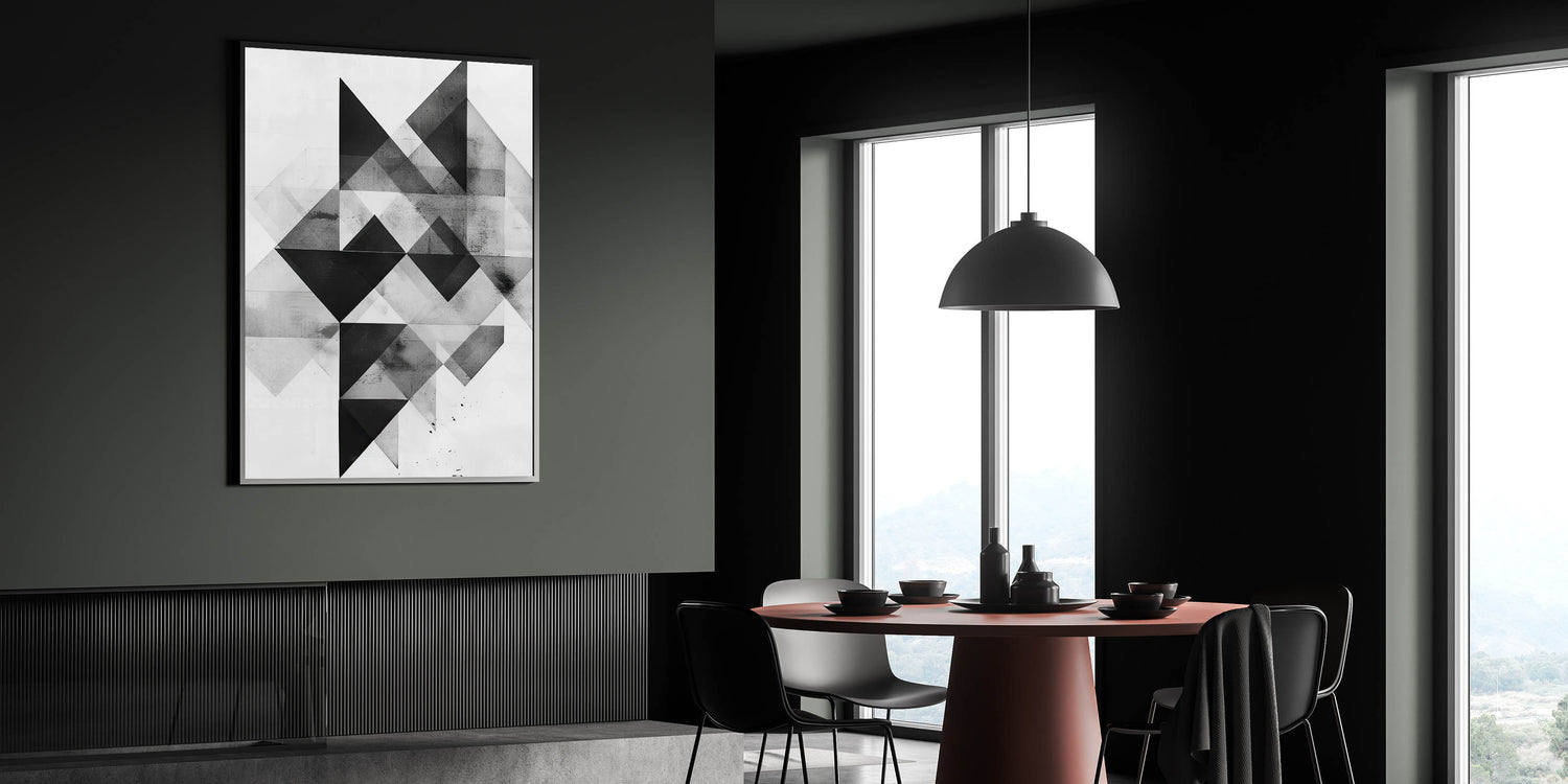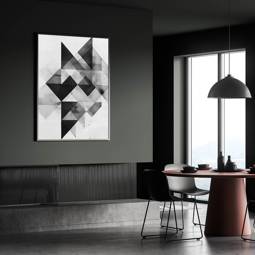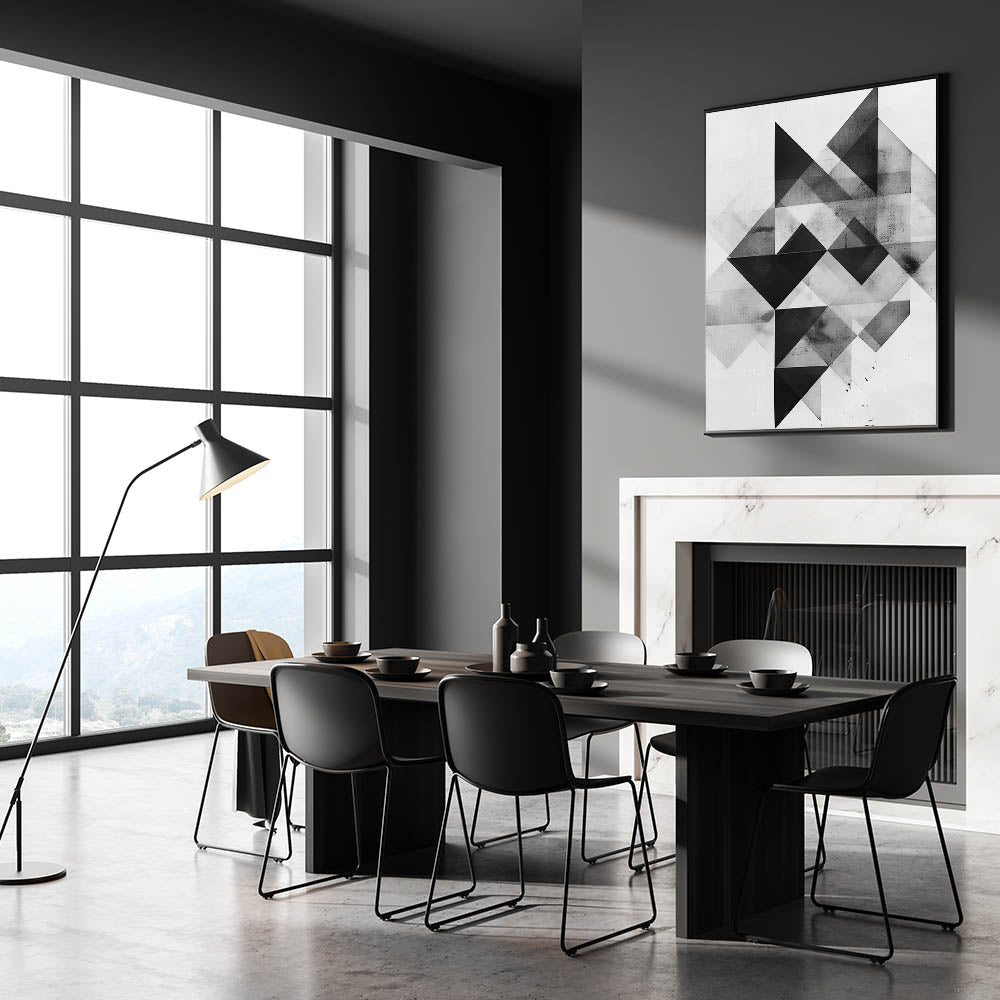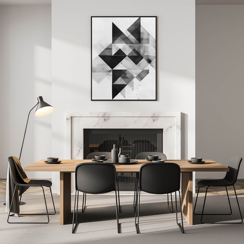 Enhance your dining space with this elegant dining room wall art, featuring a bold geometric abstract design in black, white, and gray tones. This modern dining room art offers a sleek, contemporary touch that complements minimalist and industrial decor styles.