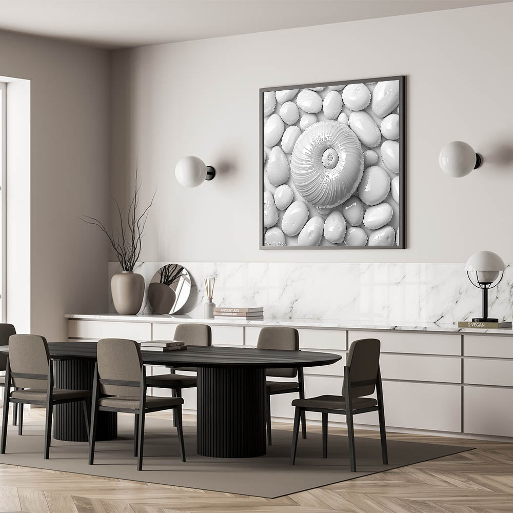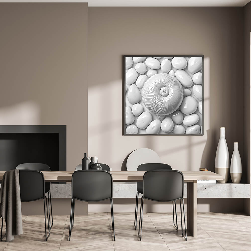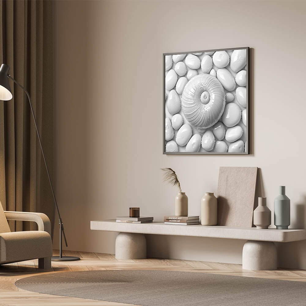 Elevate your decor with this stunning Spiral Shell and Pebbles wall art. Featuring a harmonious arrangement of a textured spiral shell resting on smooth white pebbles, this monochromatic design embodies minimalism and elegance. The clean lines and soothing tones make it an ideal choice for modern, coastal, or nature-inspired interiors.