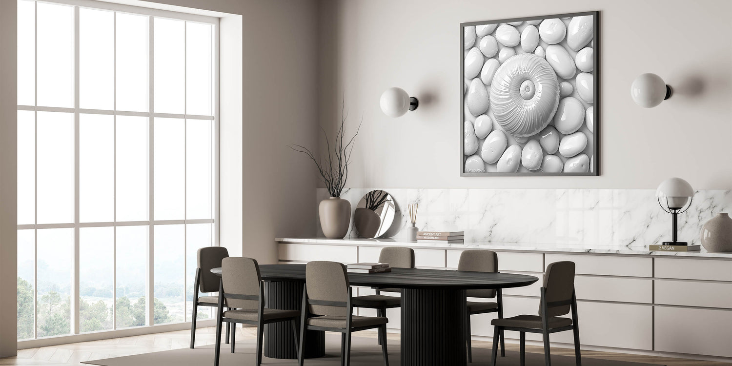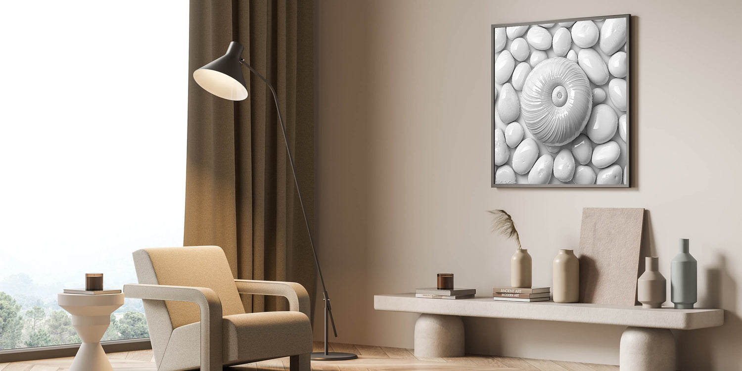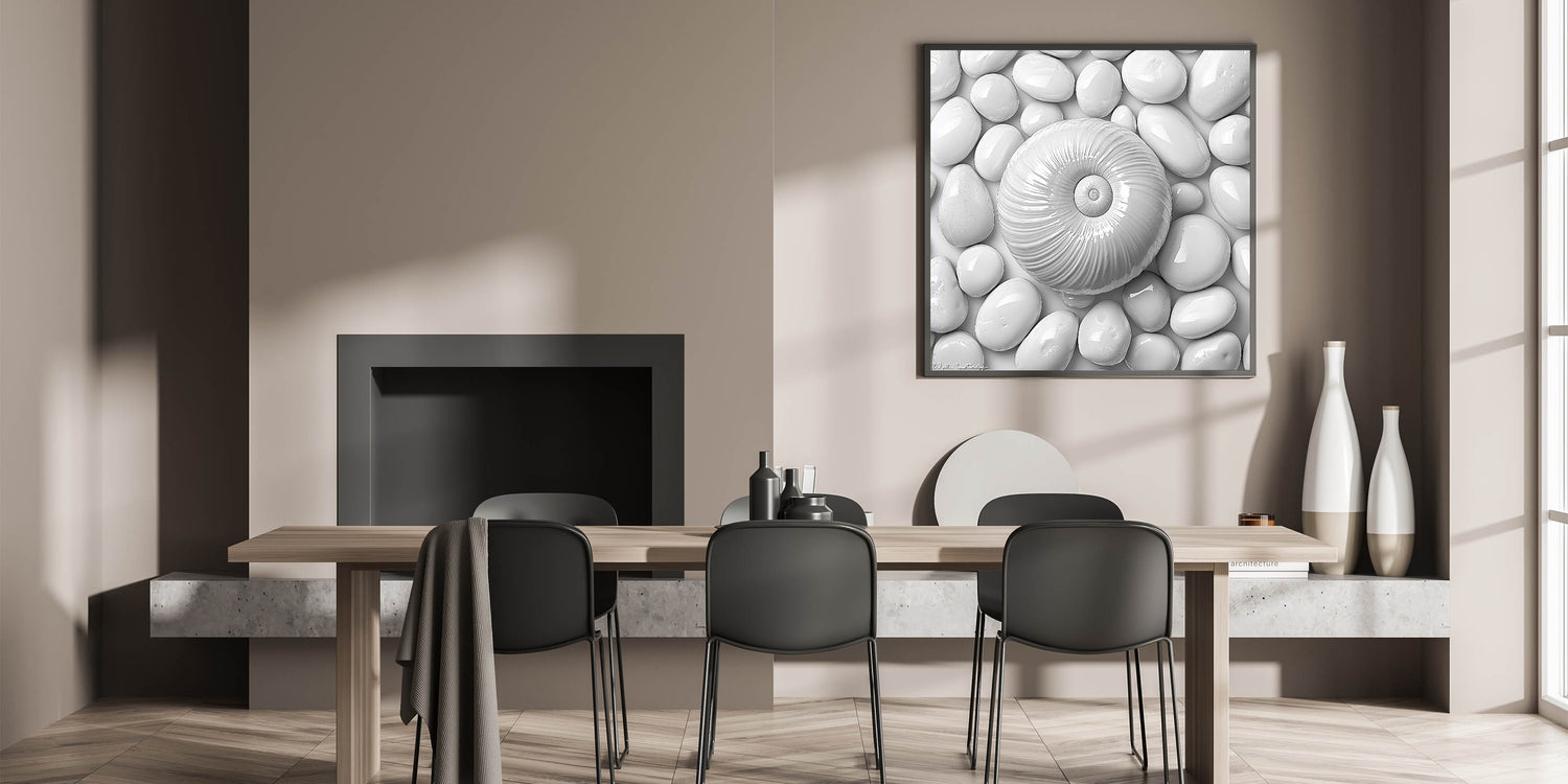 Elevate your decor with this stunning Spiral Shell and Pebbles wall art. Featuring a harmonious arrangement of a textured spiral shell resting on smooth white pebbles, this monochromatic design embodies minimalism and elegance. The clean lines and soothing tones make it an ideal choice for modern, coastal, or nature-inspired interiors.