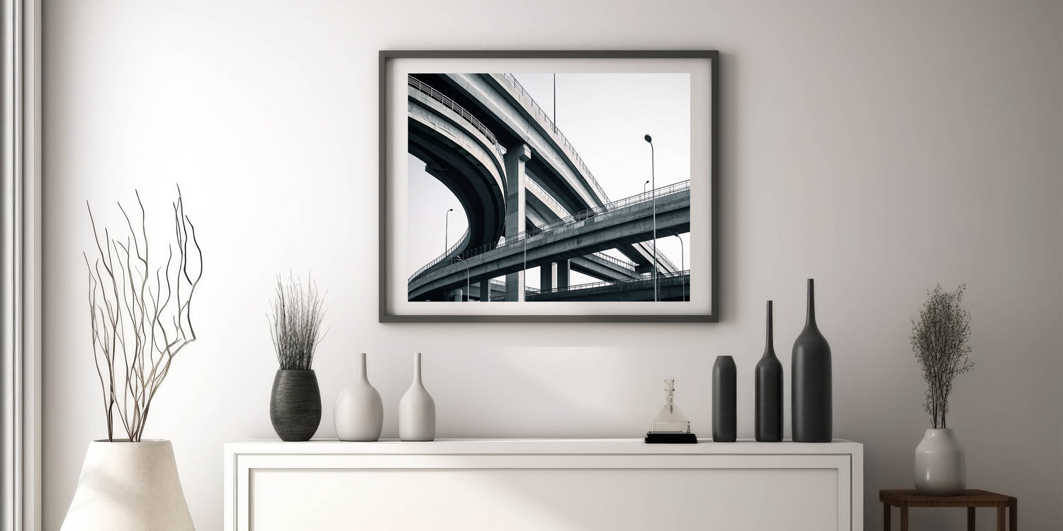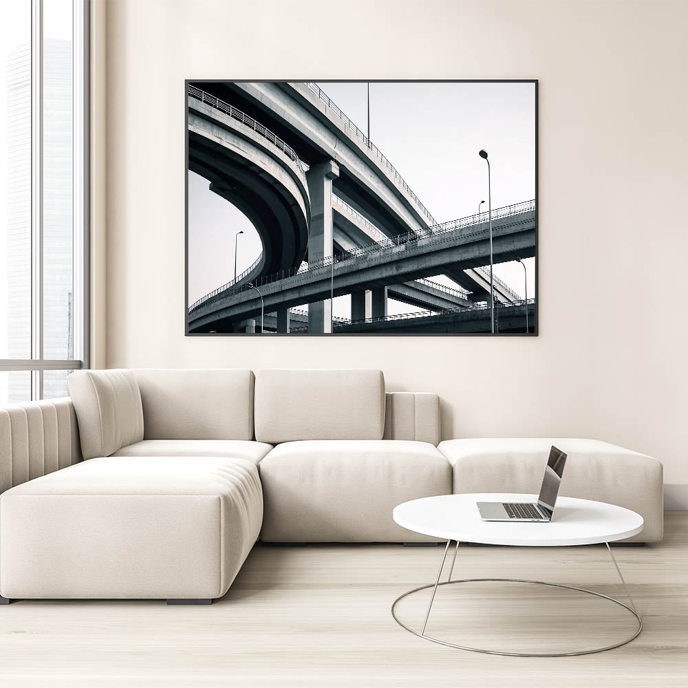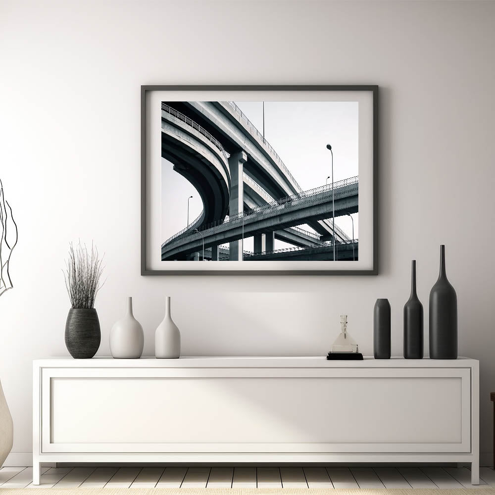 Showcase the elegance of modern infrastructure with this decorative bridge wall art, featuring a sleek urban overpass captured in striking monochrome. The clean lines and geometric curves of the overpass create a minimalist and futuristic aesthetic, perfect for adding a sophisticated touch to any space. This artwork highlights the beauty of modern engineering, blending functionality with artistic design in a timeless black-and-white composition.