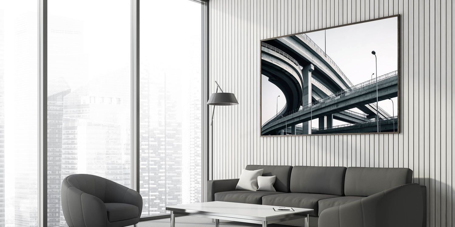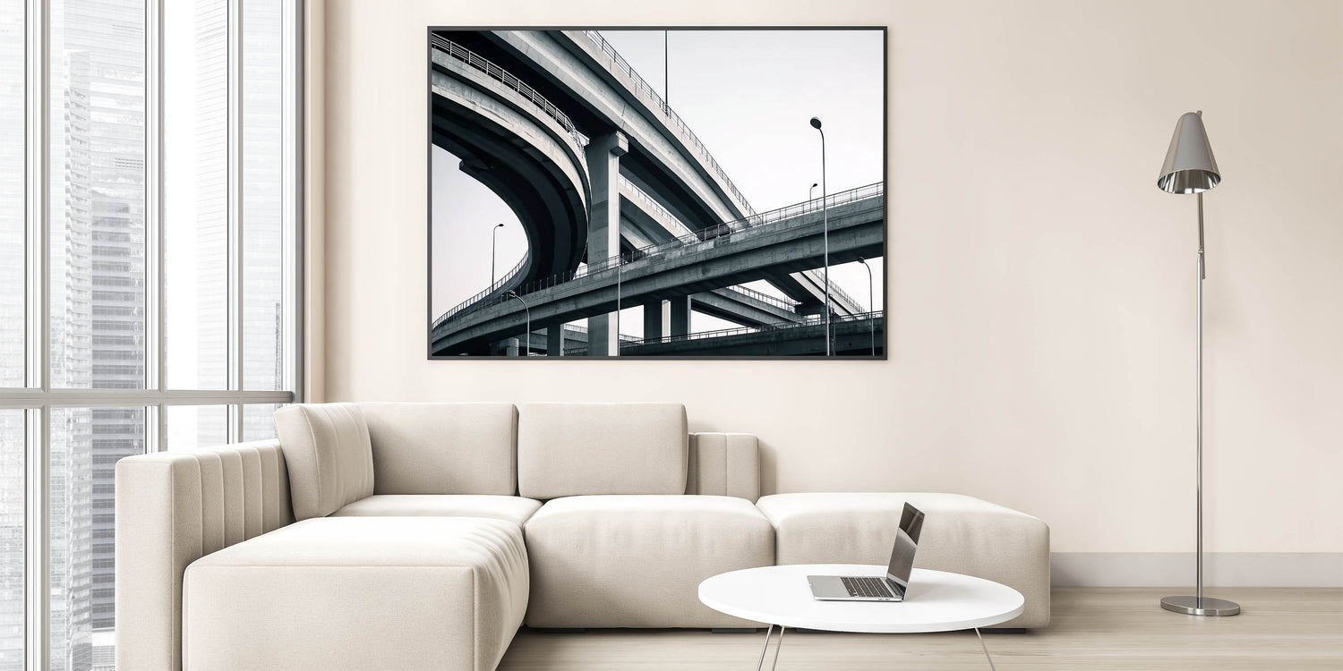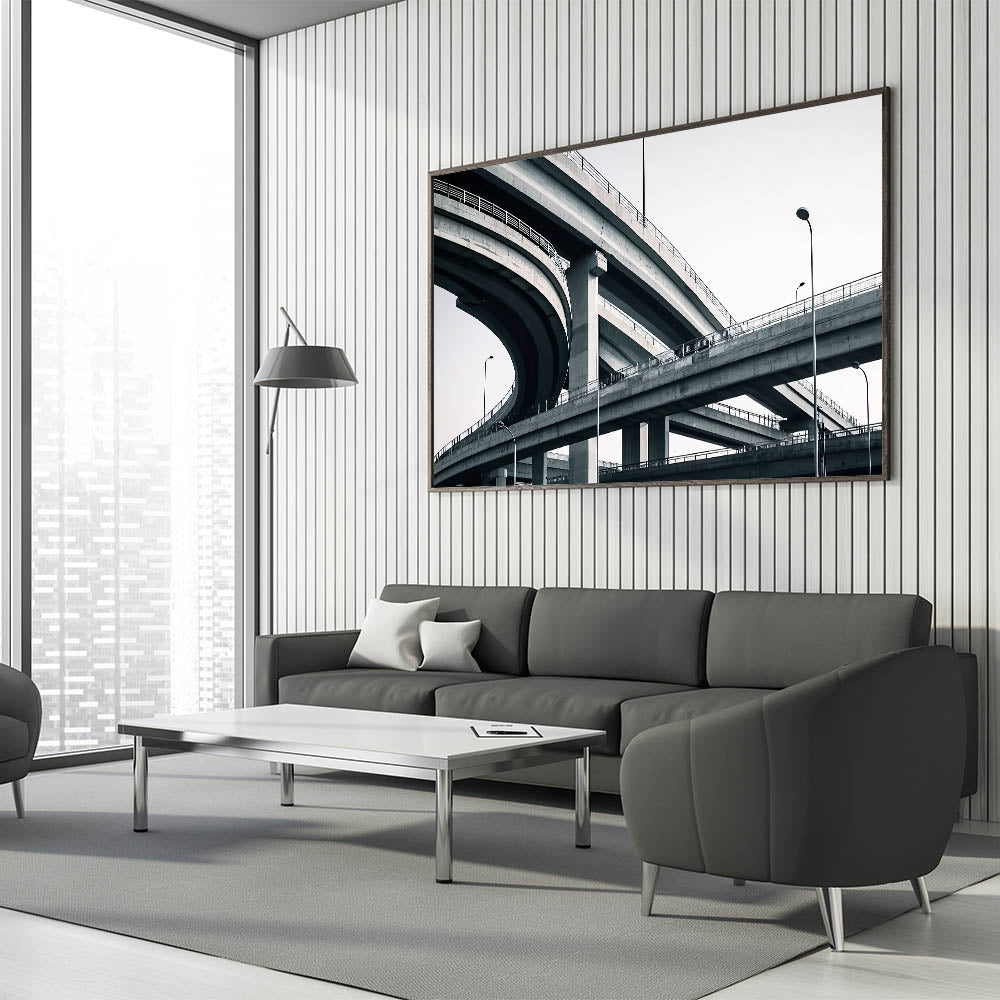 Showcase the elegance of modern infrastructure with this decorative bridge wall art, featuring a sleek urban overpass captured in striking monochrome. The clean lines and geometric curves of the overpass create a minimalist and futuristic aesthetic, perfect for adding a sophisticated touch to any space. This artwork highlights the beauty of modern engineering, blending functionality with artistic design in a timeless black-and-white composition.