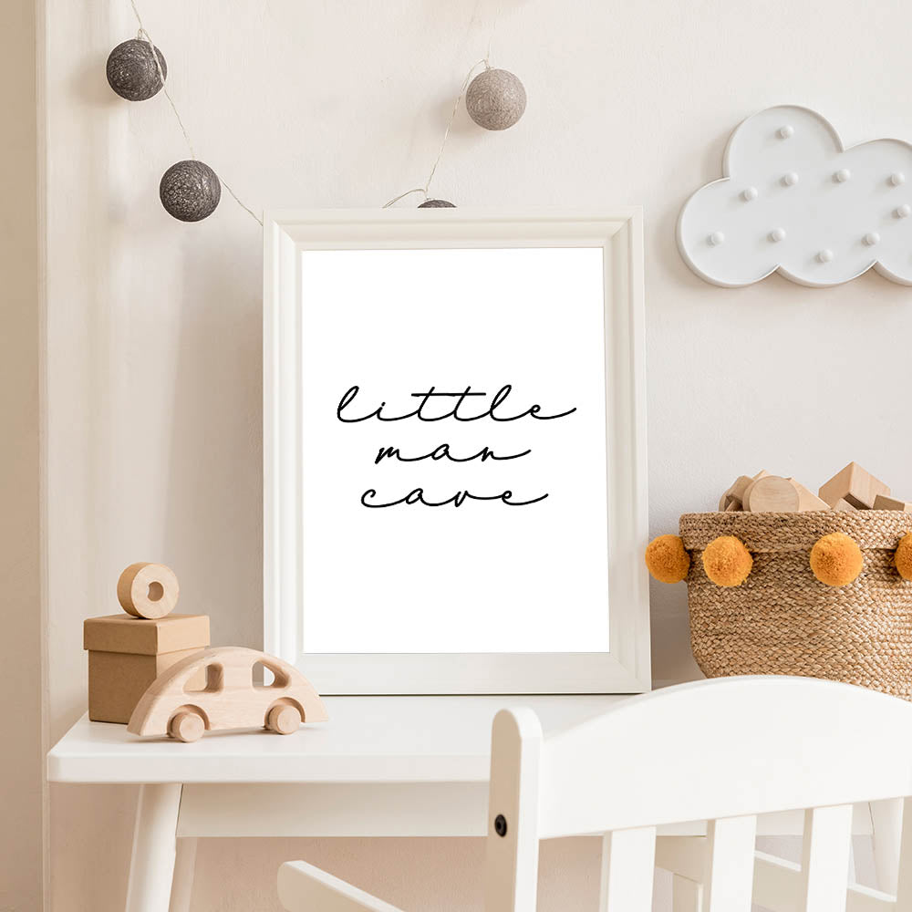 Add a fun and stylish touch to your child’s space with this playful "Little Man Cave" typography art print. Featuring a sleek, handwritten-style font on a clean white background, this design is perfect for a modern, minimalist kids' room or play area. It’s an ideal piece for inspiring creativity and personality in any little one’s space.