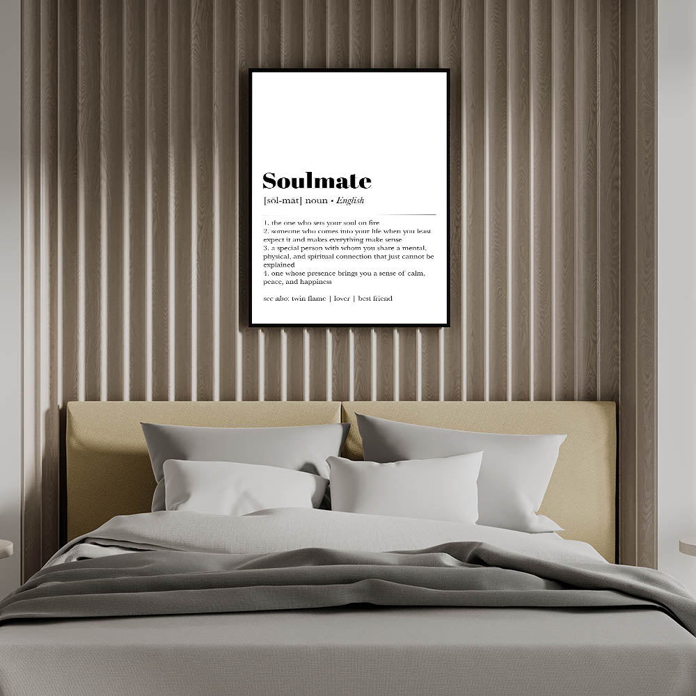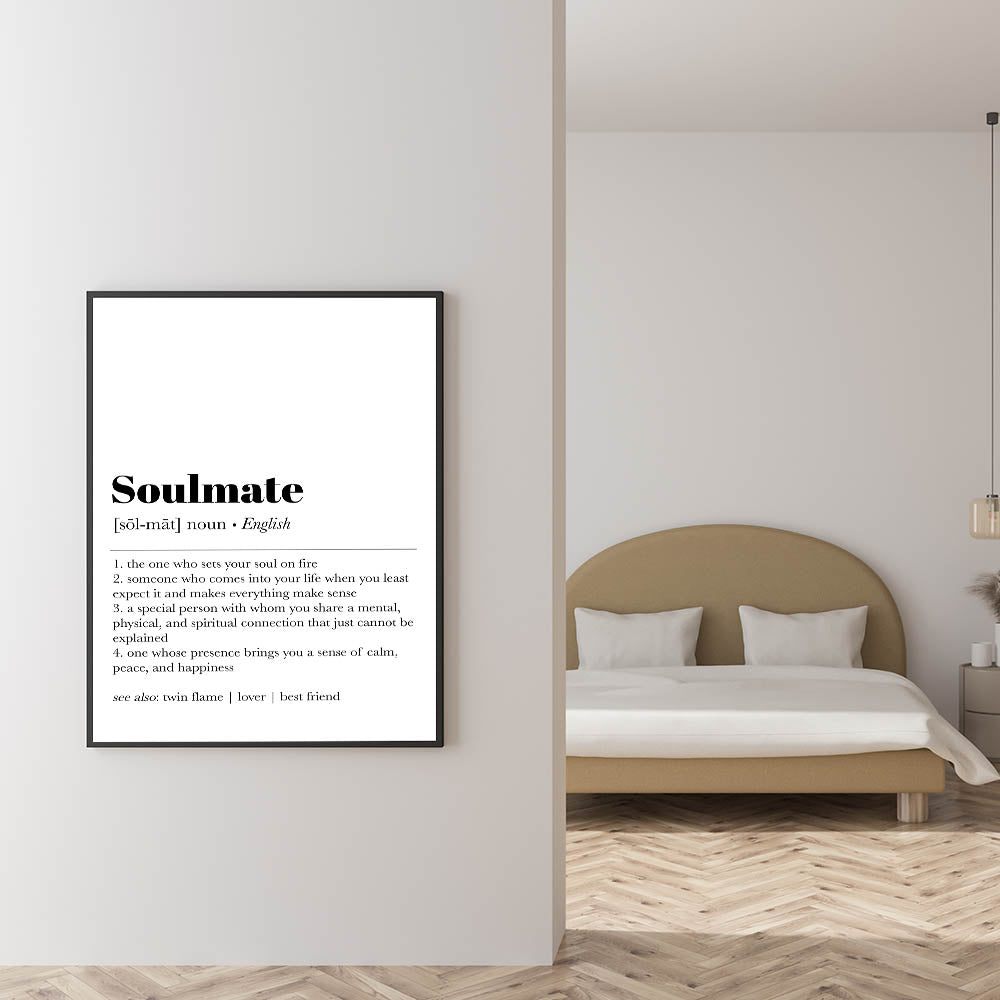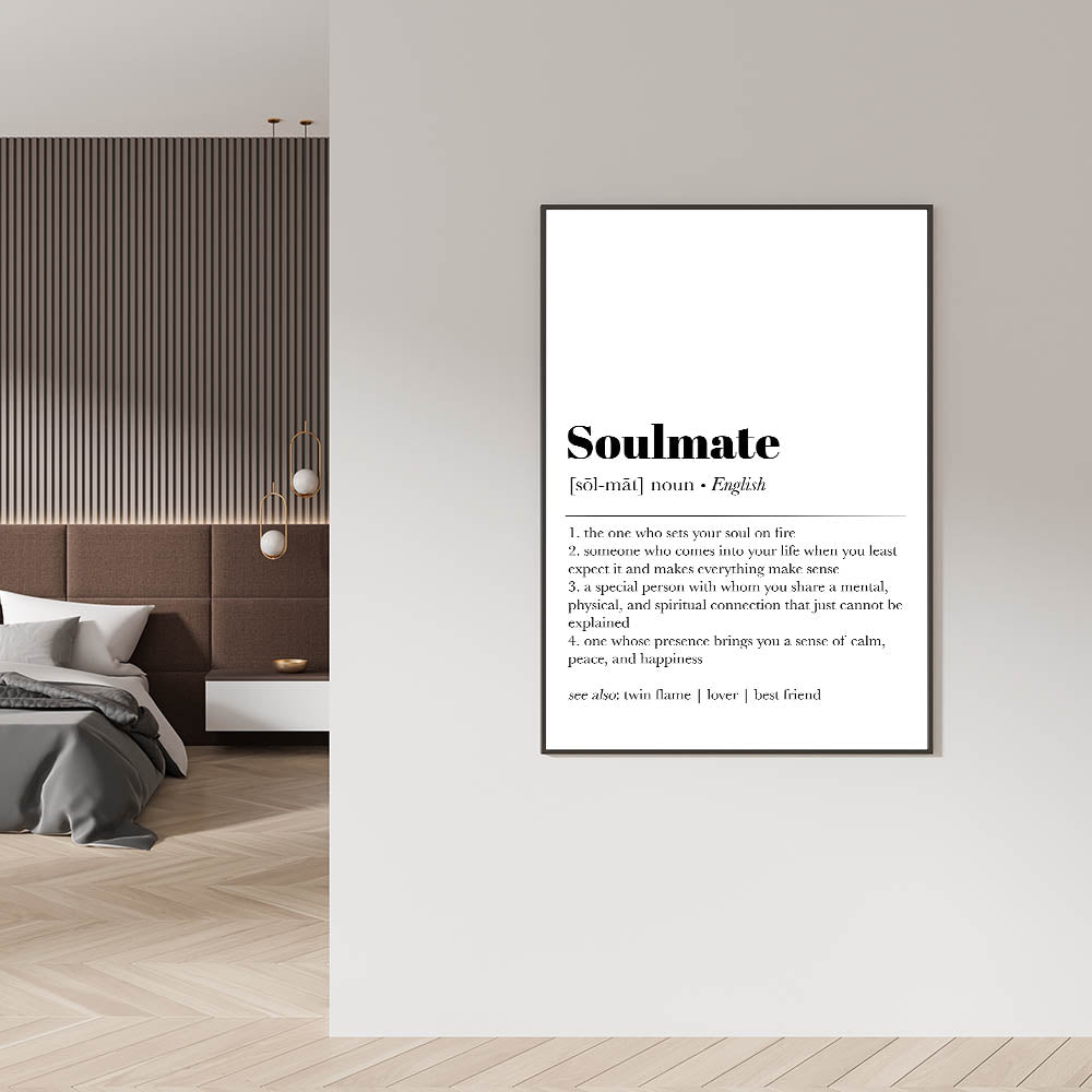 Express the depth of true connection with our Modern Typography Wall Art featuring the heartfelt definition of "Soulmate." This minimalist black-and-white design captures the essence of love and destiny, making it a perfect addition to bedrooms, living rooms, or as a thoughtful gift for anniversaries and weddings. The clean typography and meaningful message blend effortlessly with modern home decor styles.