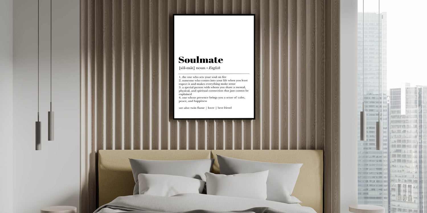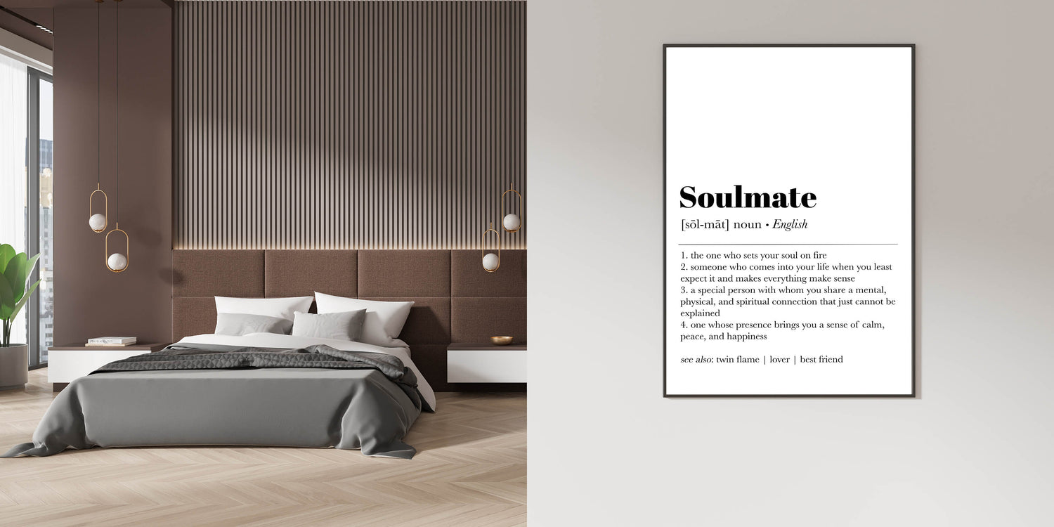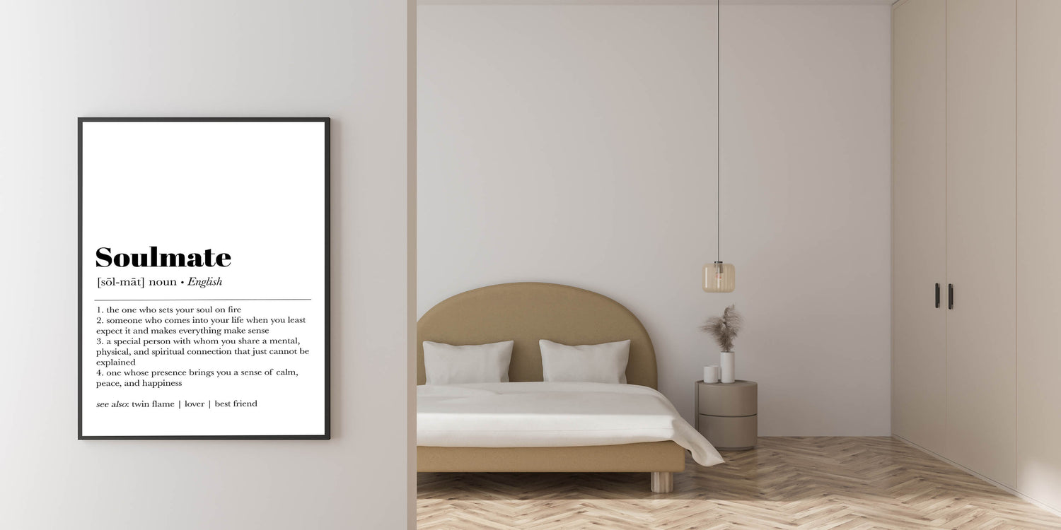 Express the depth of true connection with our Modern Typography Wall Art featuring the heartfelt definition of "Soulmate." This minimalist black-and-white design captures the essence of love and destiny, making it a perfect addition to bedrooms, living rooms, or as a thoughtful gift for anniversaries and weddings. The clean typography and meaningful message blend effortlessly with modern home decor styles.