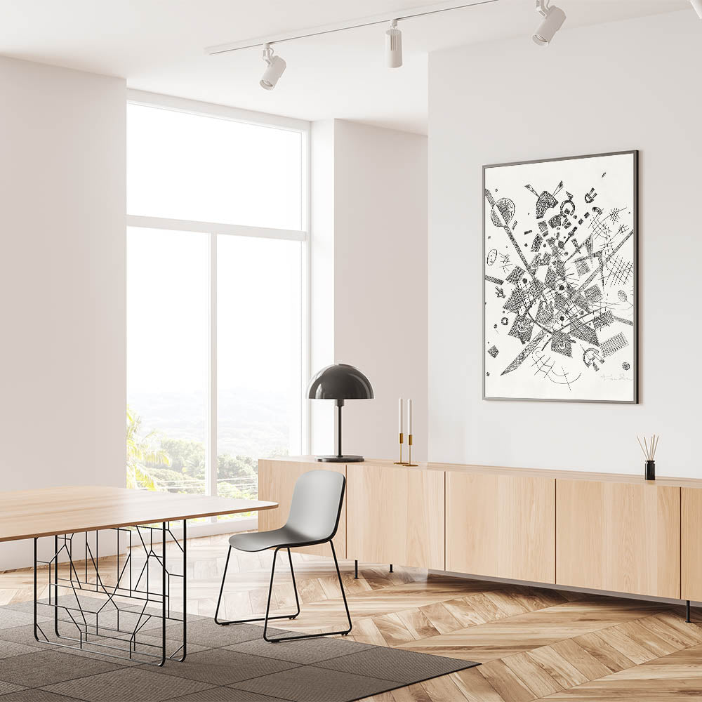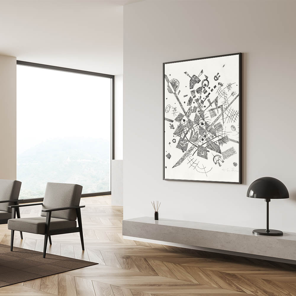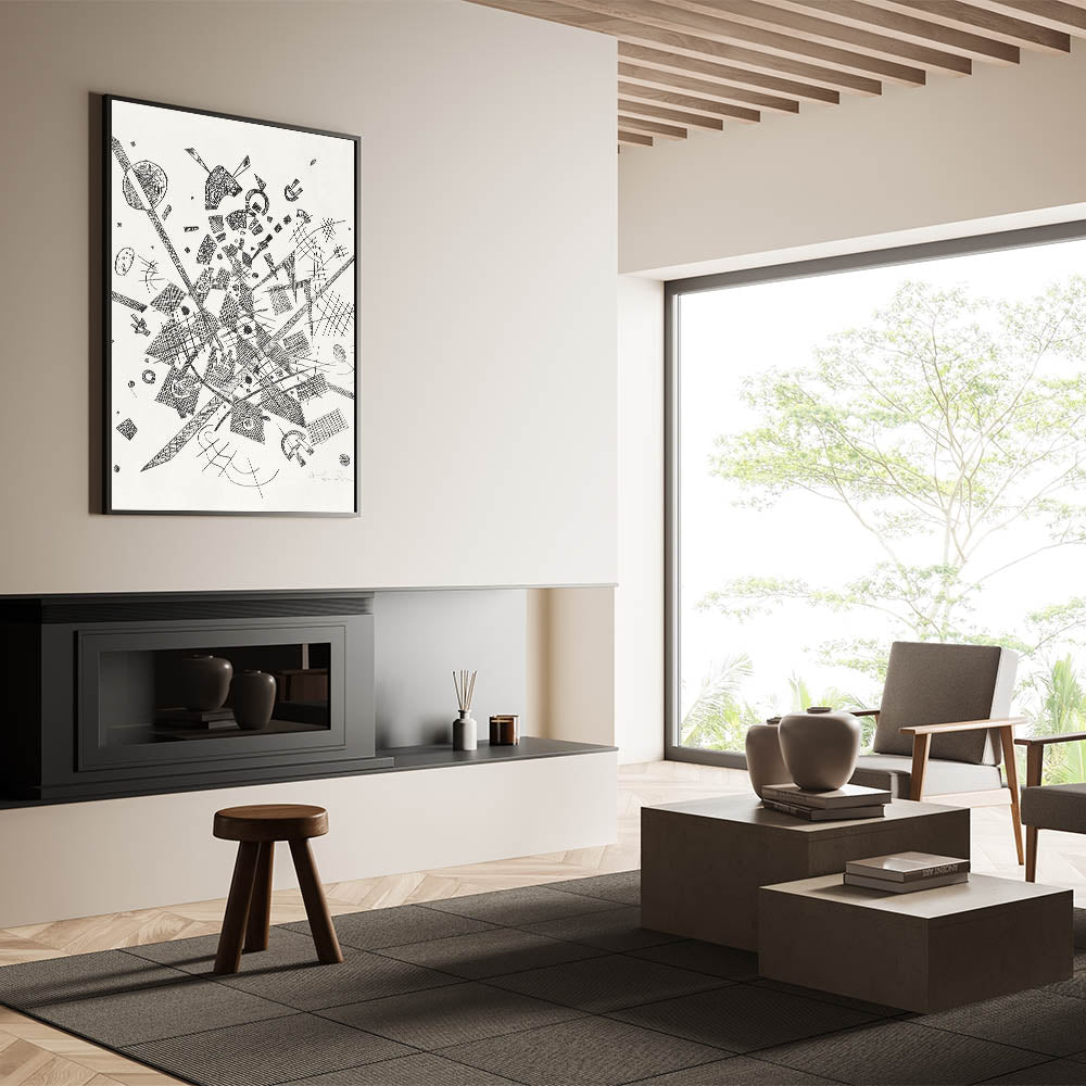 Add a dynamic, modern touch to your space with this abstract black-and-white geometric print, a true masterpiece for lovers of bold and contemporary art. This intricate design, filled with intersecting lines, shapes, and textures, evokes a sense of controlled chaos and sophisticated complexity. Perfect for minimalist or modern decor, this artwork brings a striking visual element to any room.