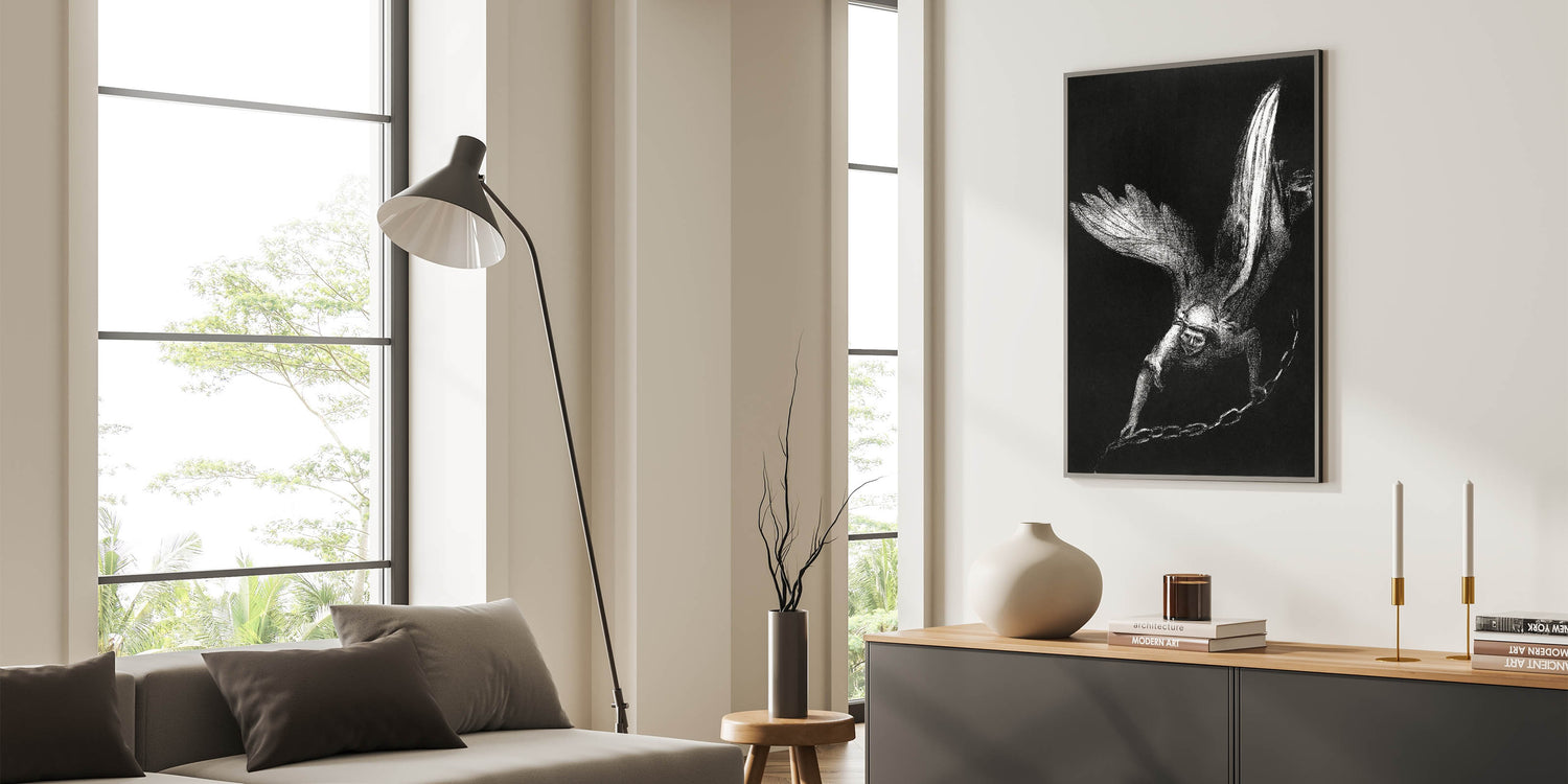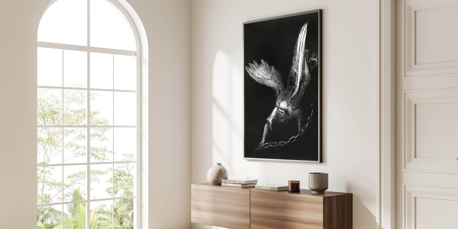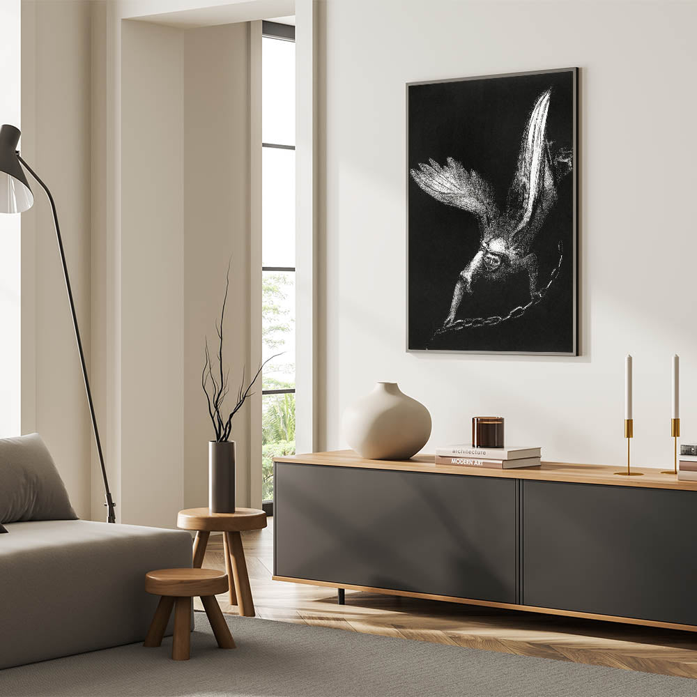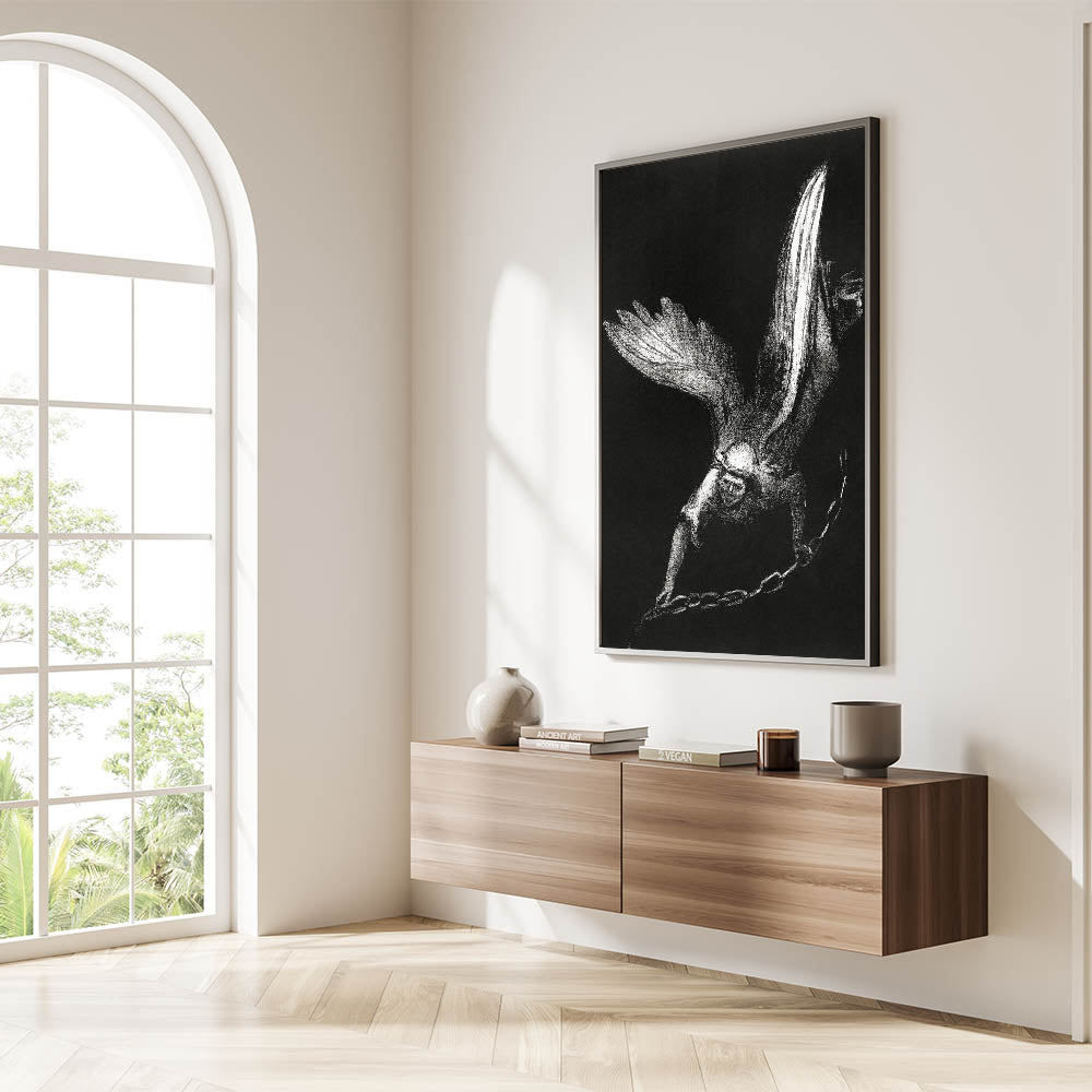 Infuse your space with a sense of mystery and drama with the "Angel with Chain" Modern Wall Art. Inspired by Odilon Redon's 1899 masterpiece, this striking monochromatic artwork depicts a powerful angel descending with a chain, capturing both tension and grace. Its dark, minimalist aesthetic makes it an ideal choice for modern design-focused interiors.