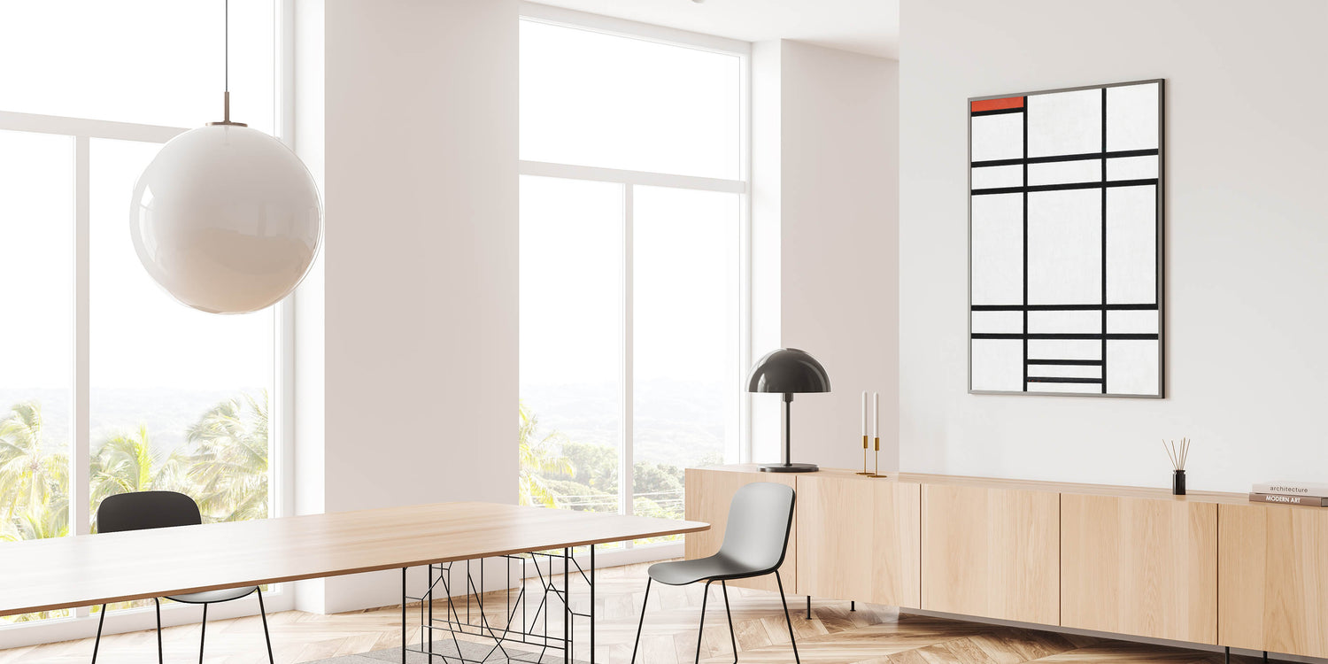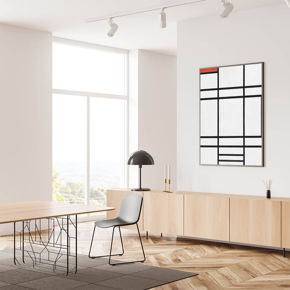Add sleek sophistication to your decor with the "Composition in White, Red, and Yellow" Modern Wall Art. Inspired by Piet Mondrian's 1936 masterpiece, this abstract minimalist artwork uses bold black lines and vibrant blocks of red, yellow, and white to create a harmonious balance. Perfect for those who appreciate modern design elements and geometric abstraction.