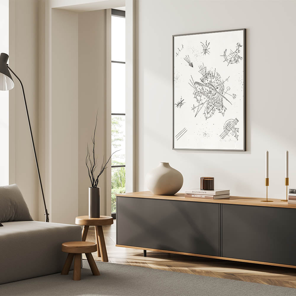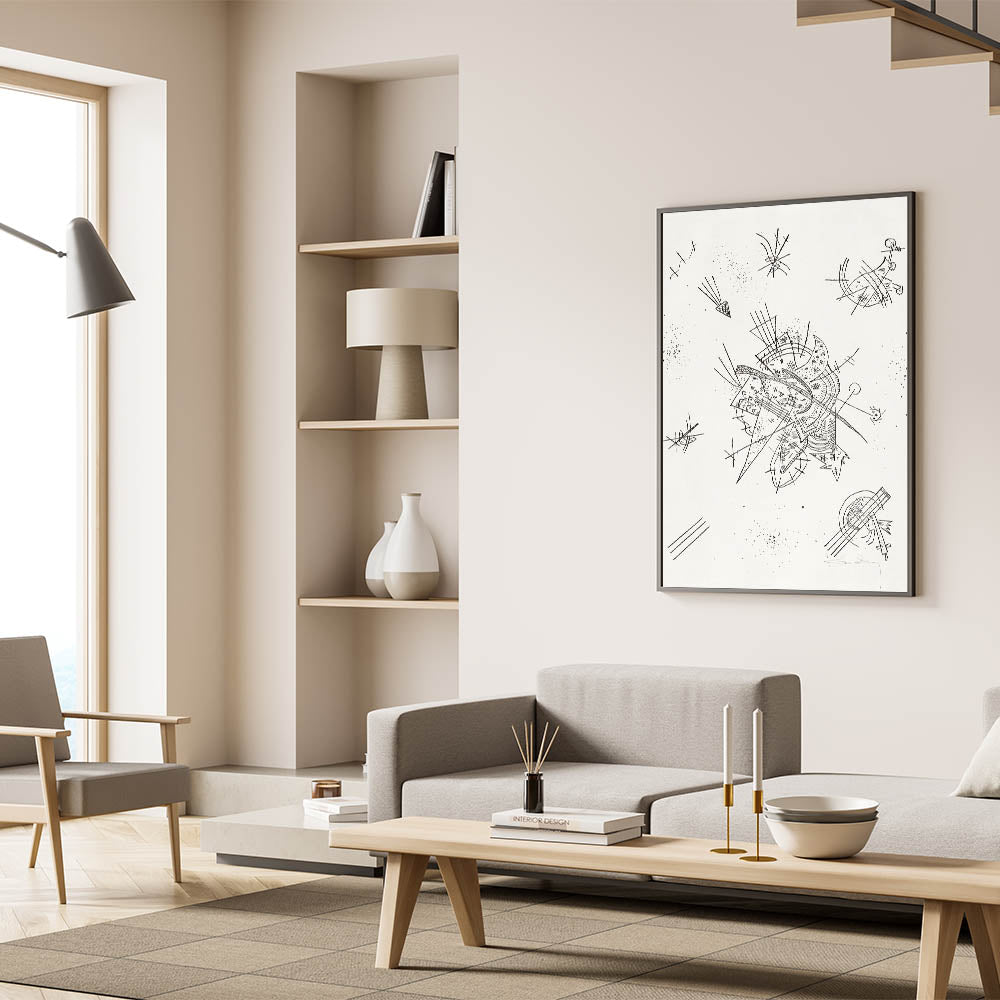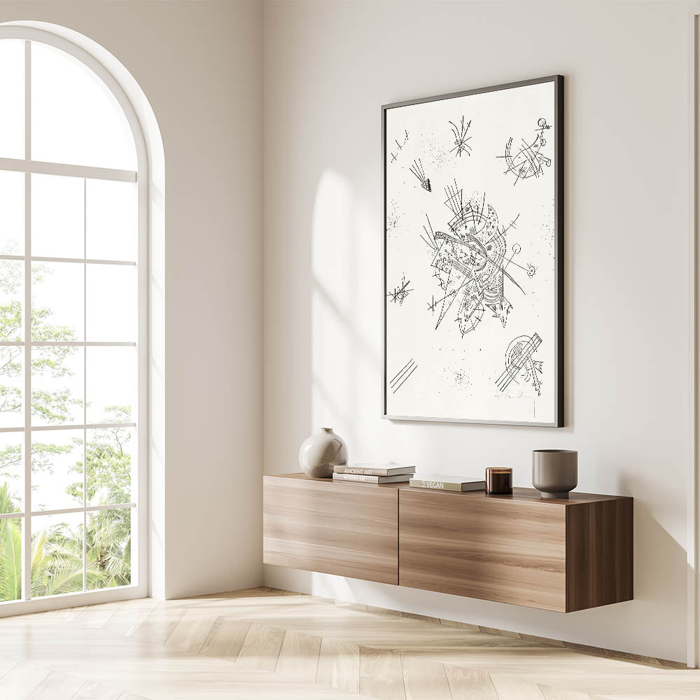 Introduce a touch of modern sophistication to your decor with this Modern Wall Art piece, a delicate and intricate line drawing that exudes a sense of mystery and movement. Inspired by Wassily Kandinsky's work, this artwork is filled with abstract shapes and fine details, making it a perfect choice for Minimalist Modern Decor enthusiasts. The black-and-white design lends itself well to a variety of interiors, from contemporary to classic.