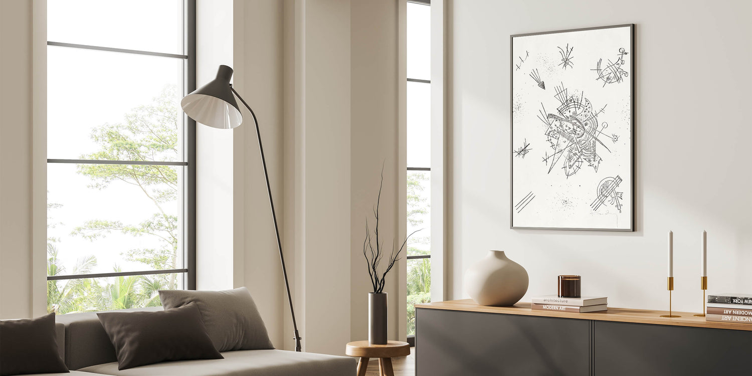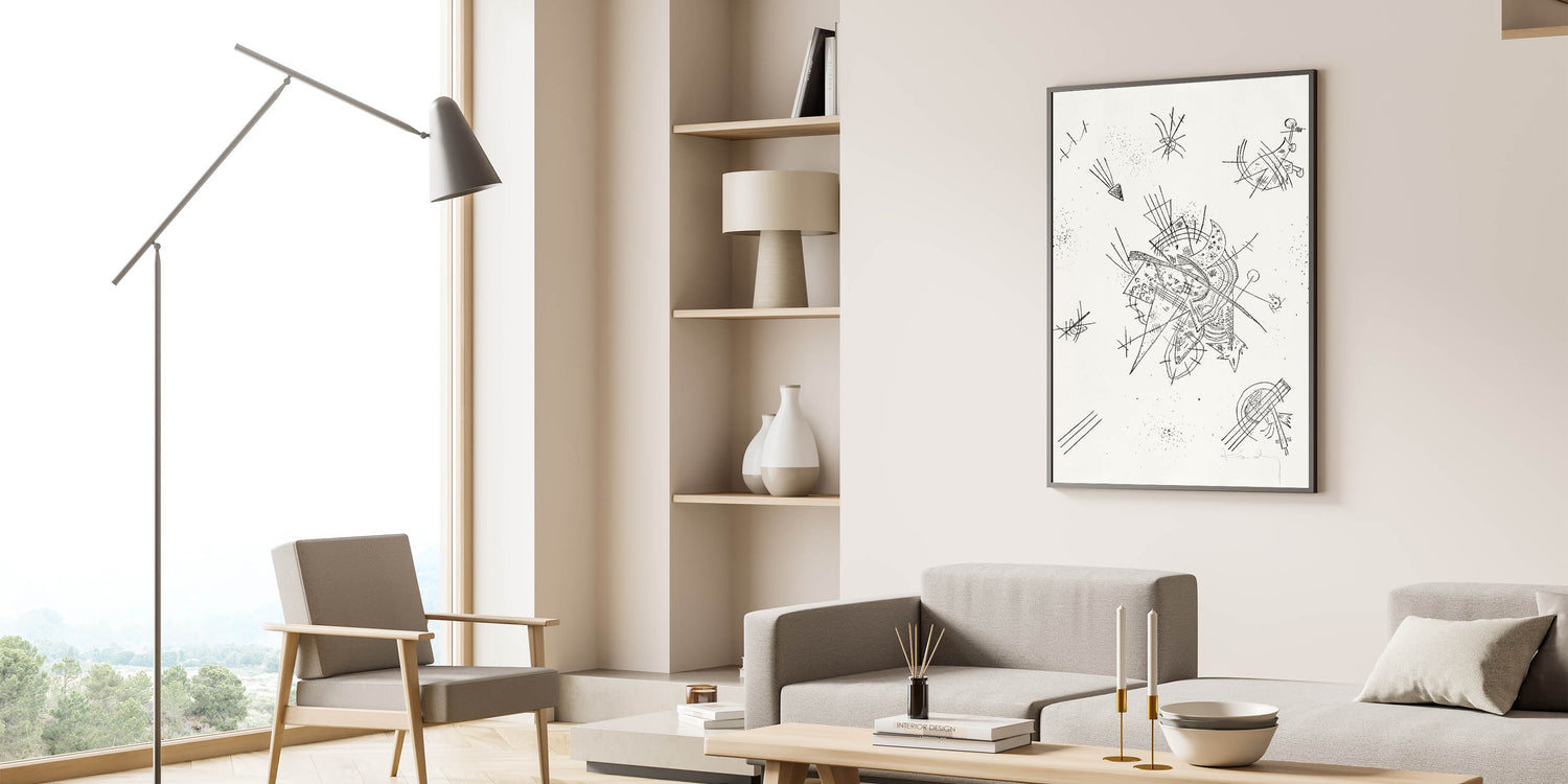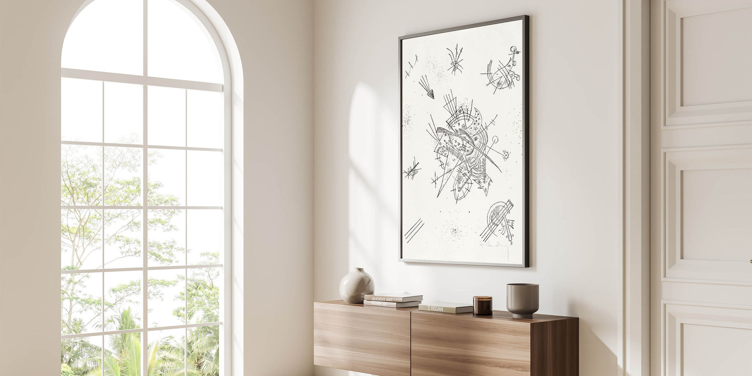 Introduce a touch of modern sophistication to your decor with this Modern Wall Art piece, a delicate and intricate line drawing that exudes a sense of mystery and movement. Inspired by Wassily Kandinsky's work, this artwork is filled with abstract shapes and fine details, making it a perfect choice for Minimalist Modern Decor enthusiasts. The black-and-white design lends itself well to a variety of interiors, from contemporary to classic.