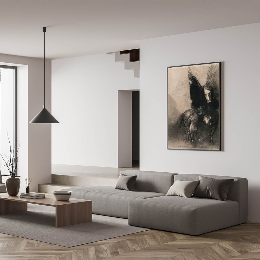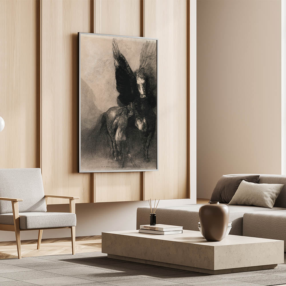 Add an elegant touch of sophistication to your home with this stunning piece of modern wall art, "Pegasus and Bellerophon," a remarkable depiction of mythical beauty and strength. This contemporary art piece features minimalist strokes and a monochromatic palette, perfect for blending seamlessly into trendy home decor. The timeless essence of this artwork makes it ideal for a variety of modern design elements.
