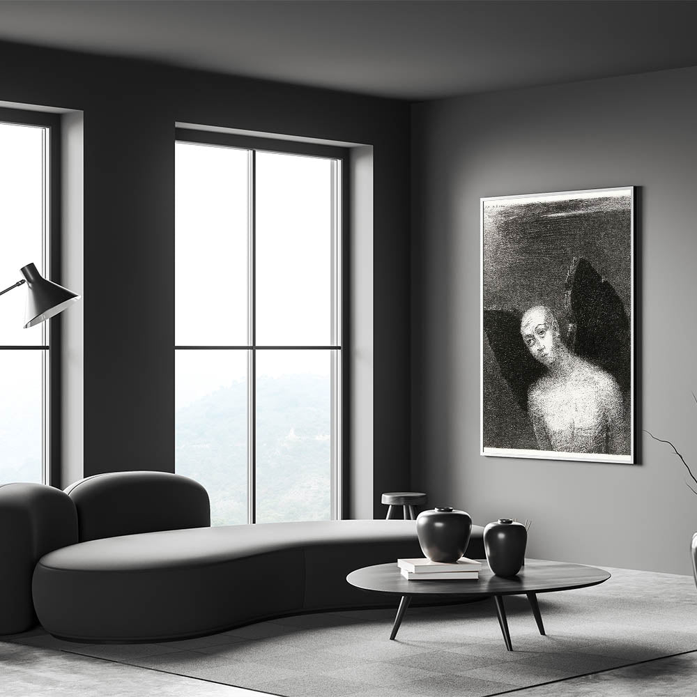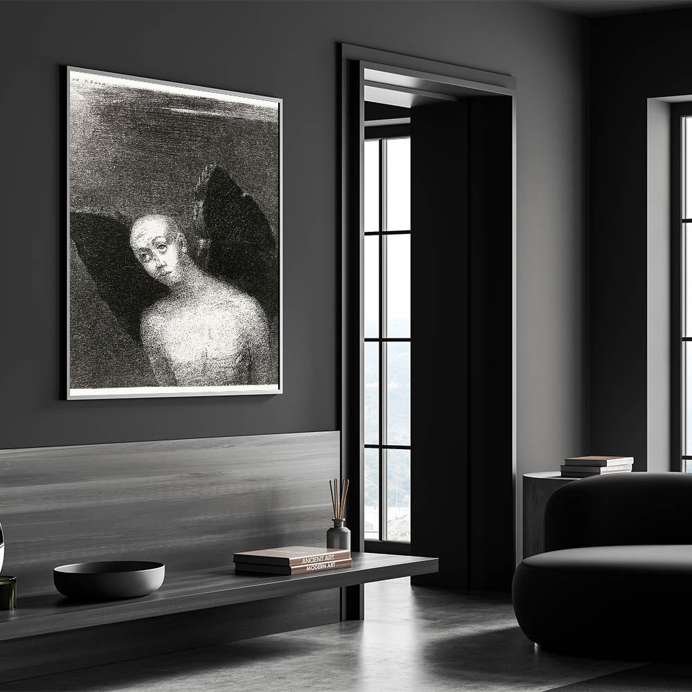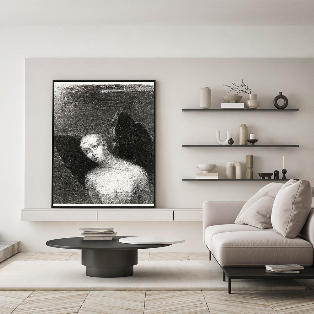 Bring an aura of mystery and introspection to your space with this Modern Wall Art featuring Odilon Redon's haunting piece, The Fallen Angel Spreads His Black Wings. This black-and-white illustration captures a melancholic, surreal figure, evoking both vulnerability and strength. Redon’s expressive use of shadow and light creates a deep, introspective atmosphere, making it a perfect choice for those who appreciate art that challenges and resonates on a profound level.