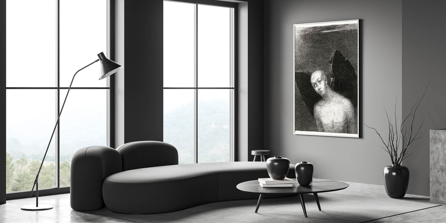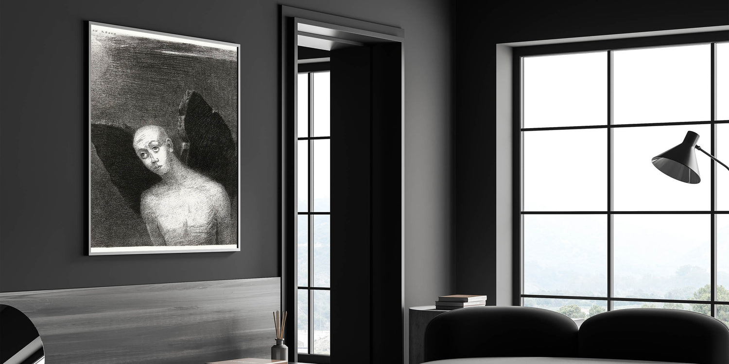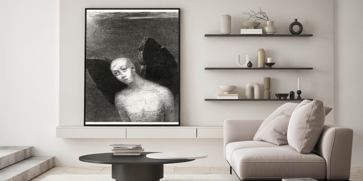 Bring an aura of mystery and introspection to your space with this Modern Wall Art featuring Odilon Redon's haunting piece, The Fallen Angel Spreads His Black Wings. This black-and-white illustration captures a melancholic, surreal figure, evoking both vulnerability and strength. Redon’s expressive use of shadow and light creates a deep, introspective atmosphere, making it a perfect choice for those who appreciate art that challenges and resonates on a profound level.