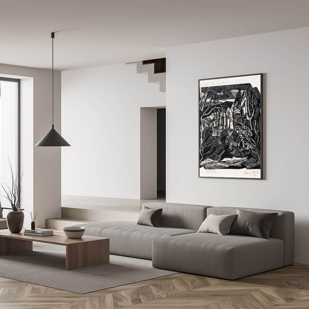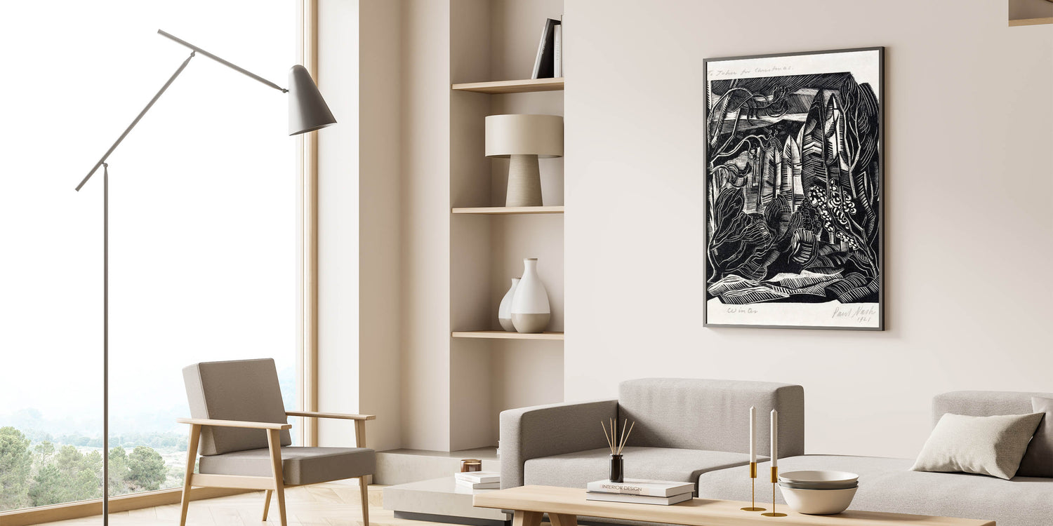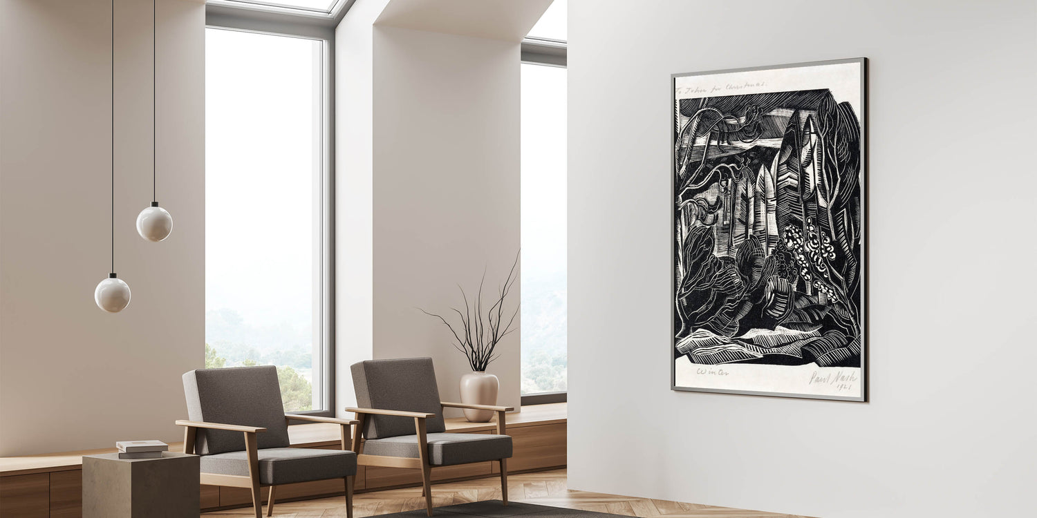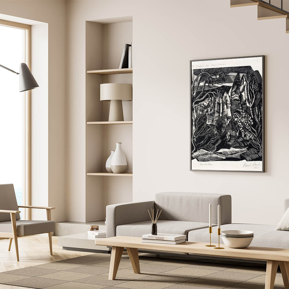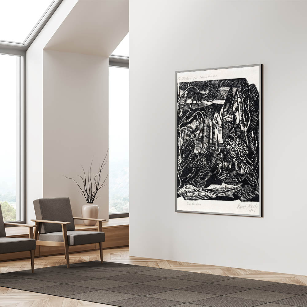 Bring the stark beauty of winter into your space with the "Winter Scene" Modern Wall Art. Inspired by Paul Nash's 1921 piece, this monochromatic artwork features intricate linework and abstract depictions of foliage, creating a timeless representation of a wintry landscape. Its minimalist design is ideal for lovers of modern art with a natural edge.