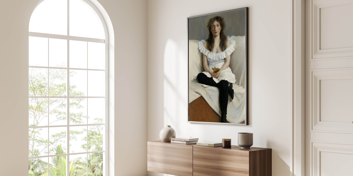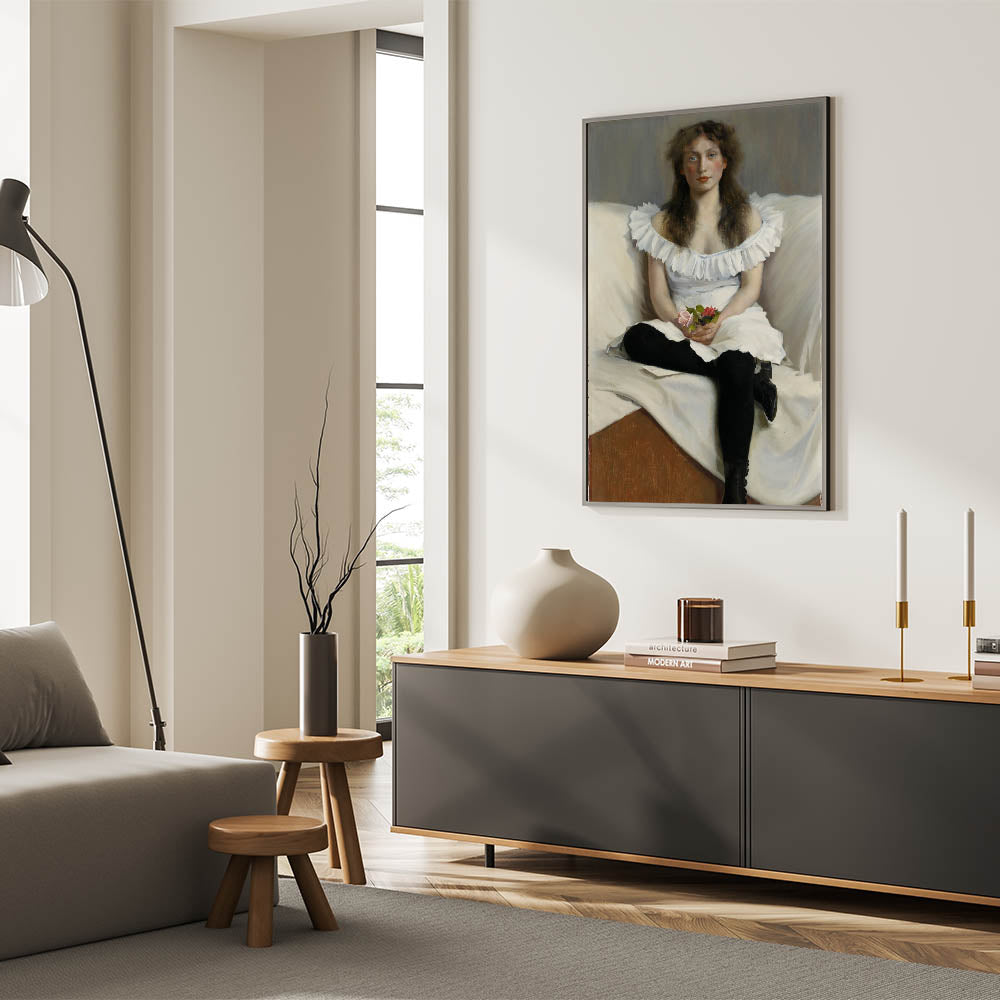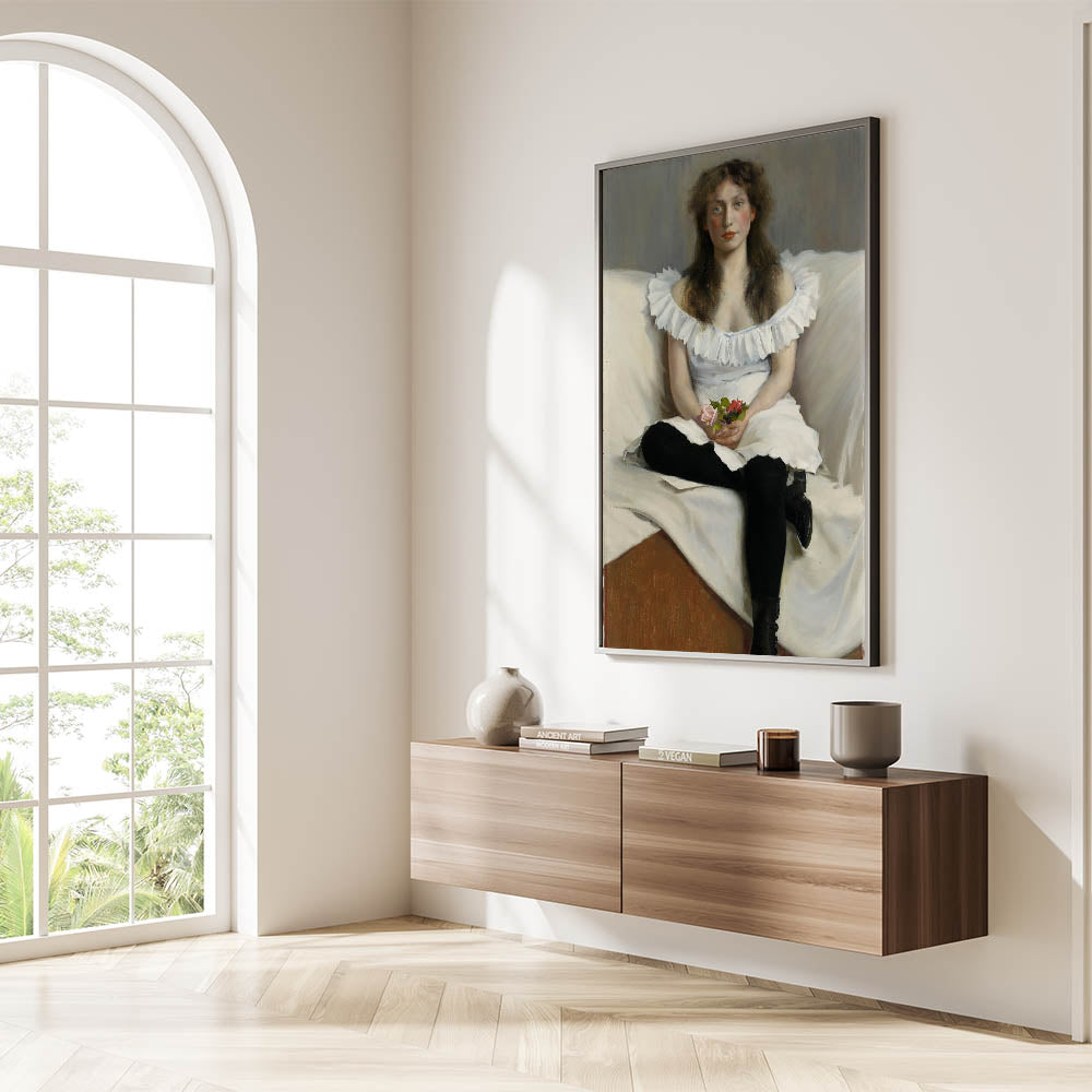 Add timeless sophistication to your home with this captivating Modern Wall Art, "Portrait of a Young Woman in White" by Thorsten Wasastjerna. This elegant artwork, painted in 1893, portrays a serene young woman in a white dress, holding delicate flowers. The subtle play of light and texture highlights her thoughtful expression, evoking a sense of grace and introspection.
