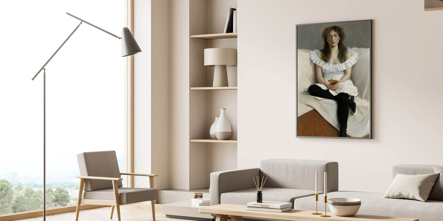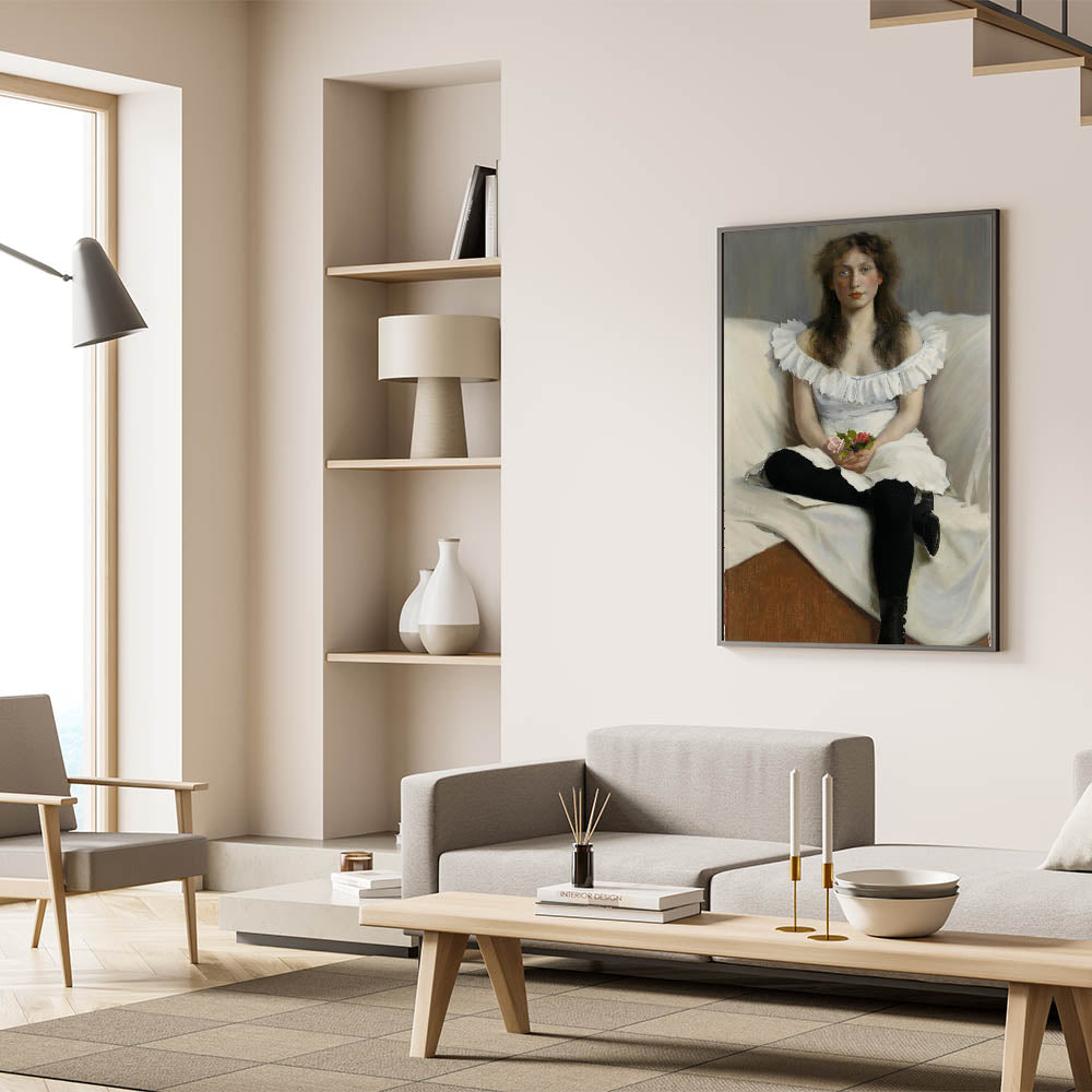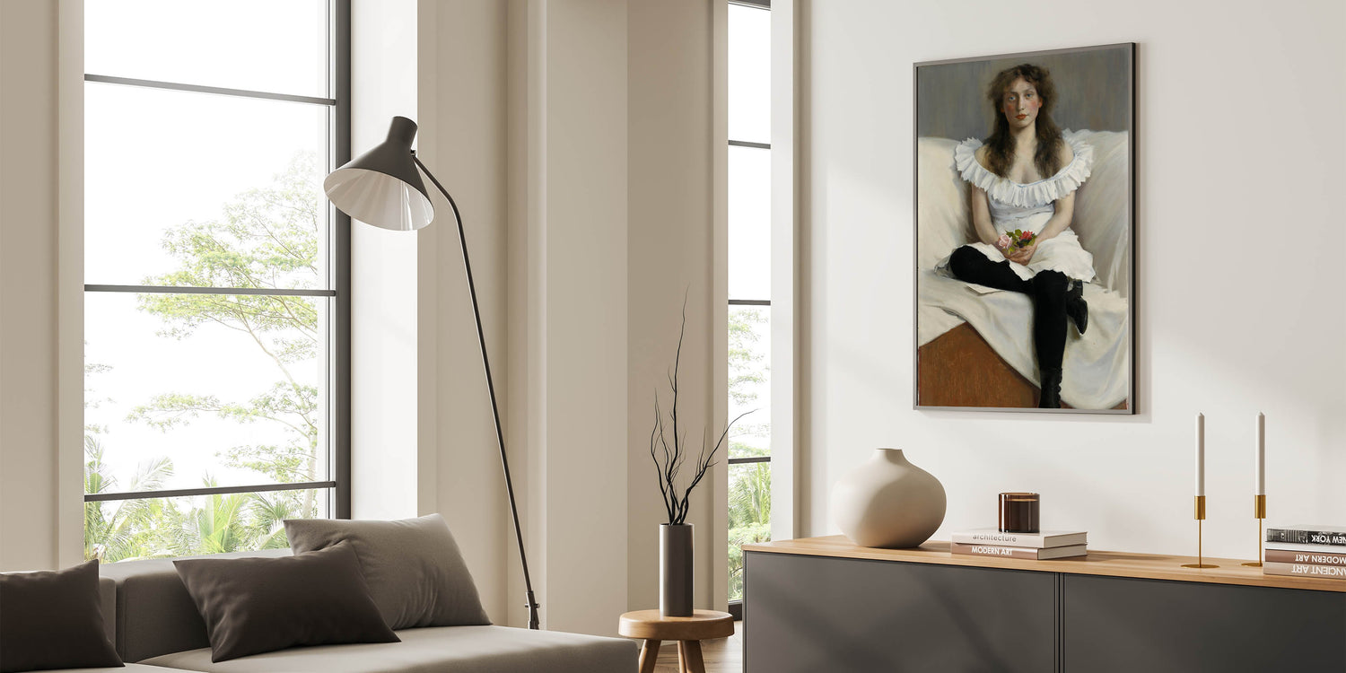 Add timeless sophistication to your home with this captivating Modern Wall Art, "Portrait of a Young Woman in White" by Thorsten Wasastjerna. This elegant artwork, painted in 1893, portrays a serene young woman in a white dress, holding delicate flowers. The subtle play of light and texture highlights her thoughtful expression, evoking a sense of grace and introspection.