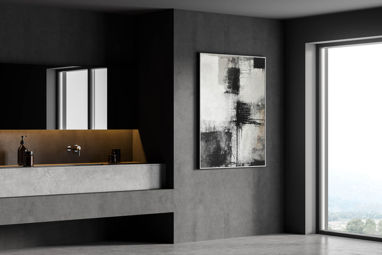 Introduce a bold, minimalist touch to your décor with this striking monochrome abstract artwork. The piece features a dynamic blend of black, white, and gray tones, with rough brush strokes and geometric shapes creating a raw, textured composition. The expressive lines and layered textures give the artwork an urban, industrial feel, perfect for modern and contemporary interiors.